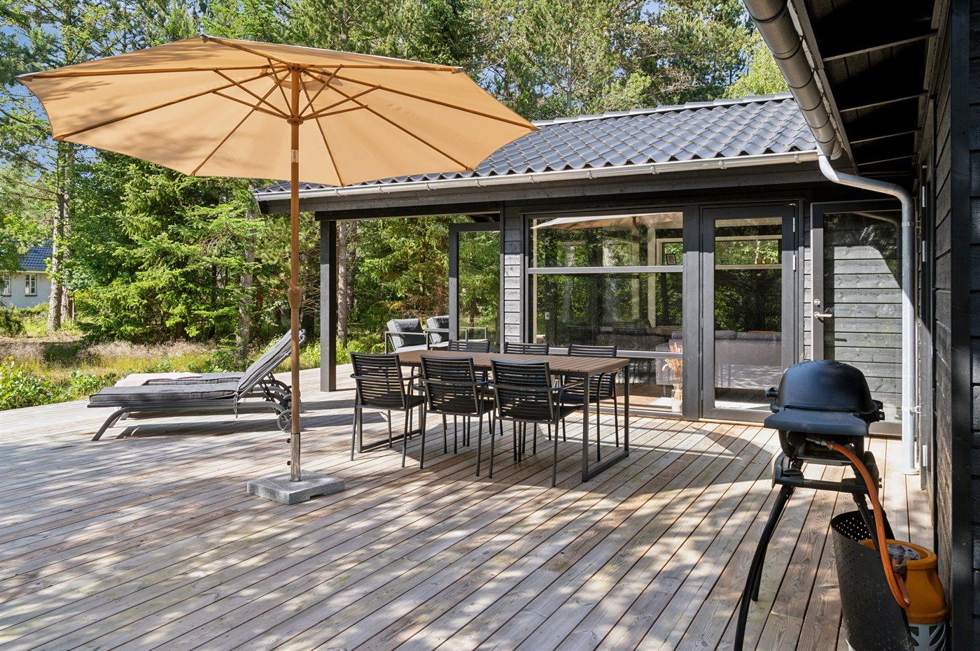 Huset er beliggende på en skøn naturgrund omgivet af bevoksning og træer, og udenfor kan sommeren nydes på det store terrasseområde, hvor en del er overdækket.