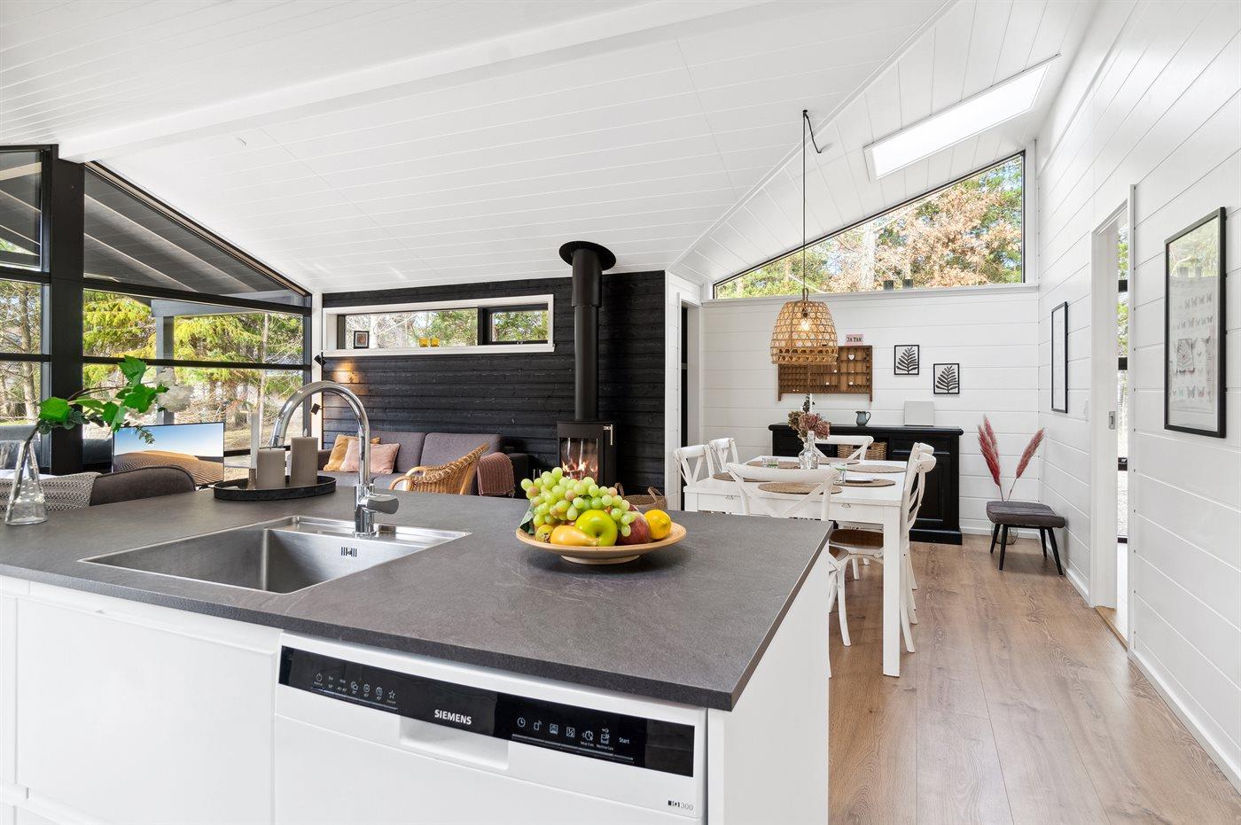 Køkkenet er udstyret med 1 køleskab. Der er 4 induktionskogeplader, varmluftovn samt opvaskemaskine.