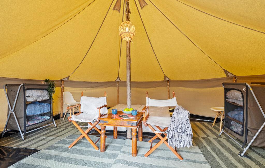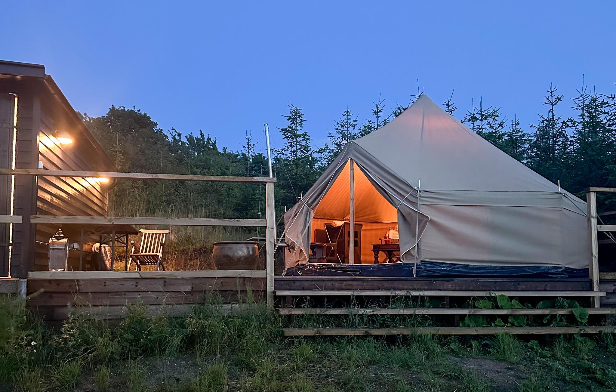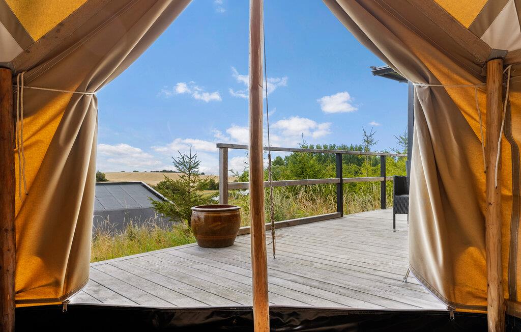Hvis I drømmer om en ferie ved vandet og tid til en masse udendørsoplevelser, er dette glampingtelt det rette valg. Her kommer I til at bo i skovbrynet med en betagende udsigt over marker, hav og solnedgang, og teltet er godt indrettet til feriens behov. Efter en aktiv dag kan I hygge jer ved brændeovnen og nyde at være tæt på naturen.