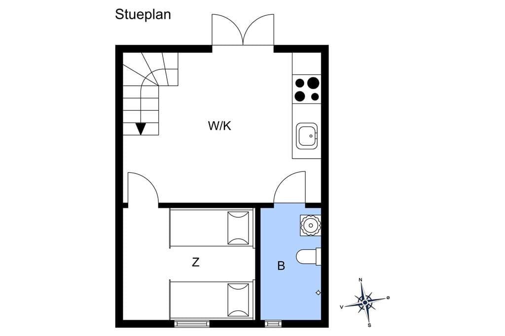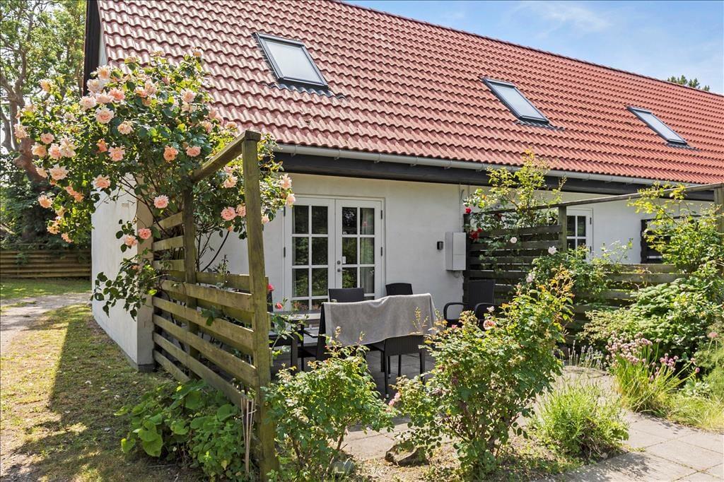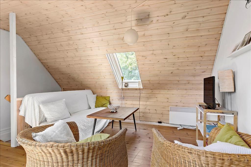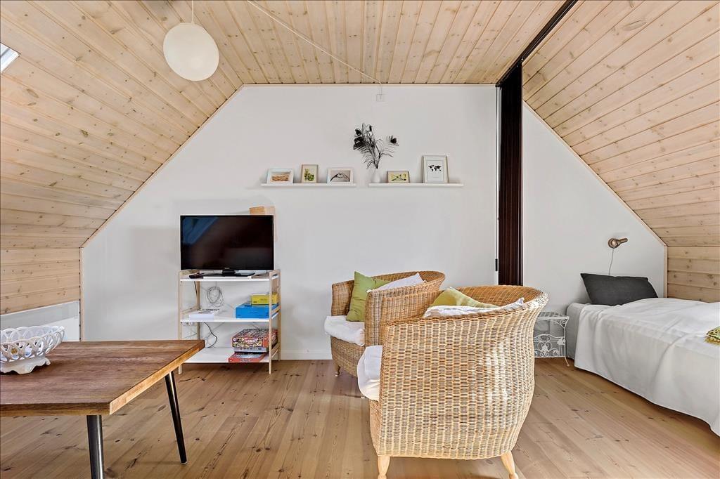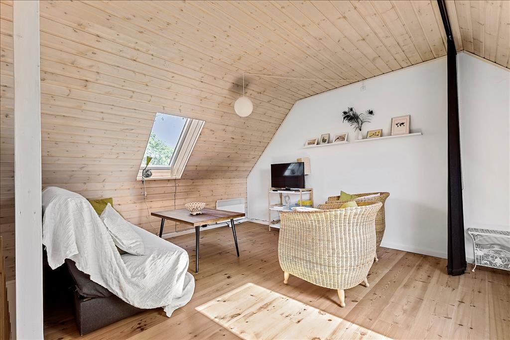 Lejligheden som ligger ved siden af 4 andre ferielejligheder: Den er i 2 plan. I stueetagen er der køkken/alrum, badeværelse, soveværelse med dobbeltseng, samt udgang til terrasse. Køkkenet indeholder køleskab, indbygget ovn og to kogeplader. På 1. sal er der hyggekrog med sofa og kurvestole, tv og to enkeltsenge (soveafdeling kan skilles fra med lamelgardin). Fra vinduet på 1 sal er der en skøn udsigt til vandet. Der er de danske DR TV-kanaler til rådighed. Lejligheden opvarmes med varmepumpe og elvarme.