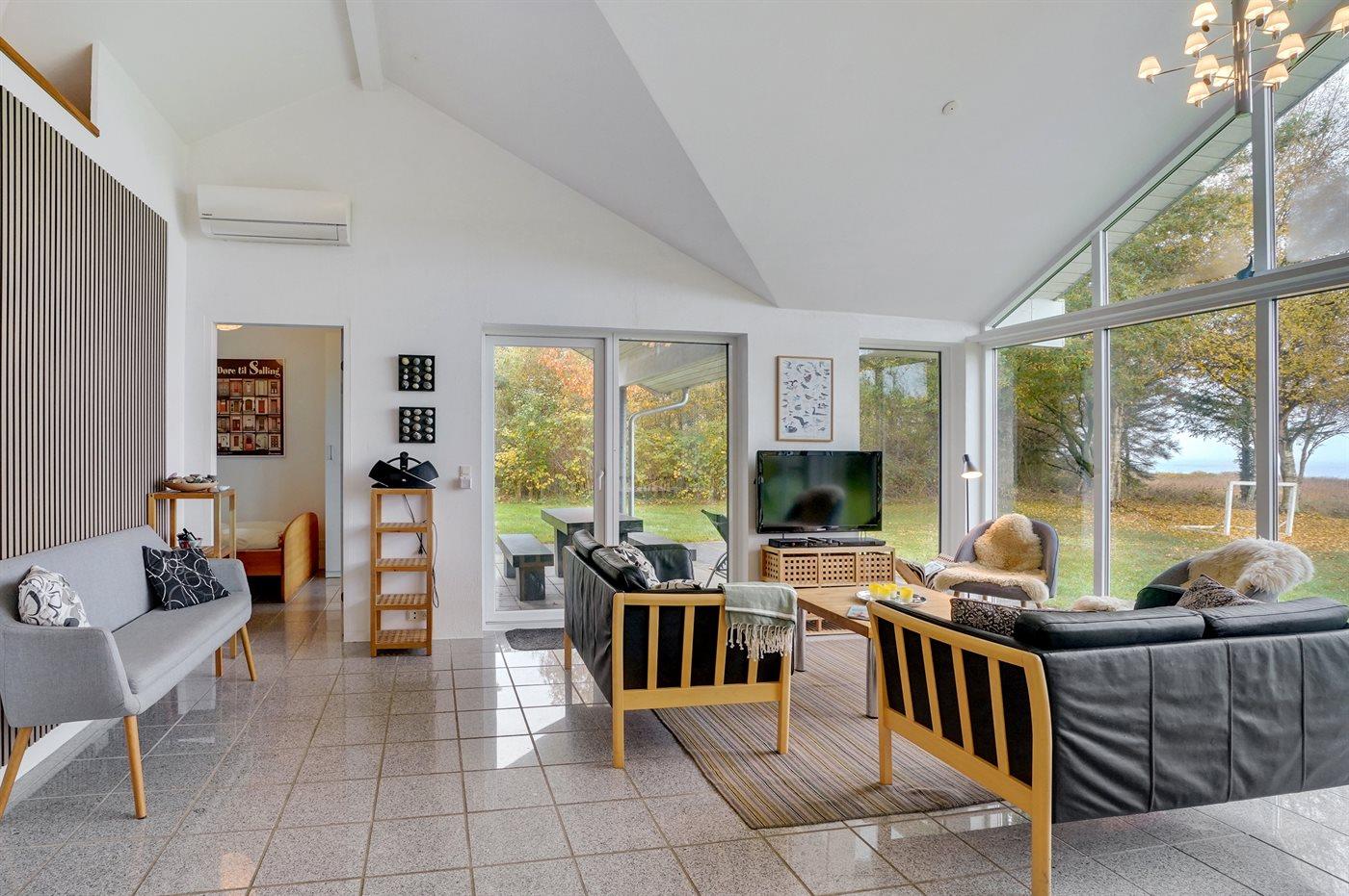 Arkitekttegnet sommerhus ved Limfjorden med panoramaudsigt, store udendørsarealer og unik sandkasse til børn.