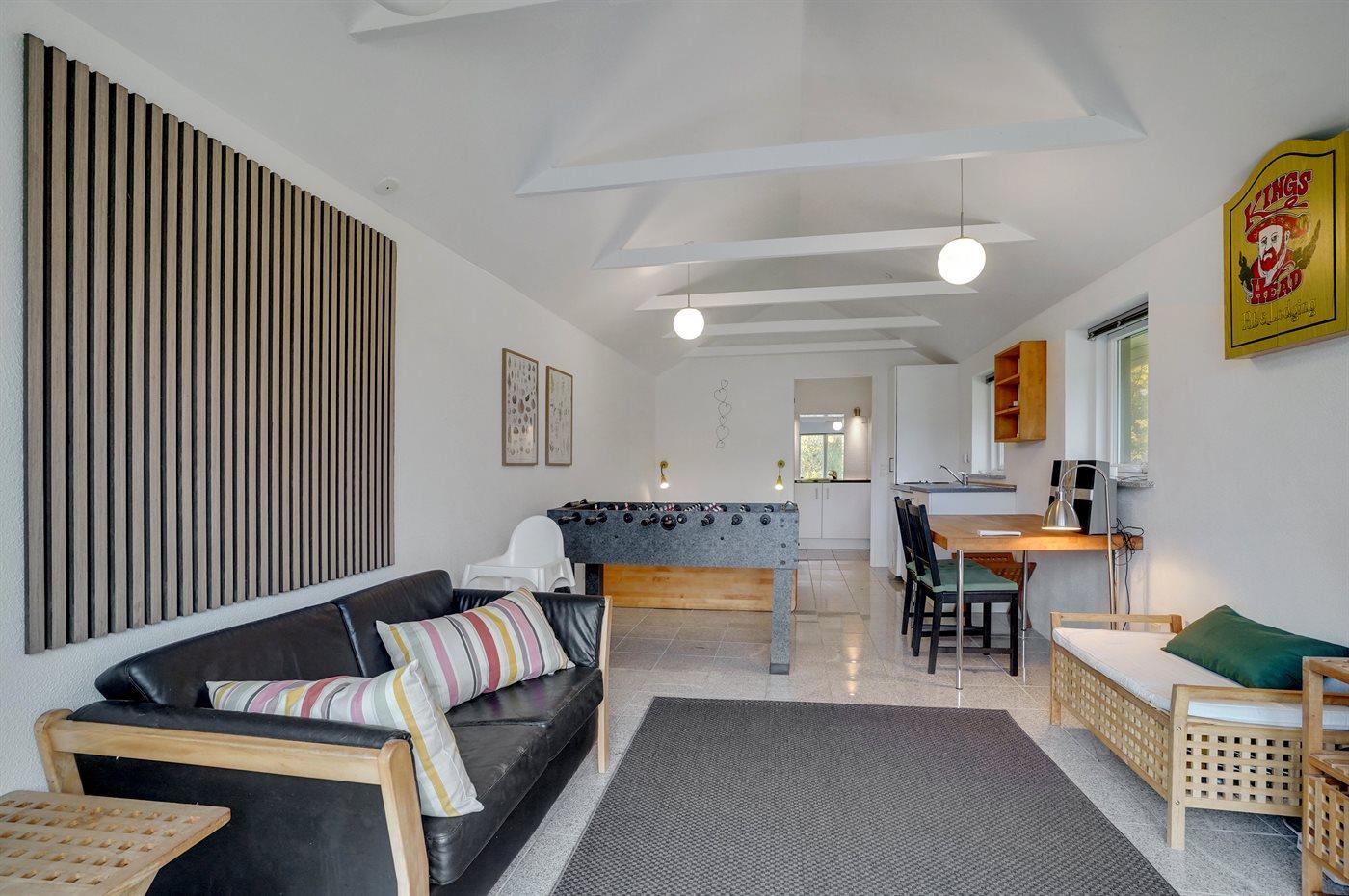 Annekset er velegnet til to unge mennesker og indeholder tekøkken, badeværelse med bruseniche, vaskemaskine og tørretumbler, 3/4 seng, en lille sofa, bord og et bordfodboldspil.