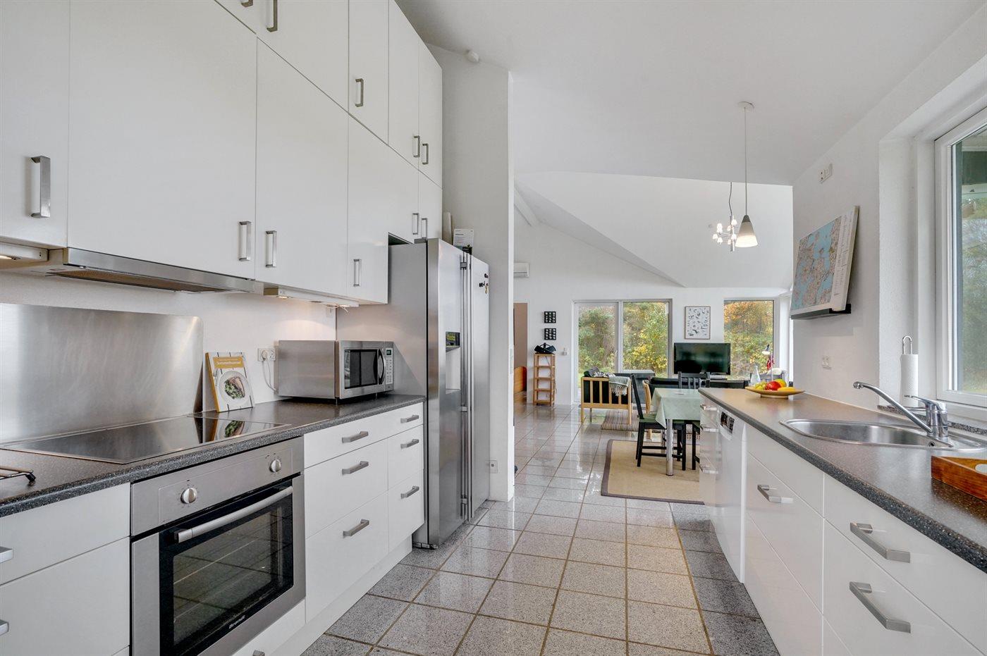 Selve huset indeholder en dejlig stue med brændeovn, TV med digital parabol, Chromecast, musikanlæg samt trådløs internetforbindelse. Køkken med varmluftovn, mikrobølgeovn, opvaskemaskine, komfur med keramiske kogeplader, og køleskab med fryser og isterningmaskine. To badeværelser med bruseniche, det ene desuden med en topersoners spa. Tre soveværelser med dobbeltsenge. Fra stuen en trappestige op til en høj hems med madrasser - kan bruges som ekstra sovepladser til op til fire store børn. Fra stuen, køkkenet og alle værelserne er der direkte udgang til terrasser. Hvide vægge og lofter samt stor loftshøjde bevirker, at huset er behageligt at opholde sig i.