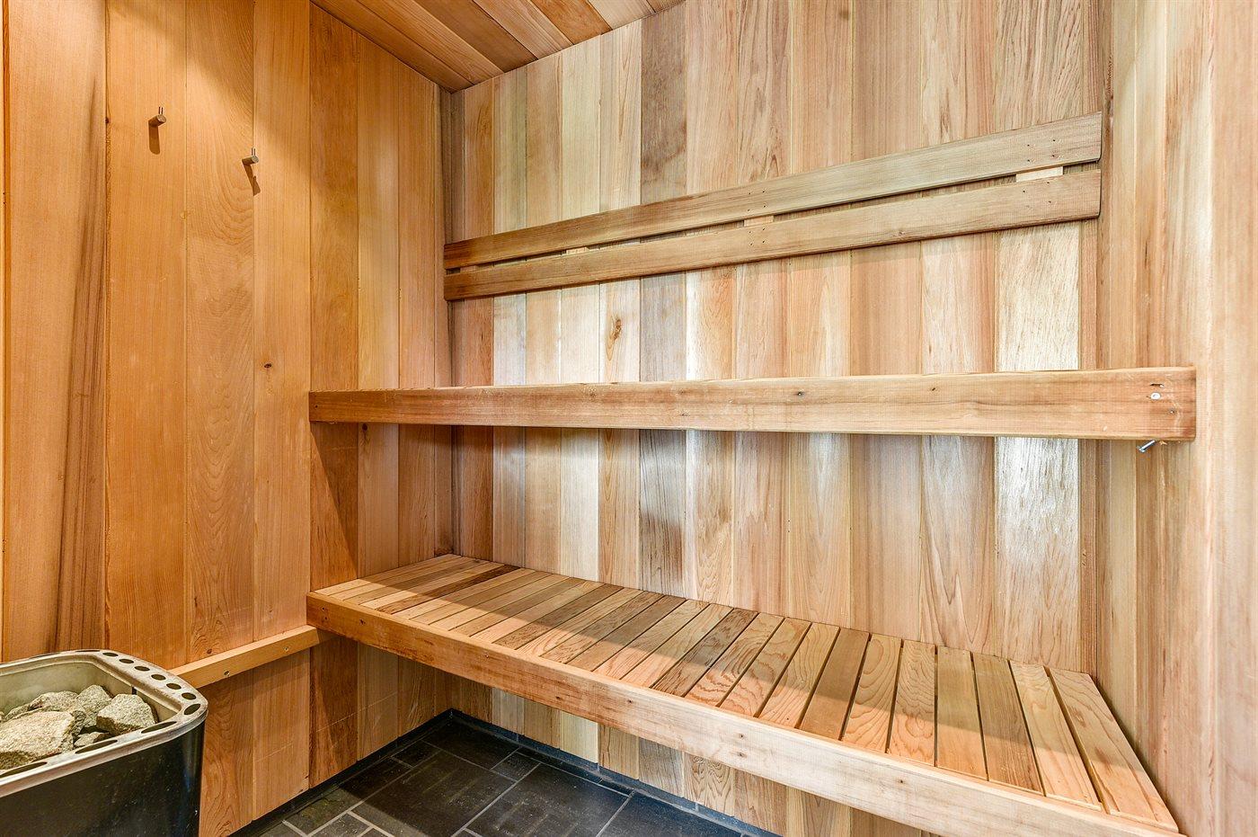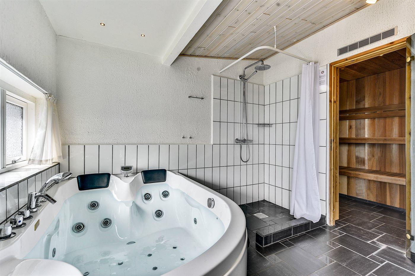 Der er 2 badeværelser med bruseniche og 2 toiletter. Der er gulvvarme på 2 badeværelser. I saunaen er der mulighed for afslapning.