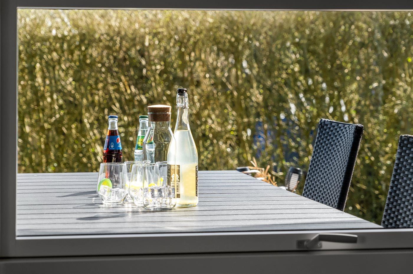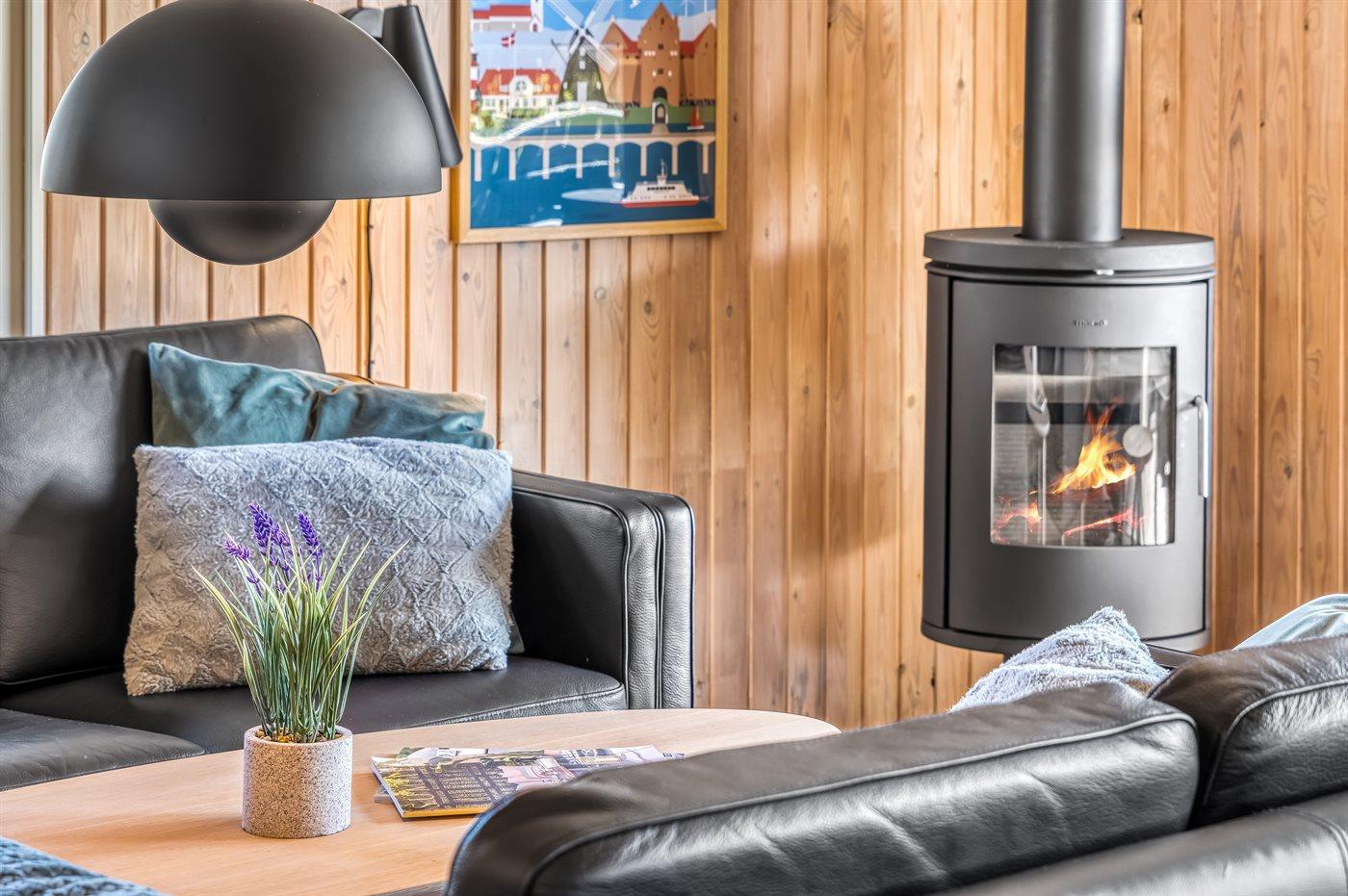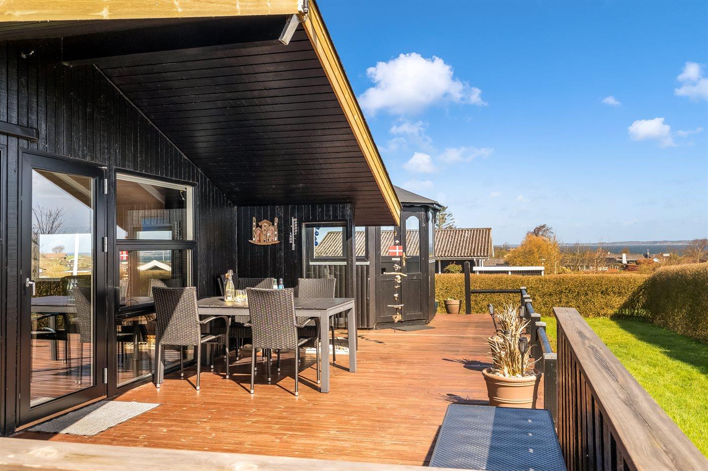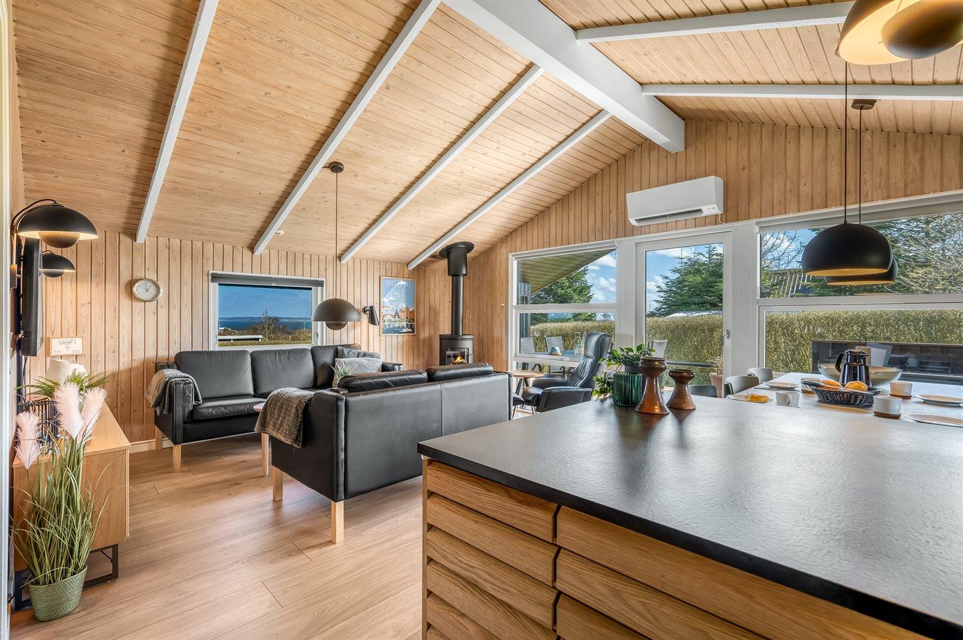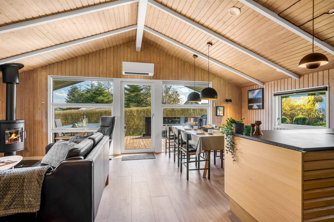 Lyst og moderne sommerhus ved Limfjorden med udsigt, terrasse og brændeovn, perfekt til en fredelig ferie.