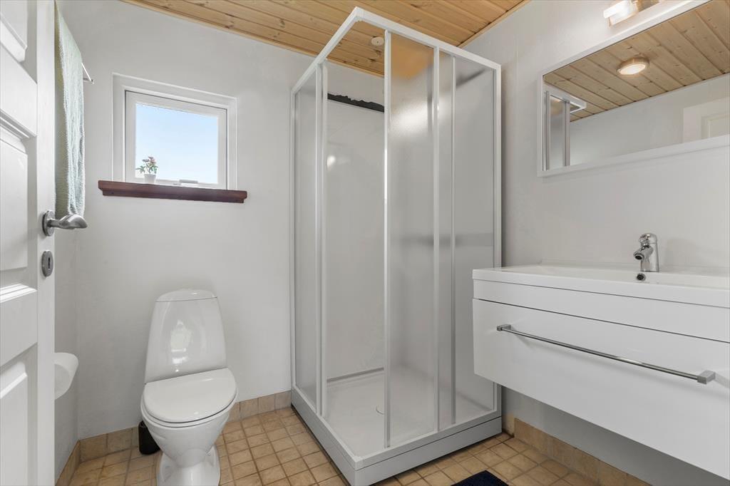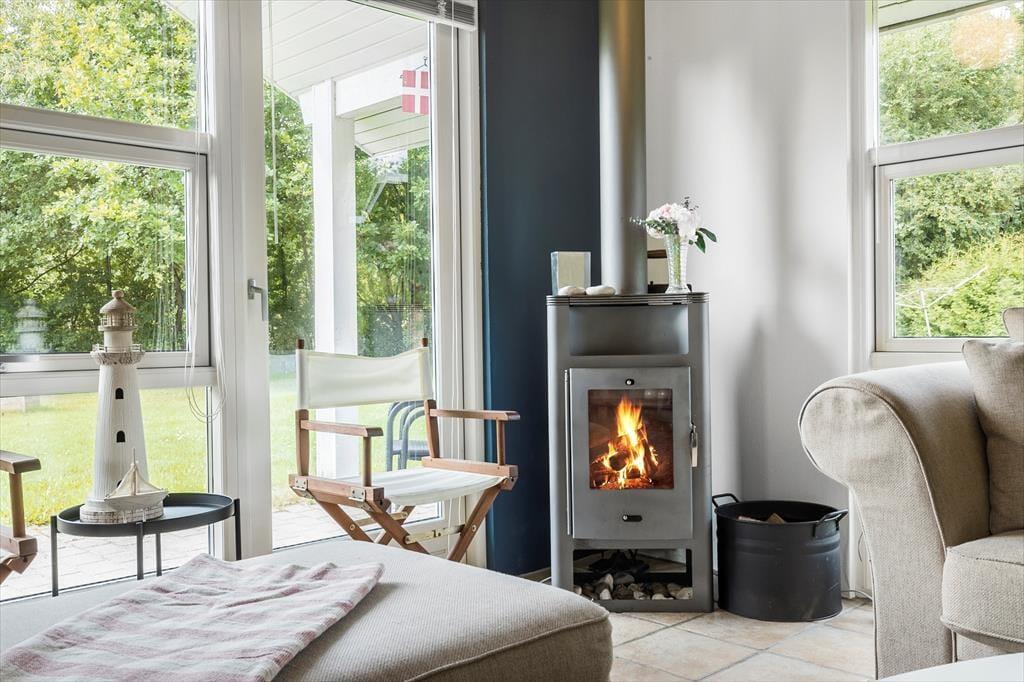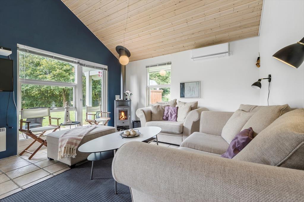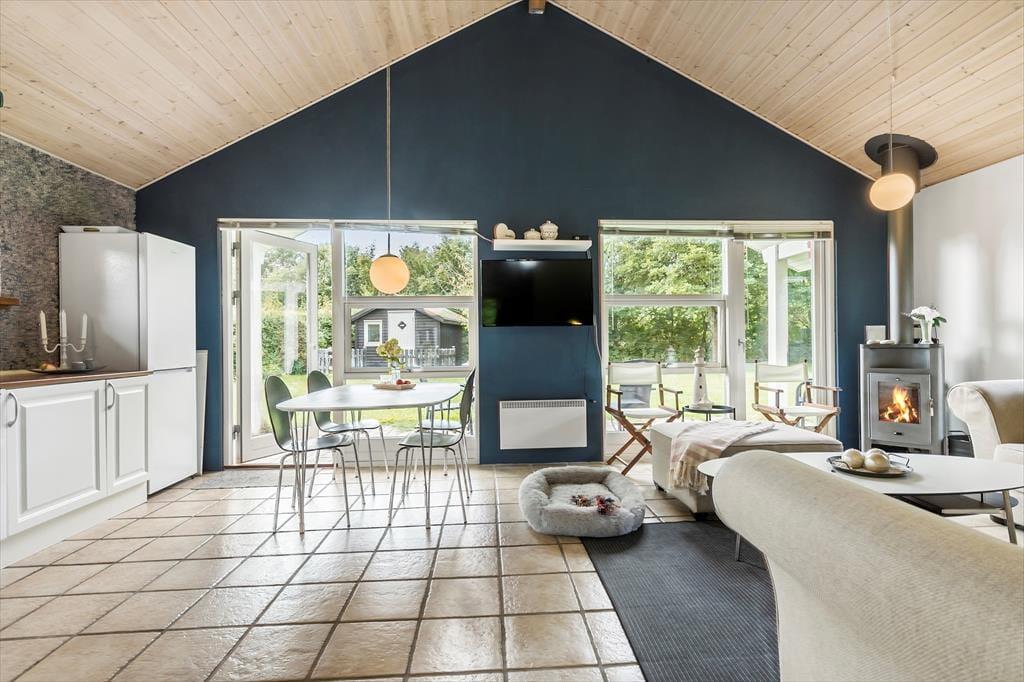 Velkommen indenfor i et velholdt sommerhus, hvor loftet åbner sig højt over dig, og de store vinduer skaber en glidende overgang mellem stuen og terrassen og videre til haven. Her lyser det naturlige dagslys rummene op, og klinkegulvene, der går igen i hele huset undtagen i soveværelserne, gør det let at holde rent – perfekt til både børn og hund.