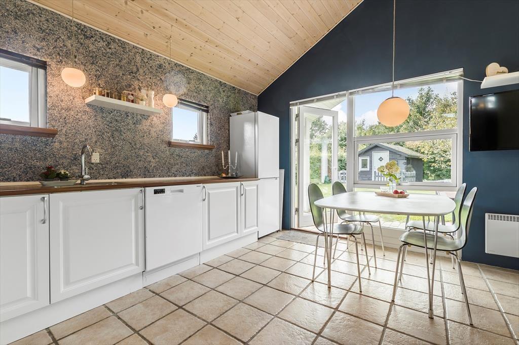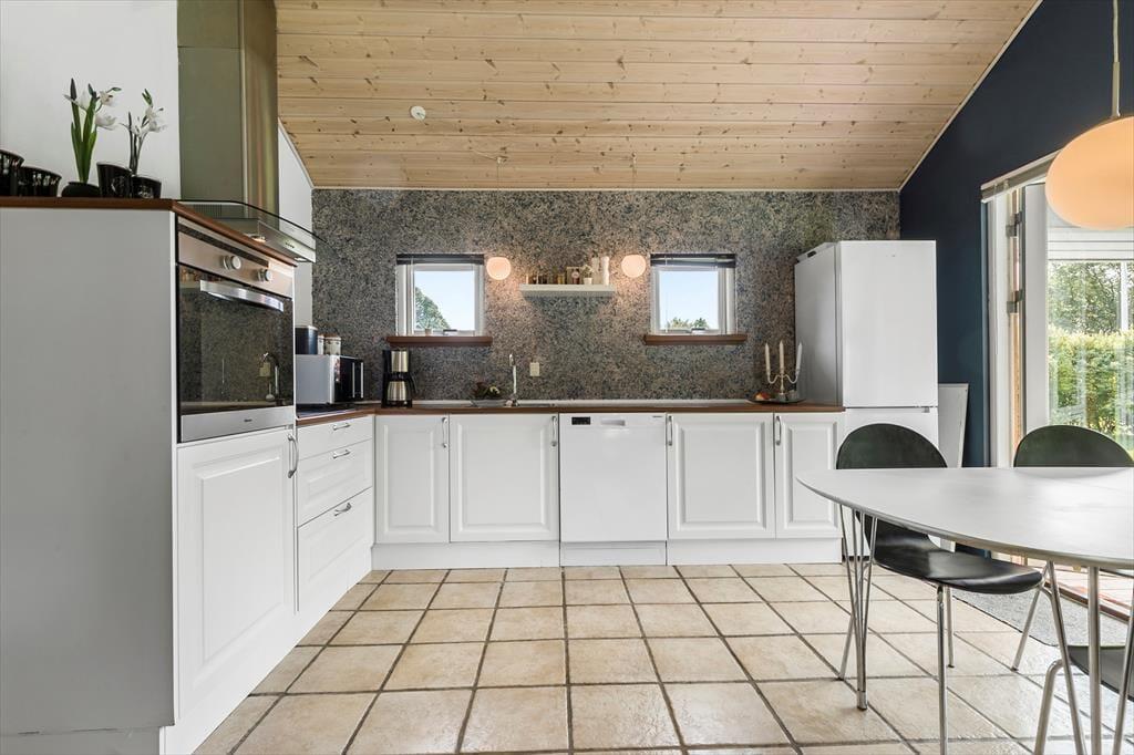 Køkkenet er en fryd for øjet med sit elegante tapet og godt køkkenudstyr. Her kan du nyde at tilberede lækre feriemåltider, mens du holder øje med børnenes leg i stuen eller taler med din bedre halvdel, der hviler sig ved brændeovnen. Den åbne planløsning sikrer, at alle er en del af hyggestunden.