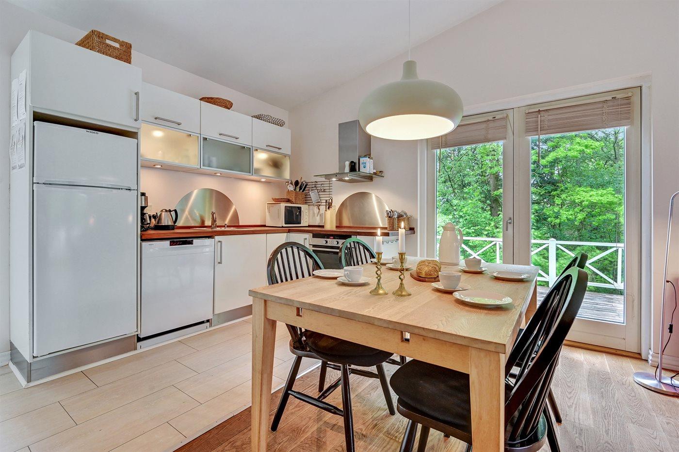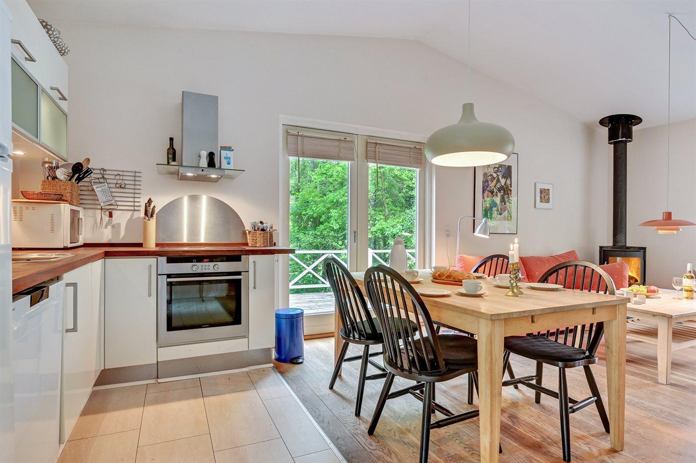 Køkkenet er udstyret med 1 køleskab. Der er 4 keramiske kogeplader, varmluftovn, mikrobølgeovn samt opvaskemaskine.