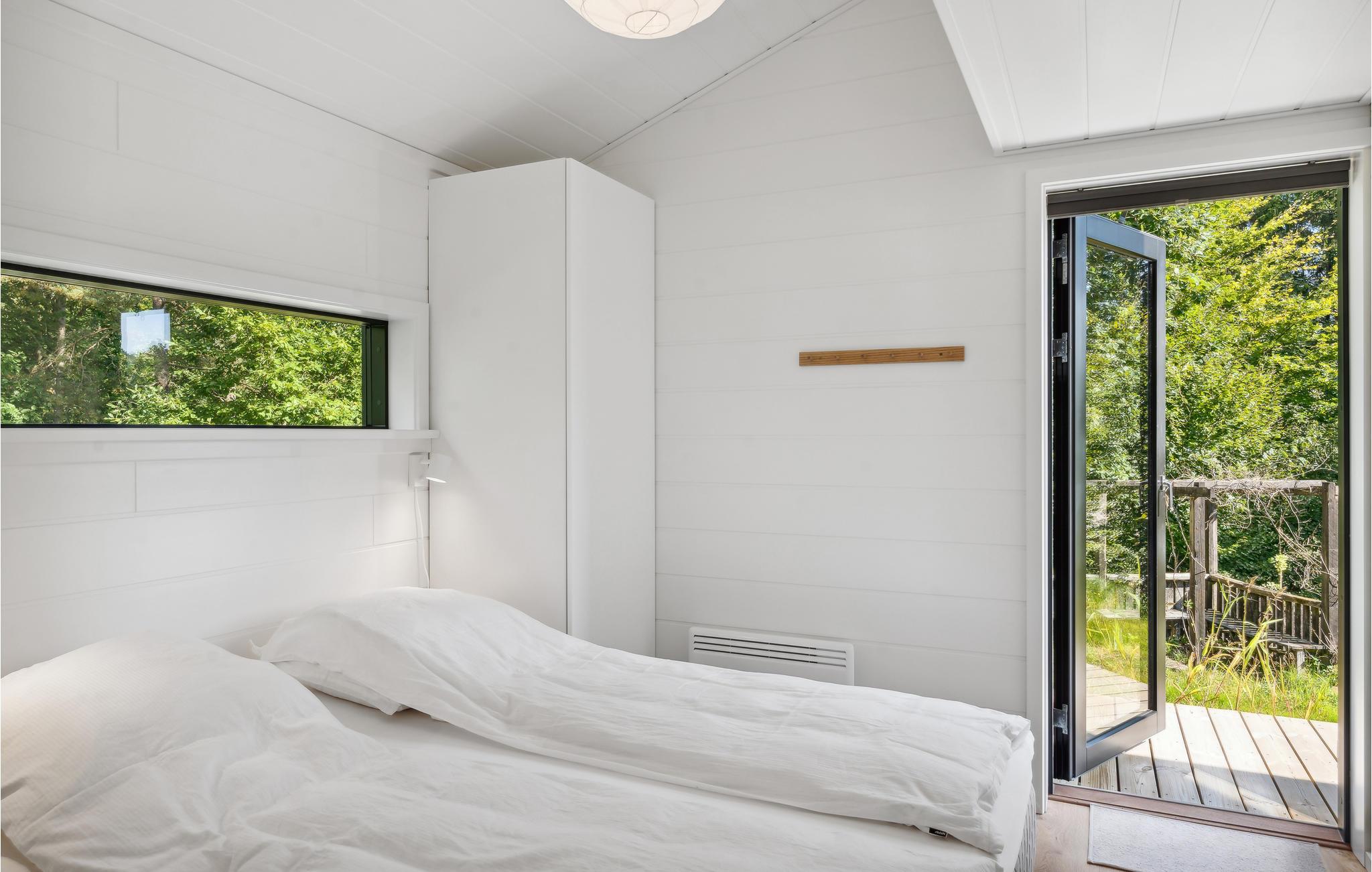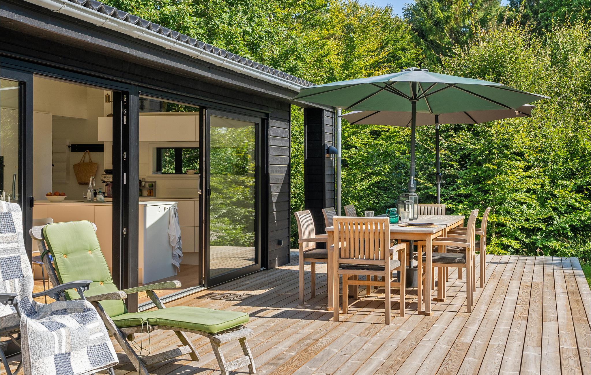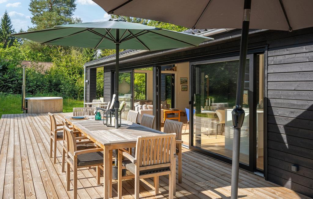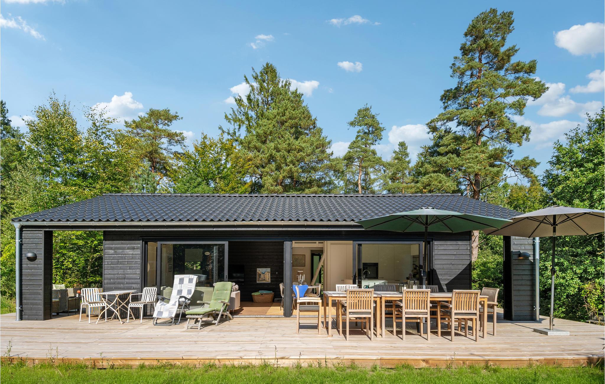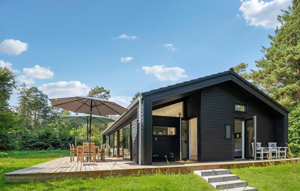 Tilbring en dejlig familieferie i dette moderne og attraktive feriehus. Her vil I uden tvivl føle jer hjemme, og i den store stue venter sjovt samvær og nærvær. Herfra har I ikke kun en fantastisk udsigt over haven gennem panoramavinduerne, men I kan også fremtrylle lækre retter i det åbne køkken eller hygge jer med en god film og snacks om aftenen. Den store træterrasse bliver jeres anden stue og indbyder til solbadning, grillaftener og afslappet tilbagelænen med en drink i hånden. Lyt til fuglenes sang fra trætoppene, mens I mærker roen i vildmarksbadet, og se jeres børn lege gemmeleg i haven.