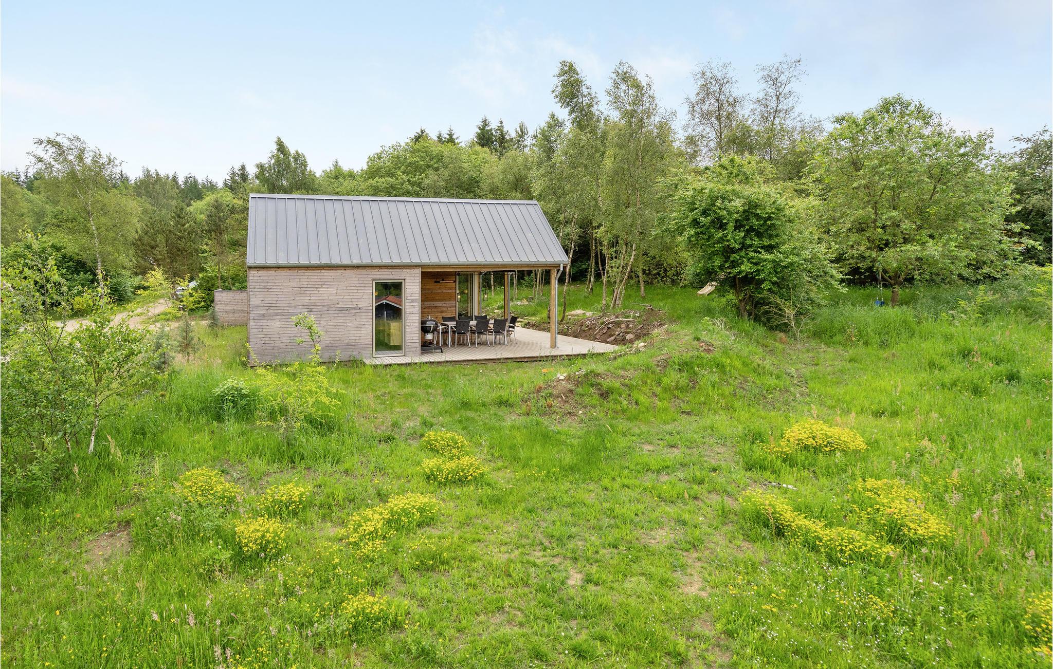 Moderne sommerhus nær Silkeborg med udsigt, terrasse, legeplads og mulighed for udendørs aktiviteter.