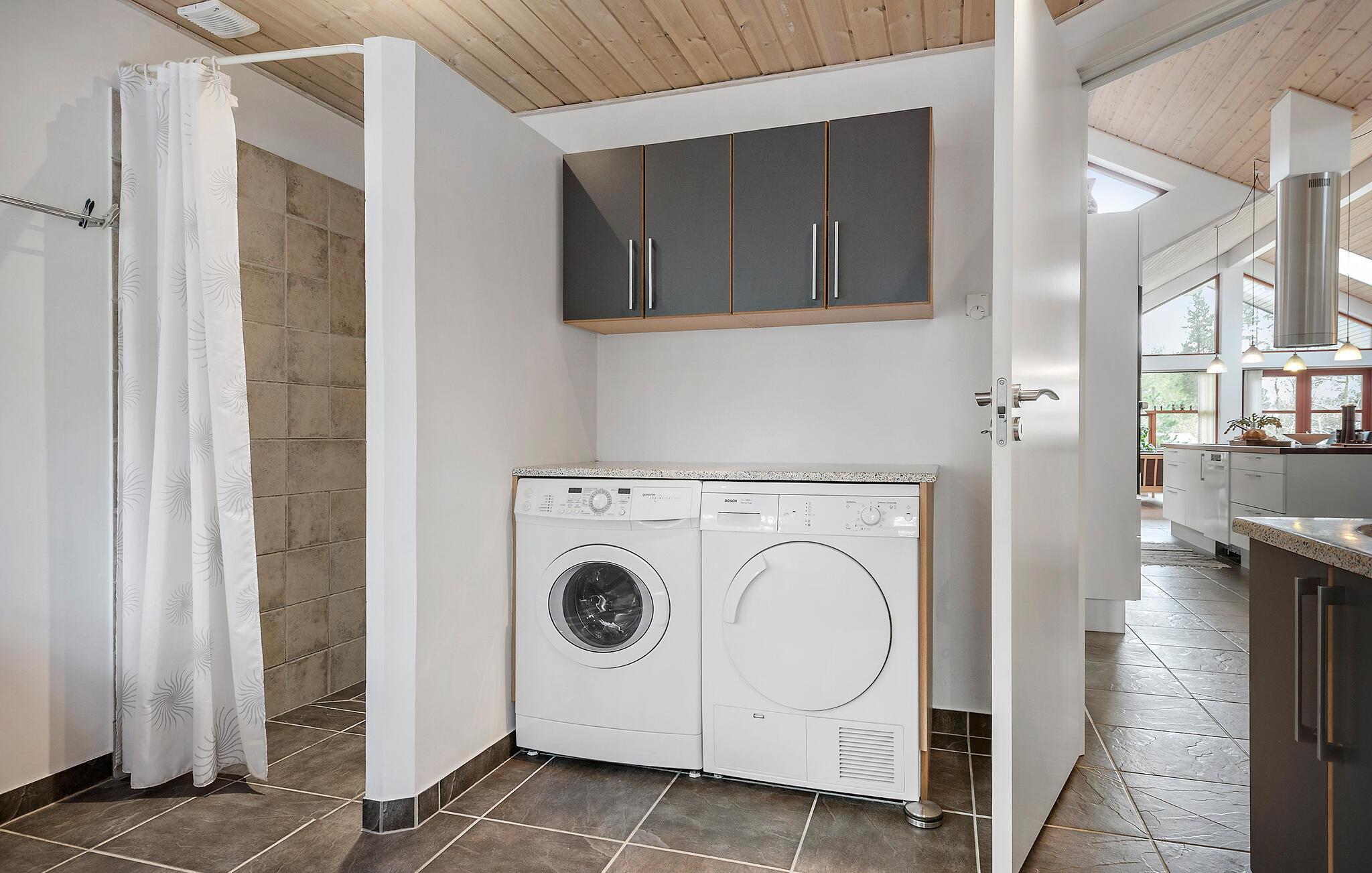Nyd godt af indretningen, der præges af et åbent boligkoncept med loft til kip og mange fine faciliteter, der gør hverdagen her til en leg. Tænd op i brændeovnen og hyg jer med madlavningen, som børnene kan bidrage til fra højstolene ved køkkenøen. Efter aftensmaden kan I rykke over i stuen med brætspil eller en god film på tv'et, og skal det gøres lidt ekstra lækkert, kan I runde aftenen af med en tur i boblebadet, måske med en god drink?
