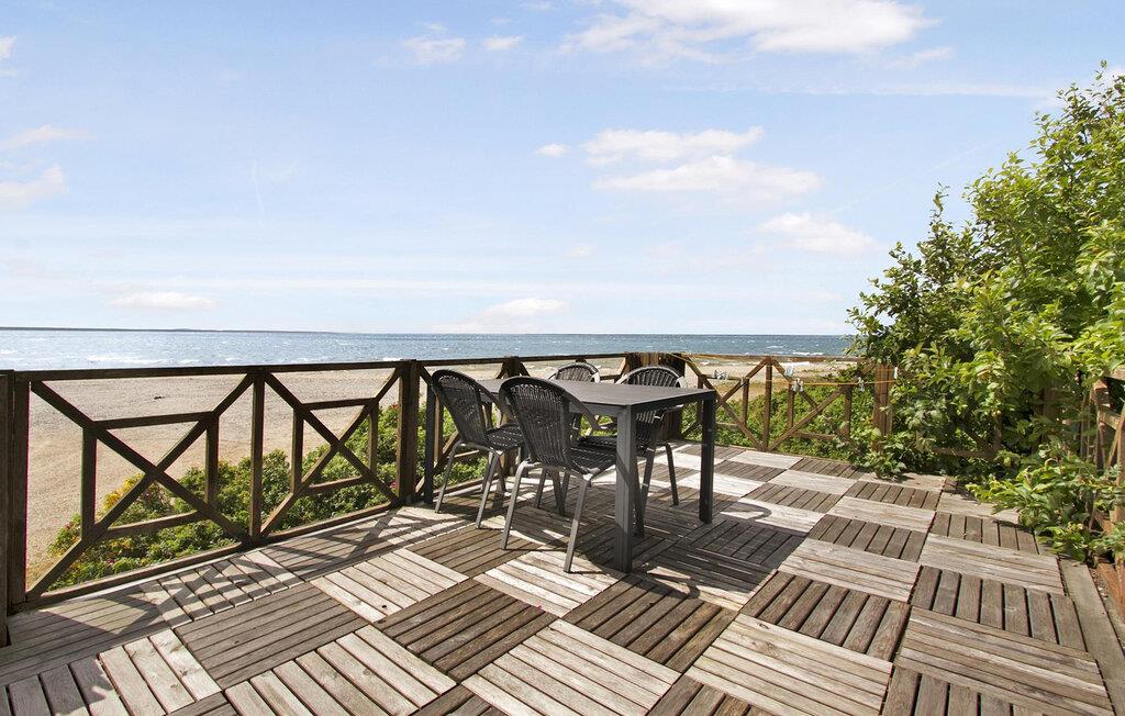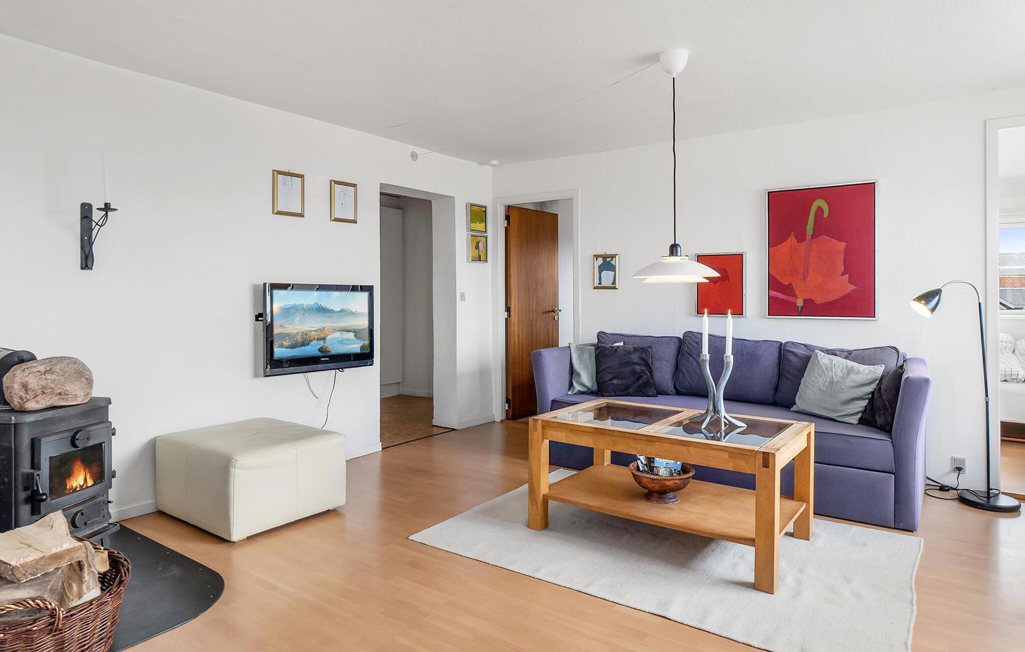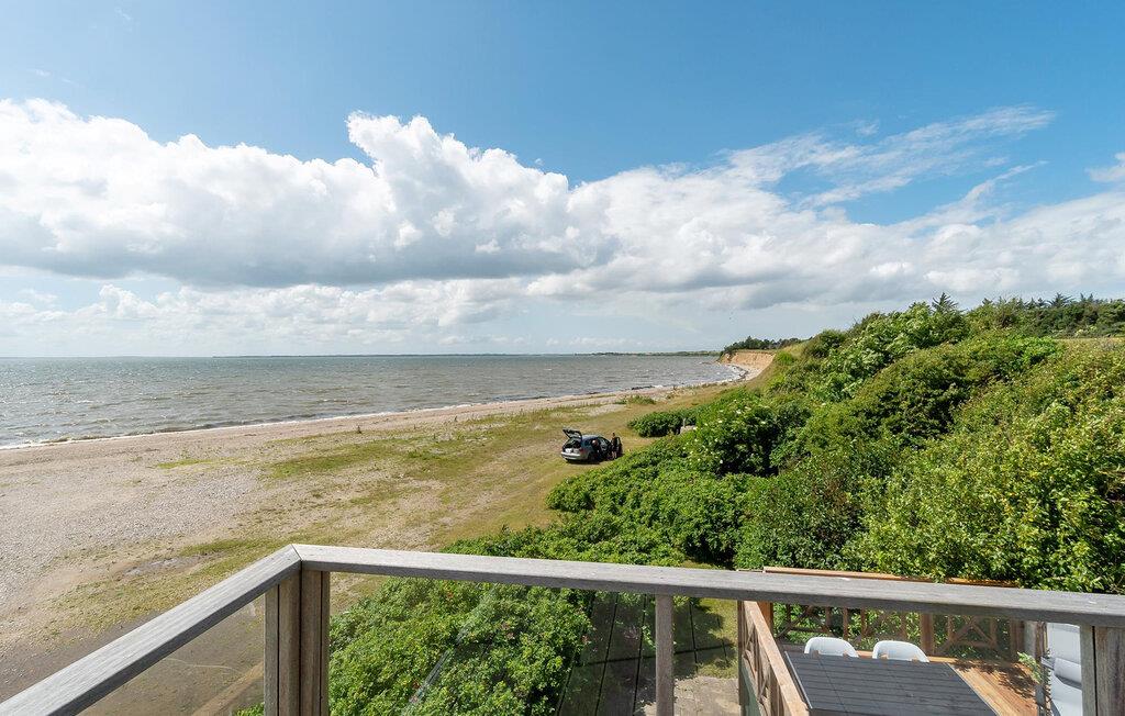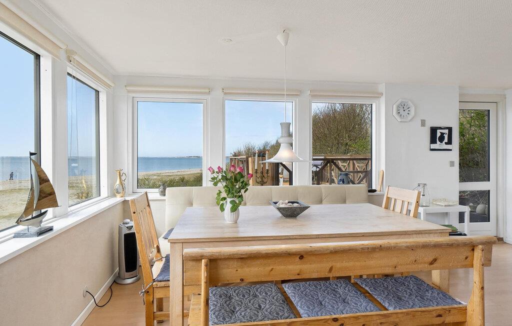 Glæd jer til nogle fredfyldte dage i dette sommerhus, som er ideelt til afslappende timer med familien. Her kan I se frem til en beliggenhed lige ud til stranden og husets åbne atmosfære med vidunderlig udsigt over fjorden. Træd ind i den smagfulde opholdsstue med brændeovn, komfortabelt sofahjørne og TV, hvor I kan læne jer godt tilbage efter en aktiv dag. Den store spiseplads er husets hjerte. Her bliver hvert måltid en oplevelse, for panoramaudsigten over vandet er forrygende.
