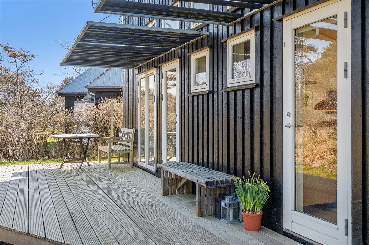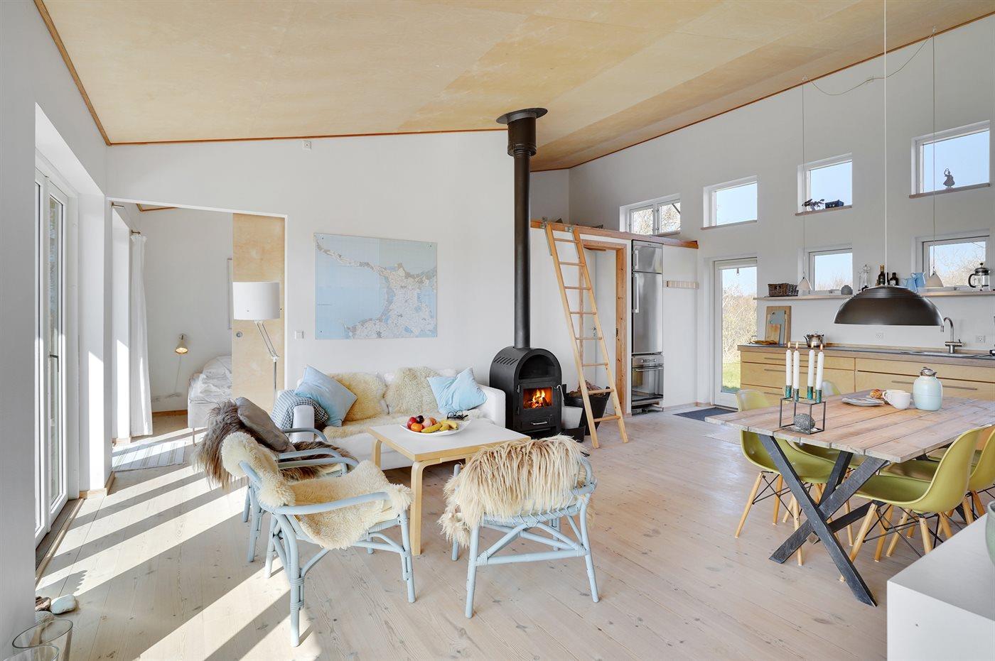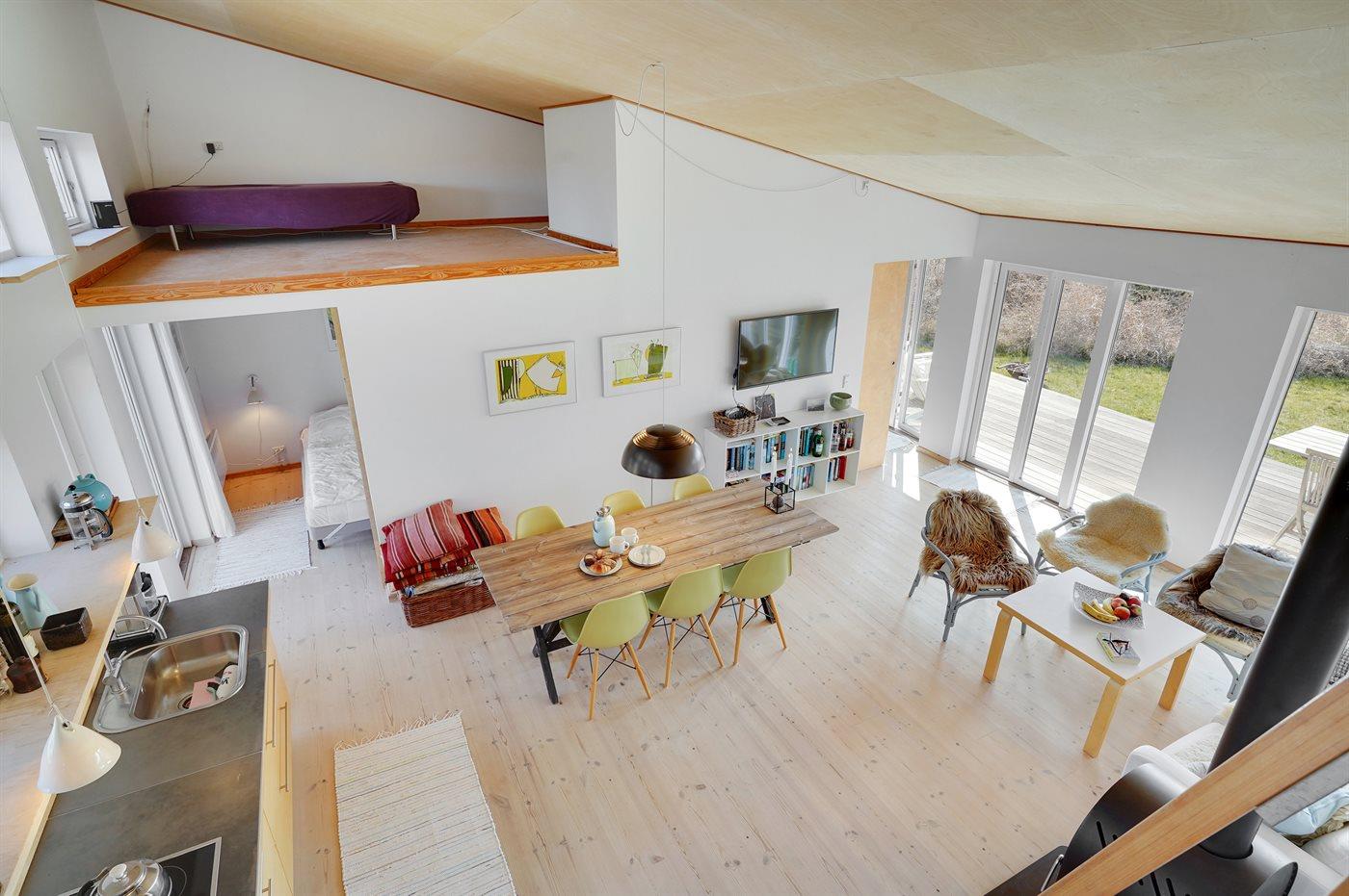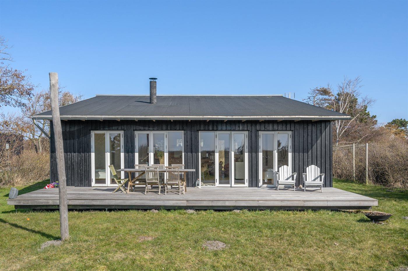 Sommerhuset ligger på en naturskøn grund med hyggelige kroge, hvor I kan nyde naturen, og være helt tæt på solnedgangen. De store vinduespartier fra gulv til loft giver en fantastisk udsigt over vandet, og direkte adgang til stranden. Vinduespartierne lader dagslyset strømme ind og skaber en særlig forbindelse mellem ude og inde.