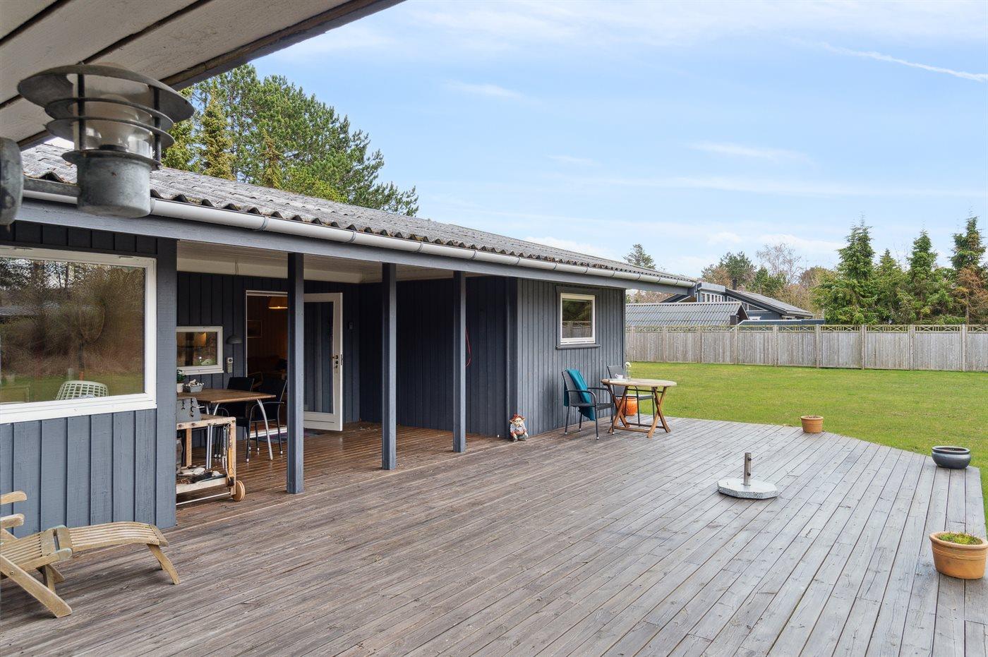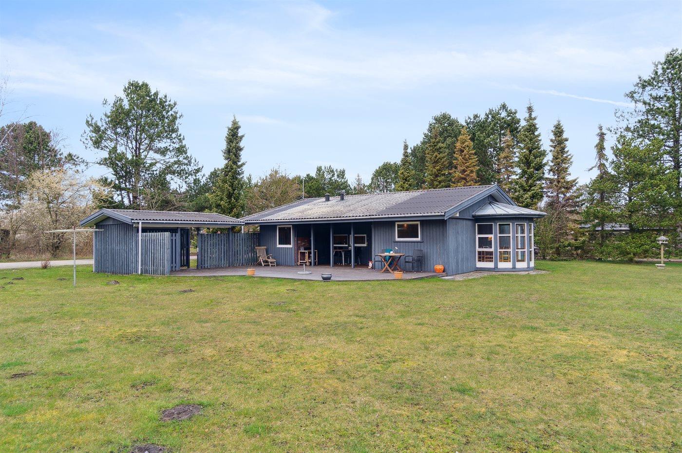 Ferieboligen er beliggende på en 1430 m² stor naturgrund. Der er 600 m til havet. Nærmeste forretning er beliggende i en afstand af 4400 m. Til ferieboligen hører 40 m² terrasseareal. Desuden er der 18 m² overdækket terrasse. Der er redskabsrum. Fodboldmål. Grill til rådighed. Der er carport til rådighed. Parkering ved ferieboligen.