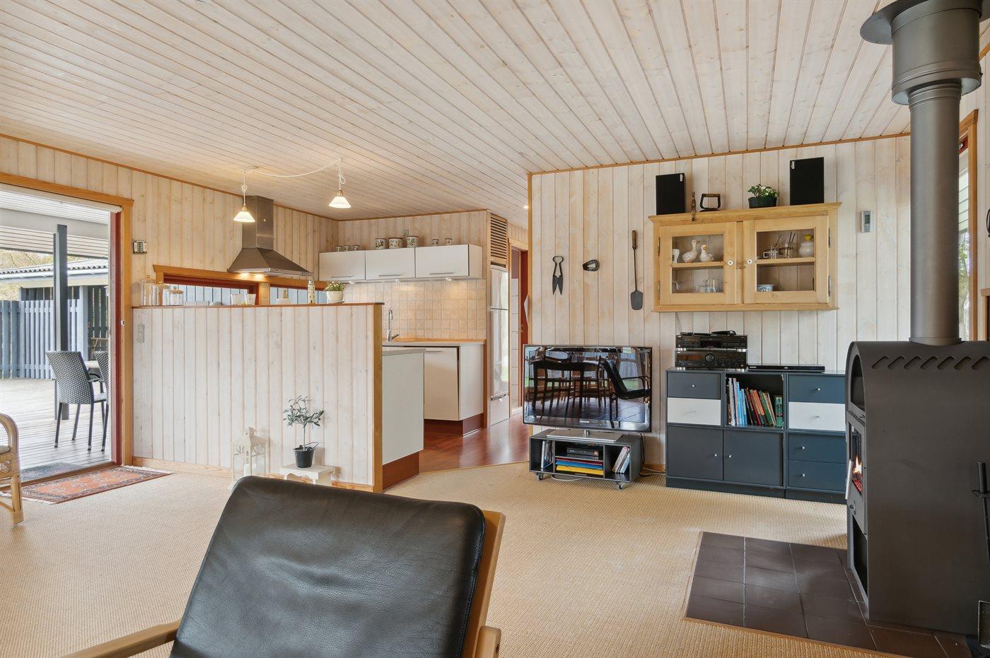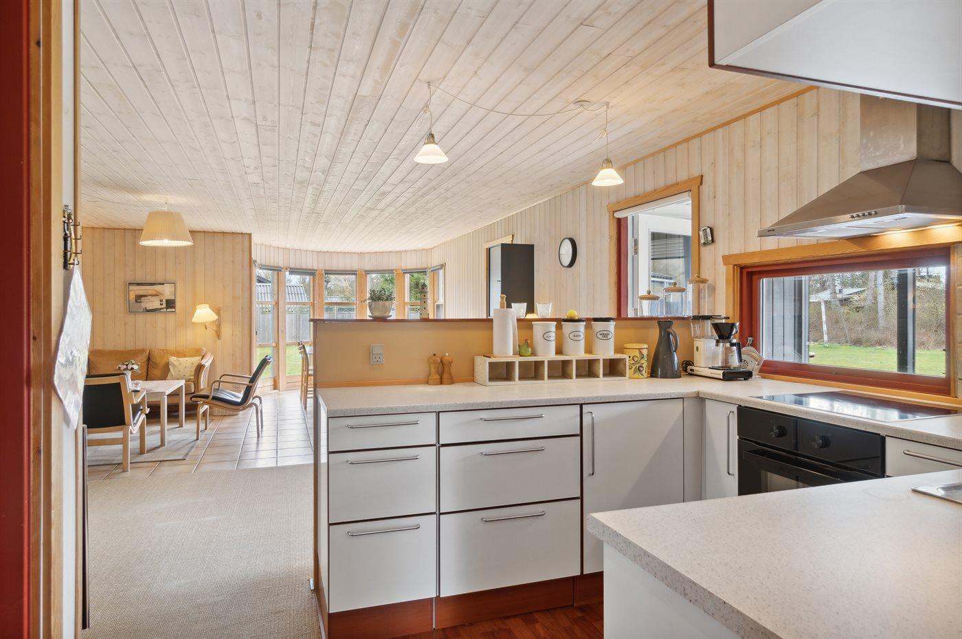 Køkkenet er udstyret med 1 køleskab. Der er 4 keramiske kogeplader, varmluftovn samt opvaskemaskine.