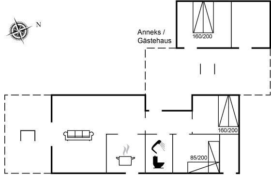 4 af sovepladserne er i selve huset og 2 sovepladser er i annekset. Der er loft til kip i alle rummene i selve huset, hvilket bidrager til en god rumfornemmelse. Stuen og spisepladser er i åben forbindelse med køkkenet grænsende op til spisepladsen.