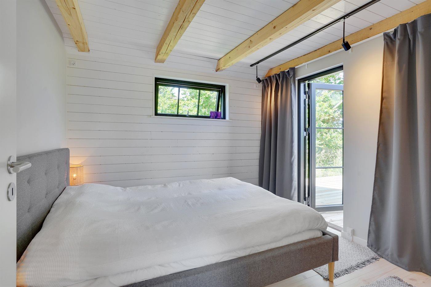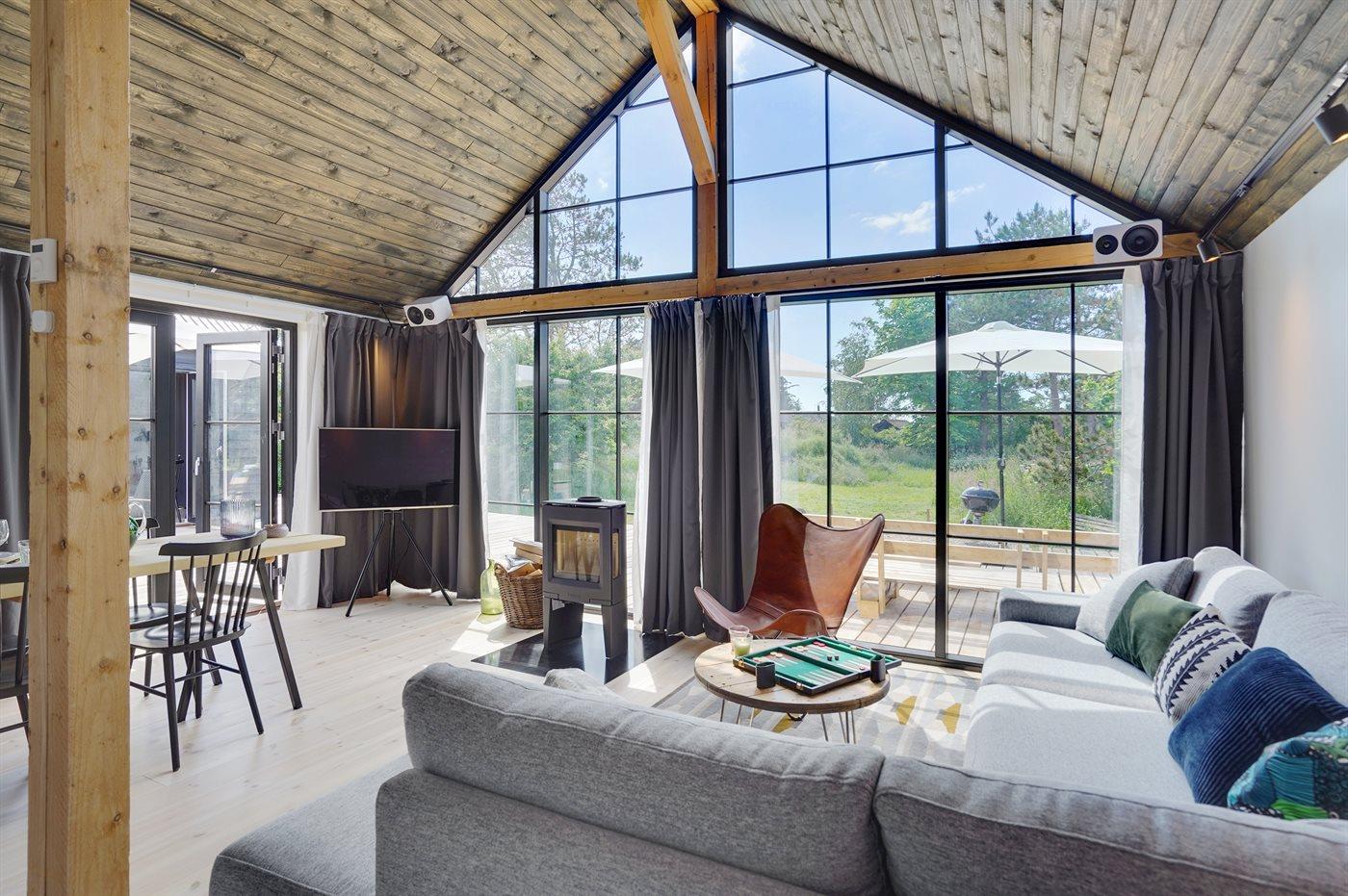Moderne luksussommerhus fra 2022 med sauna, vildmarkskar og selvstændigt anneks nær stranden.