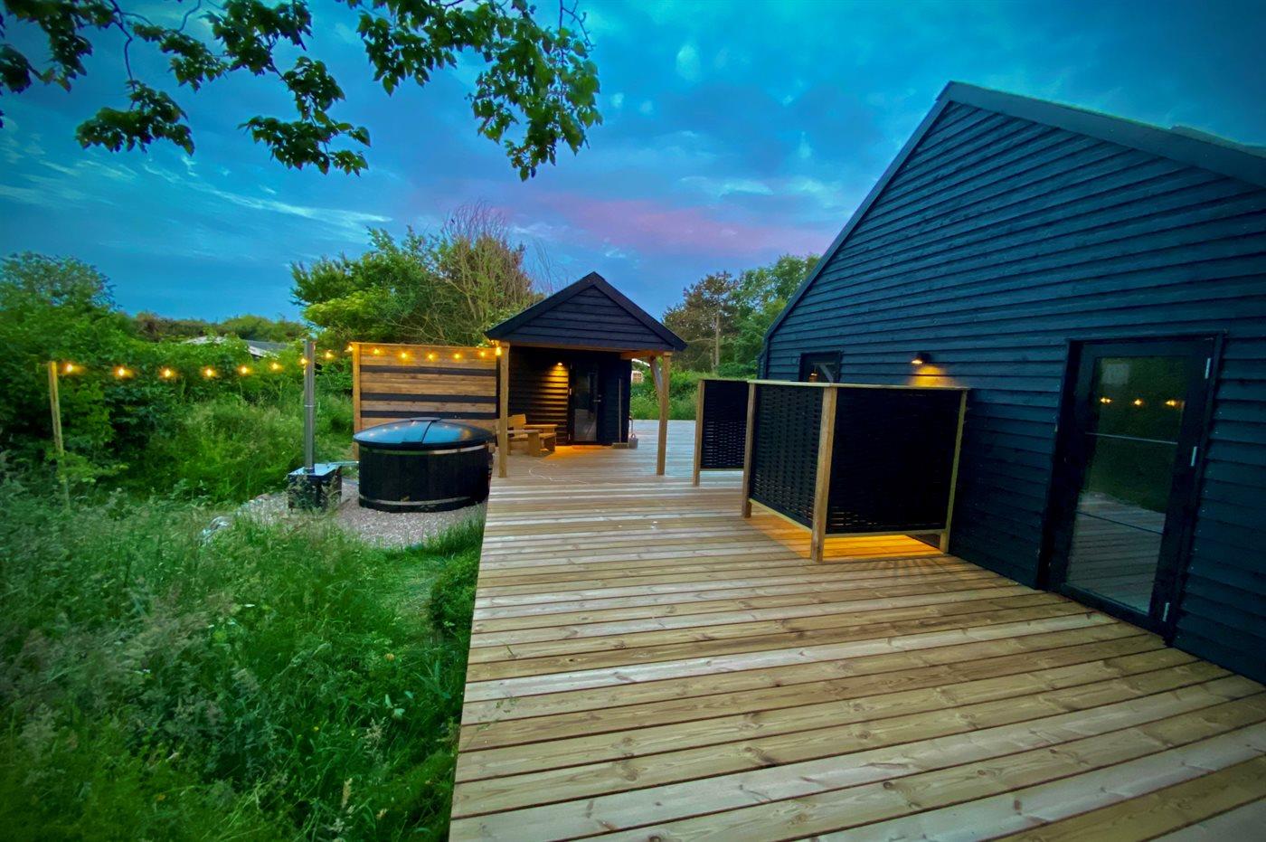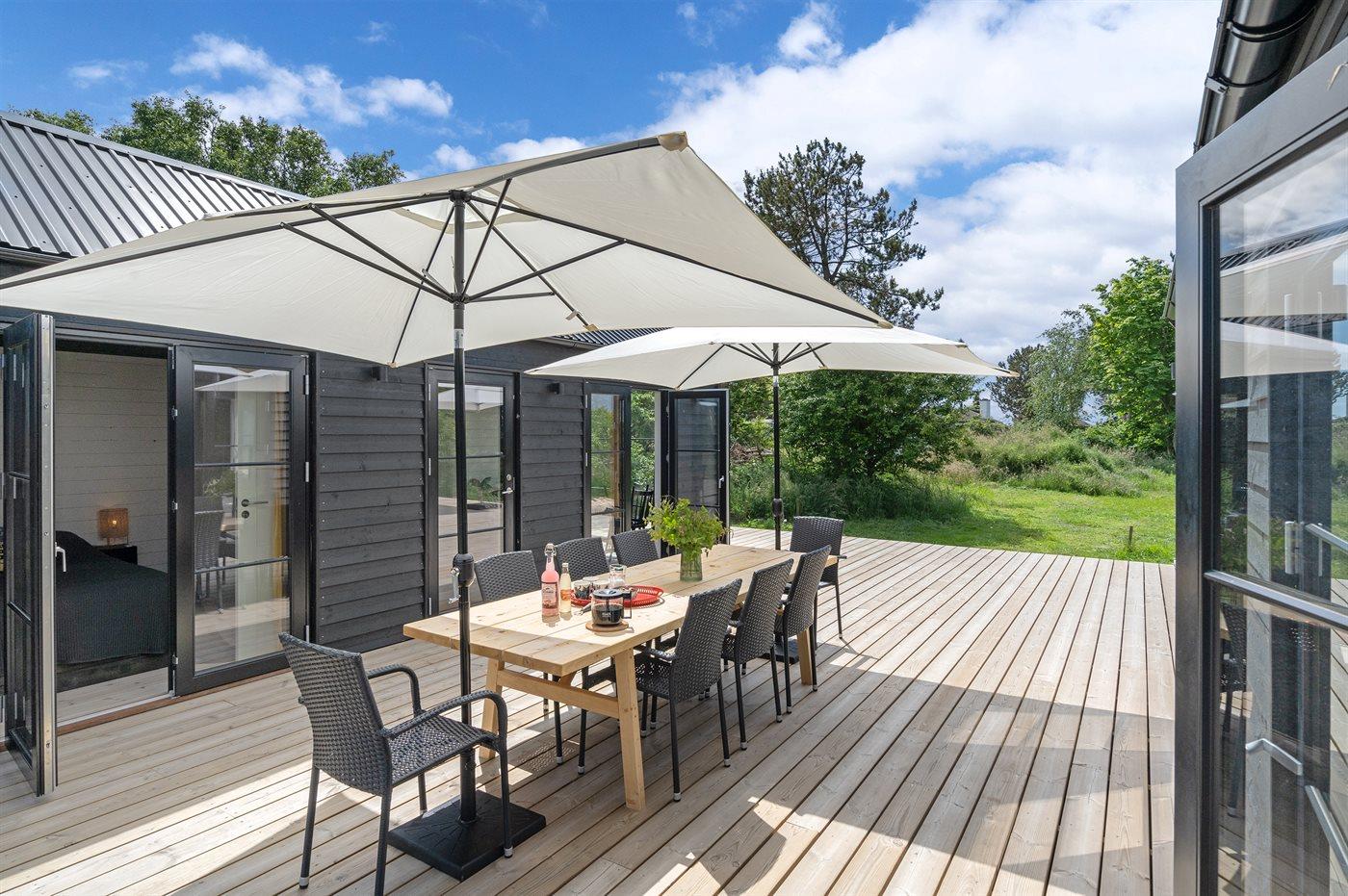 Moderne og nyopført luksussommerhus beliggende i 2. række til stranden og med udendørs vildmarkskar og udendørs sauna