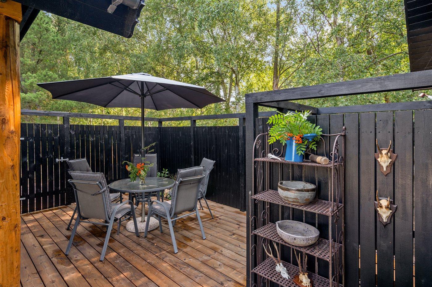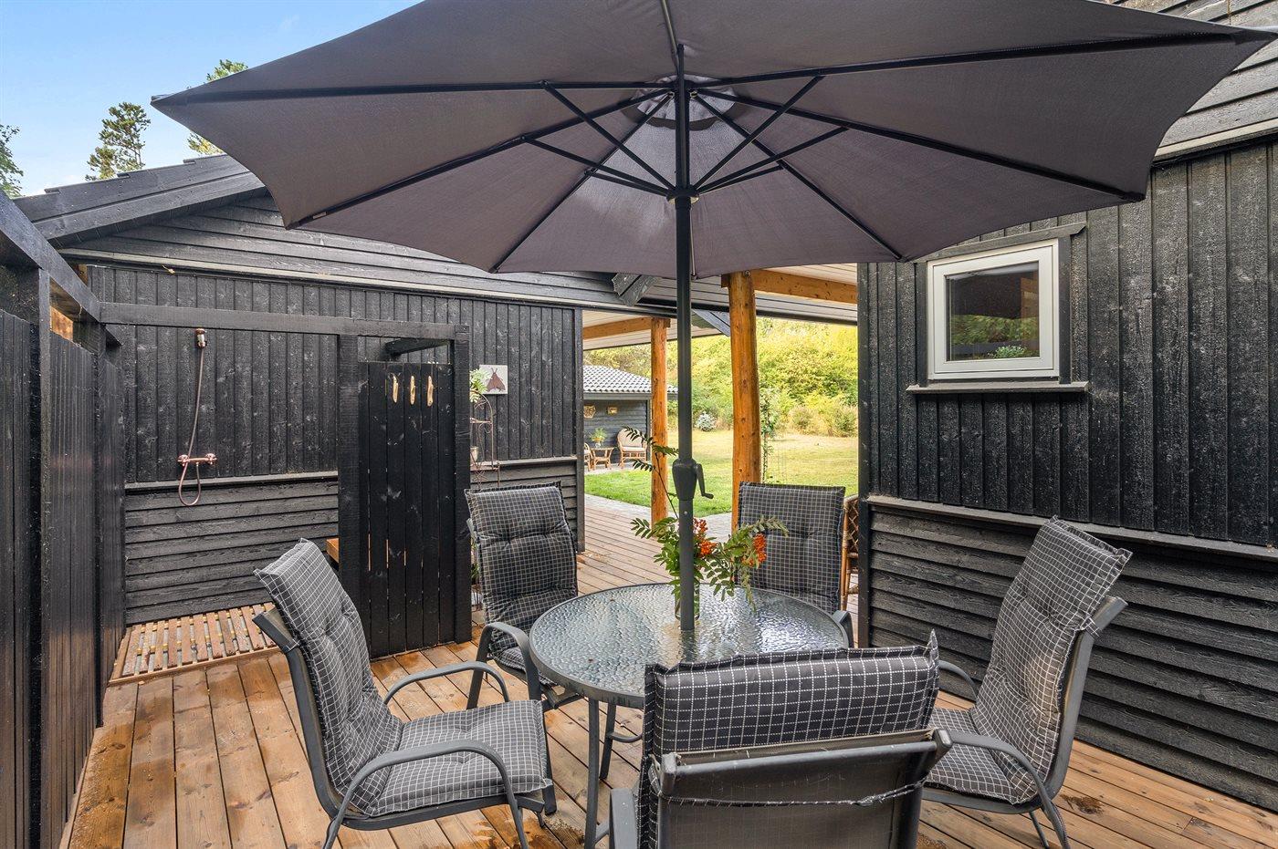 Udelivet kan nydes på den store terrasse med udendørs pejs og udendørs bruser og hvor en del af terrassen er overdækket.