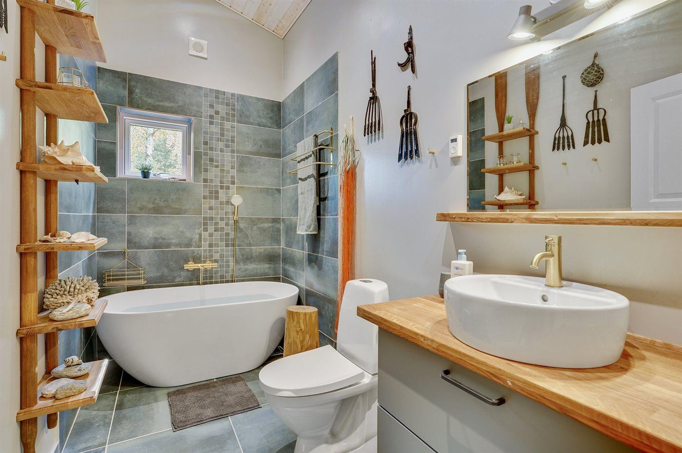 Der er 3 badeværelser med bruseniche og 3 toiletter. Der er gulvvarme på 3 badeværelser.. Badekar.