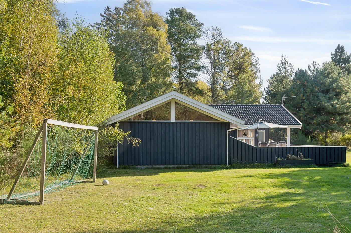 Ferieboligen er beliggende på en 1435 m² stor havegrund. Der er 250 m til havet. Der er en badebro i nærheden. Nærmeste forretning er beliggende i en afstand af 3300 m. Der er en golfbane i en afstand af 8150 m. Til ferieboligen hører 40 m² terrasseareal. Desuden er der 11 m² overdækket terrasse. Fodboldmål. Bålsted. Grill til rådighed. Parkering ved ferieboligen.