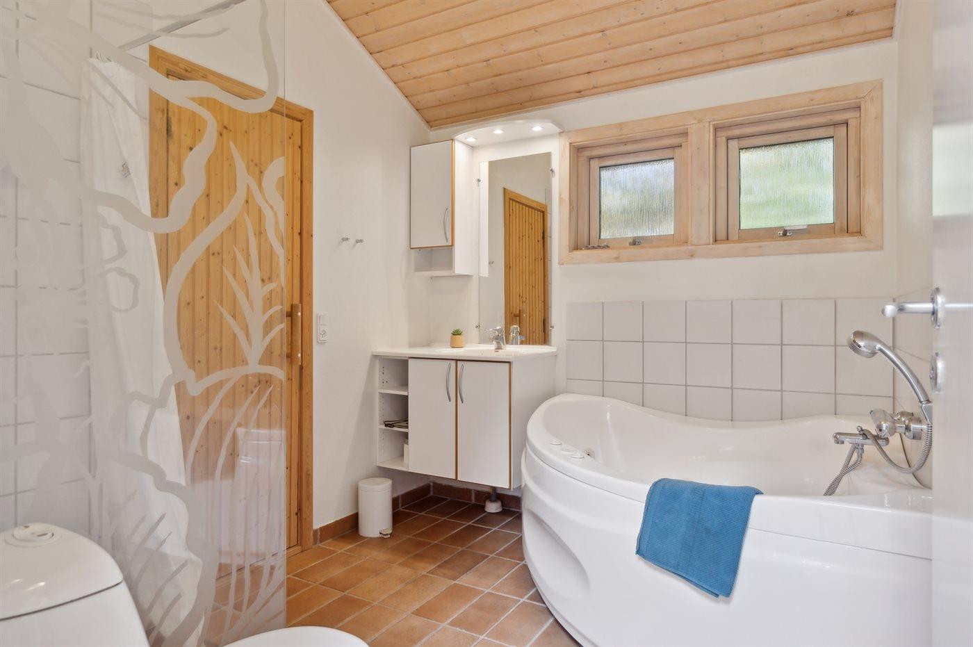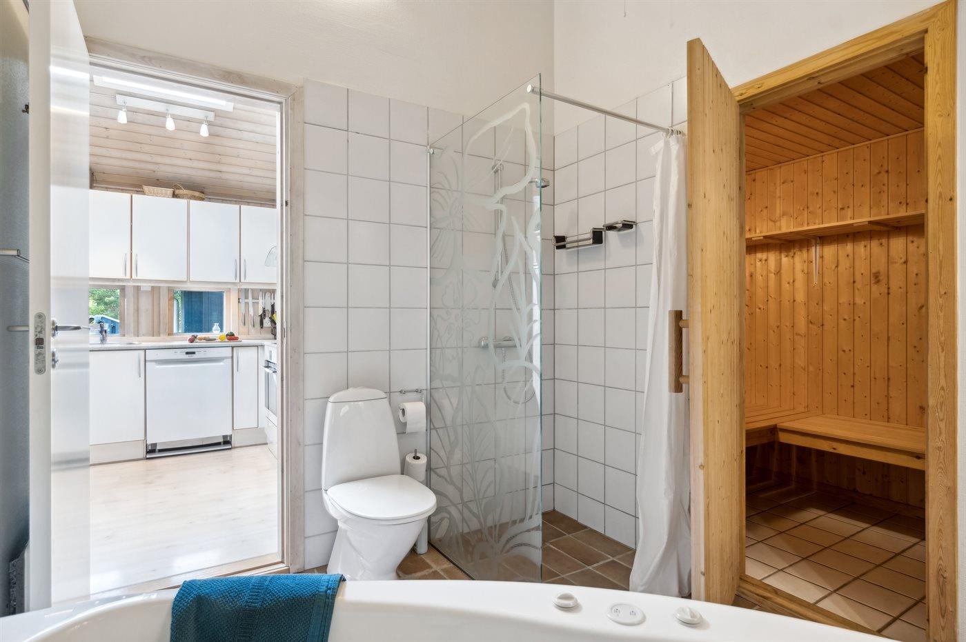 Der er 2 badeværelser med bruseniche og 2 toiletter. Der er gulvvarme på 2 badeværelser. I saunaen er der mulighed for afslapning.
