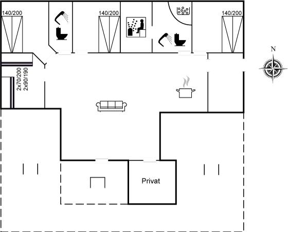Huset indeholder et køkkenalrum i åben forbindelse med stuen og herfra er udgang til terrasseområdet. Der er 4 soveværelser. I 3 af soveværelserne er der dobbeltsenge og i det sidste soveværelse er 1 køjeseng med 2 sovepladser. Sovepladserne i køjesengen er på grund af målene på sengen bedst egnede til børn og unge mennesker. Der er 2 badeværelser med bruseniche og gulvvarme. I det største badeværelser er der desuden spa og sauna. I bryggerset er der vaskemaskine og tørretumbler.