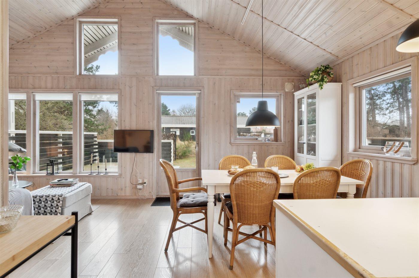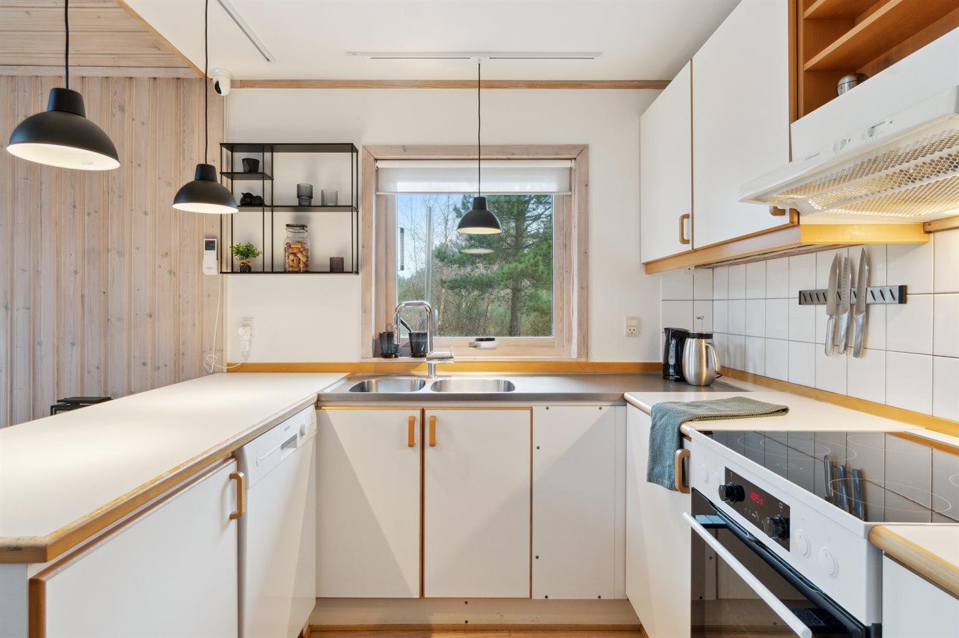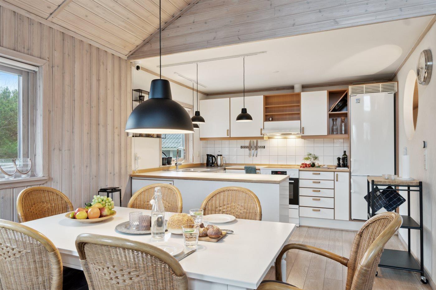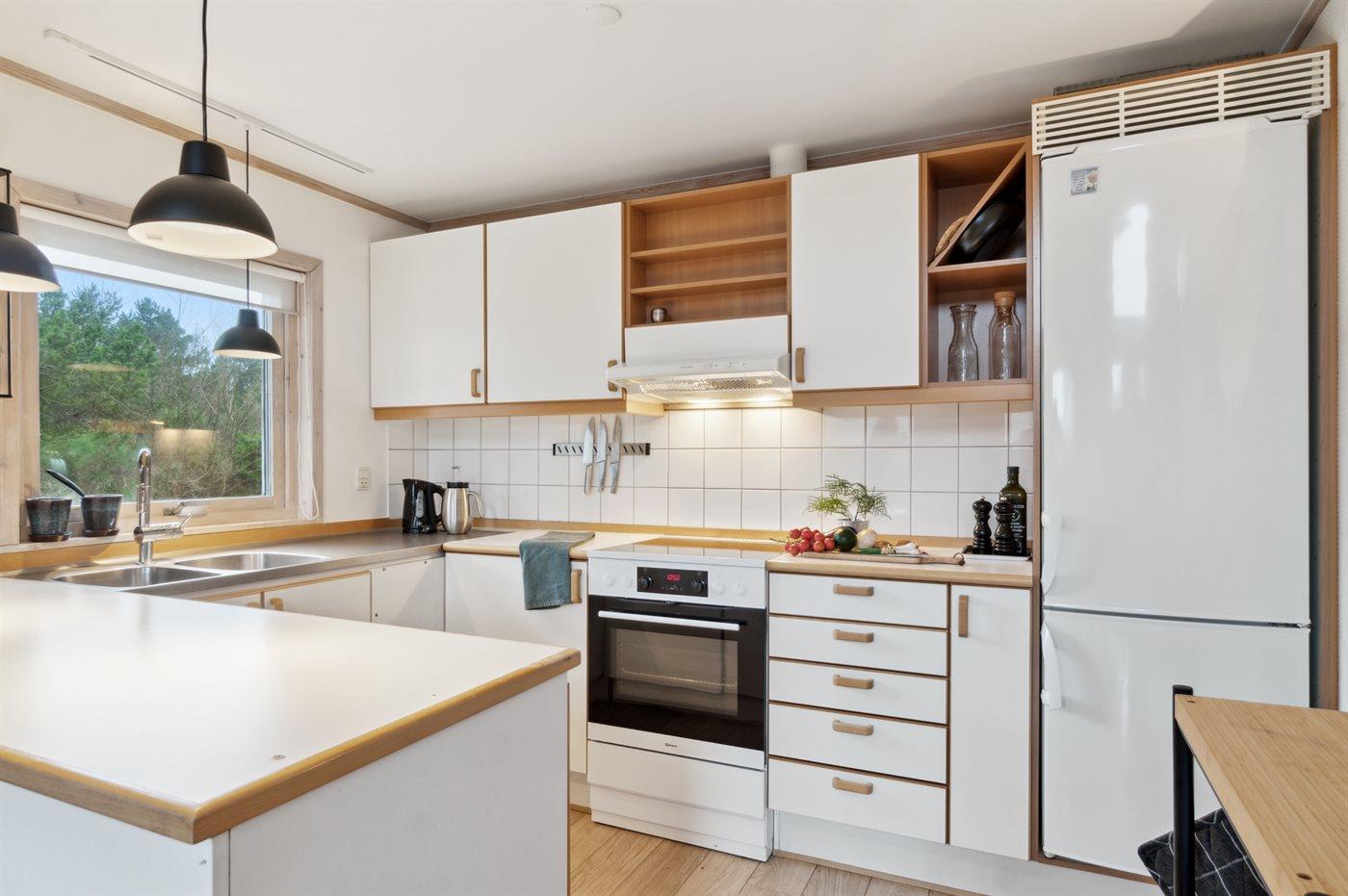 Køkkenet er i åben forbindelse med spisepladsen og stuen og her er masser af lys og luft takket være den store loftshøjde og de mange store sydvendte vinduer. Herfra er udgang til en stor træterrasse som fortsætter rundt om huset mod vest. Her er der rig mulighed for at slappe af og nydes det gode vejr.
