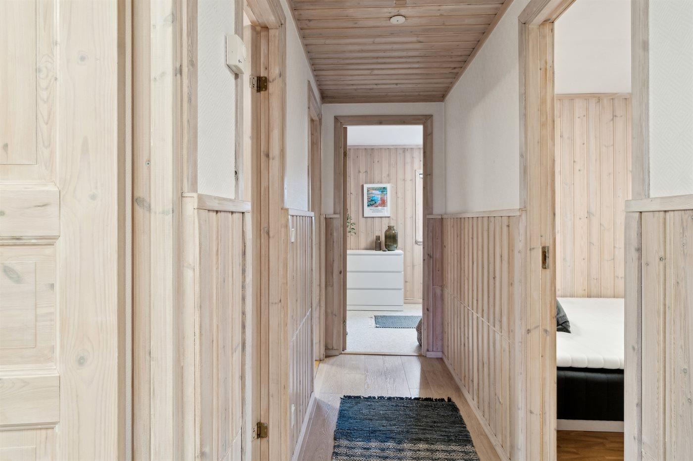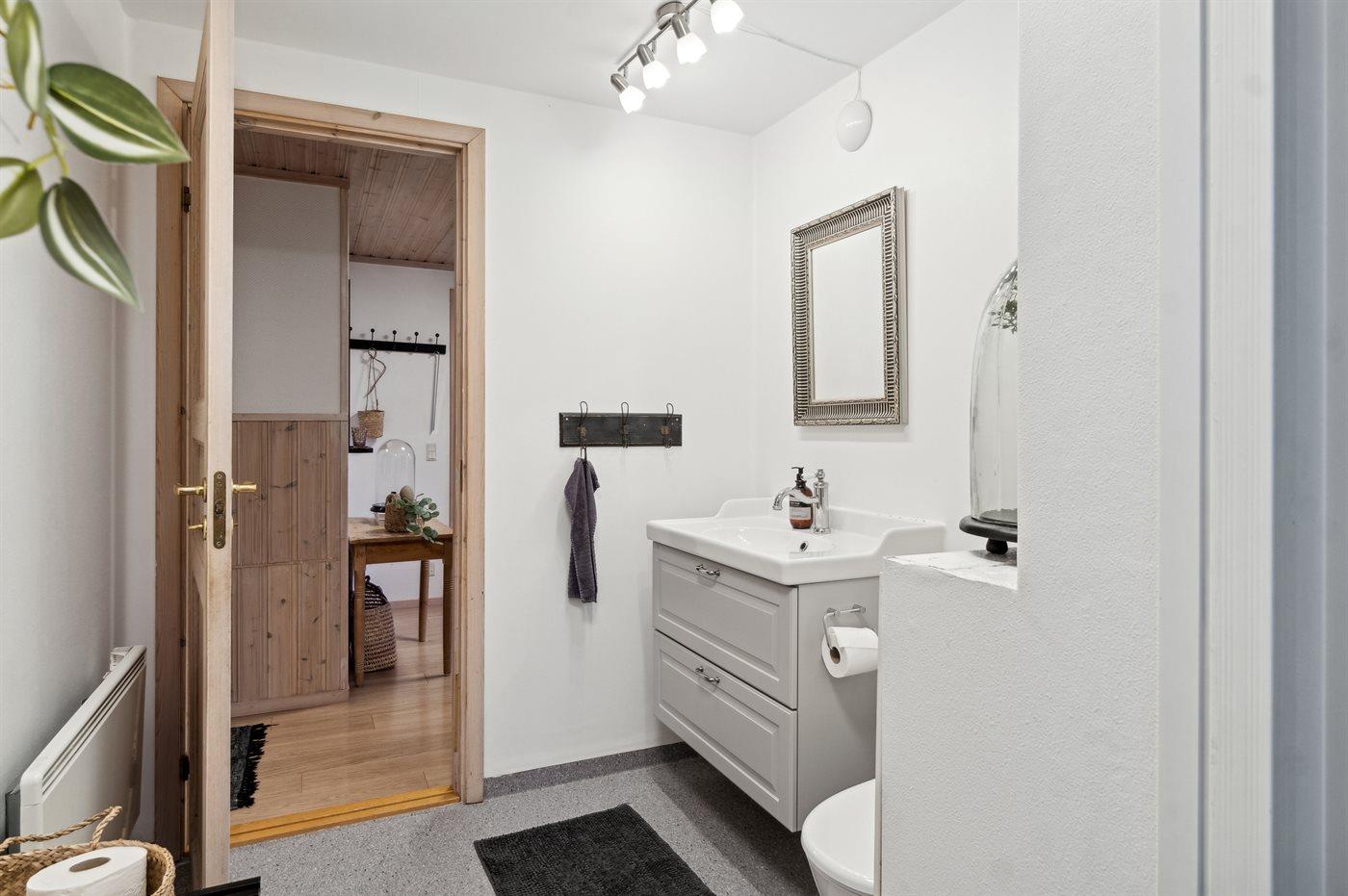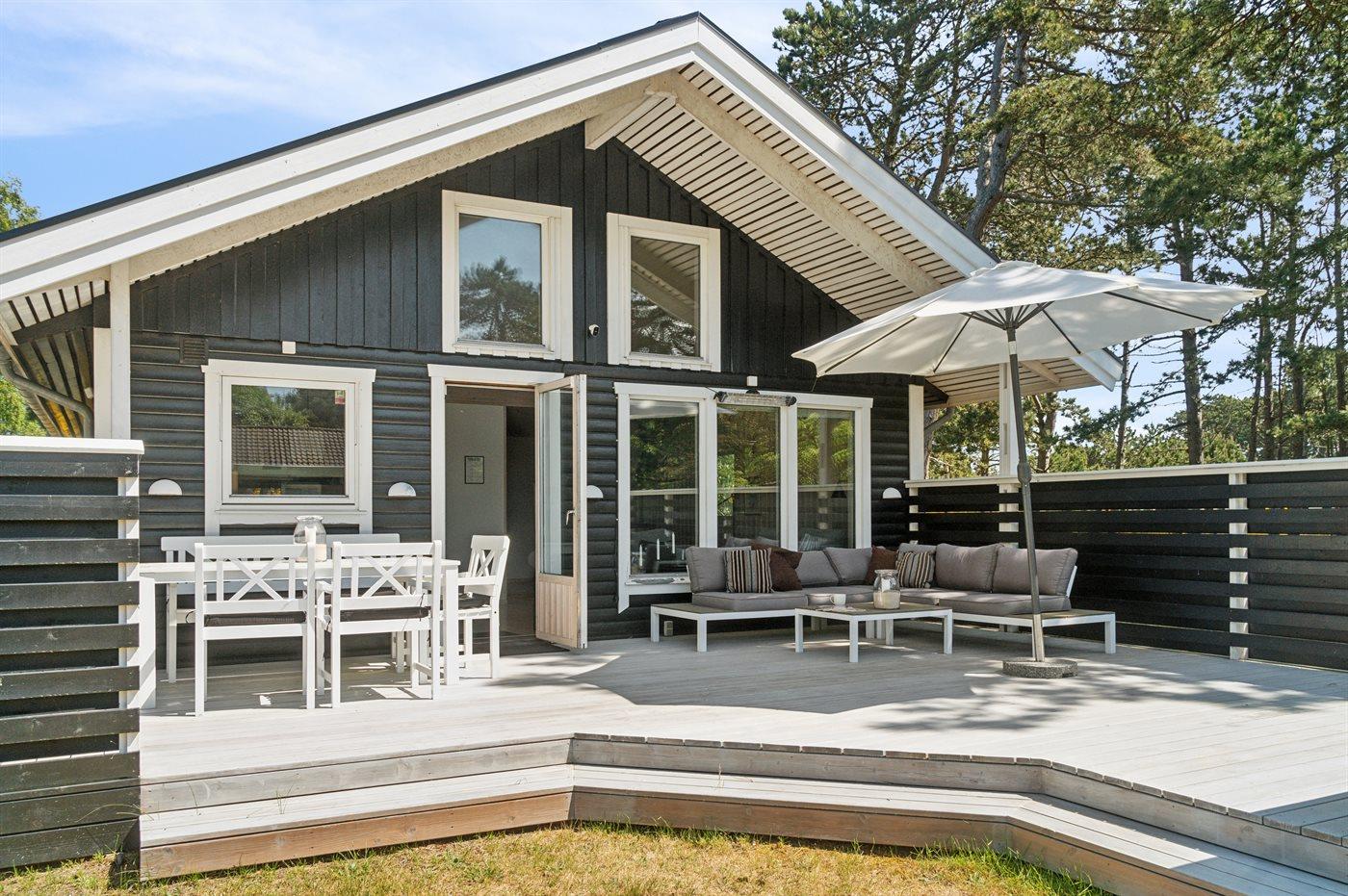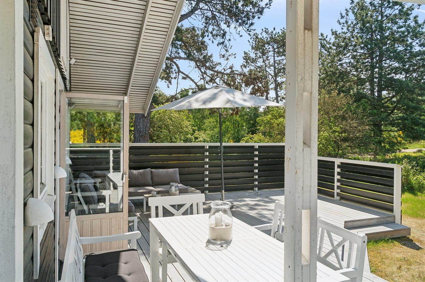 Køkkenet er i åben forbindelse med spisepladsen og stuen og her er masser af lys og luft takket være den store loftshøjde og de mange store sydvendte vinduer. Herfra er udgang til en stor træterrasse som fortsætter rundt om huset mod vest. Her er der rig mulighed for at slappe af og nydes det gode vejr.