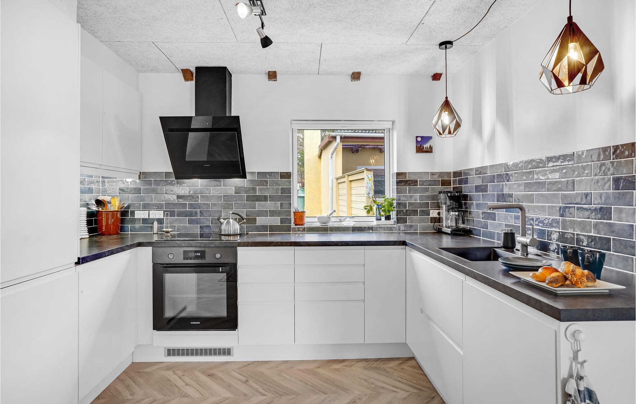 Dette rummelige feriehus forener gammelt og nyt til en helhed, så I både får komforten af et moderne, veludstyret køkken og kan nyde charmen fra det ældre spisebord, når I samles om måltiderne. Efter et par rolige timer om morgenen kan I vælge at blive hjemme eller tage på en udflugt ud i det flotte kystlandskab. I stue finder I stuen flere flere gode siddepladser, hvor I kan slappe af med en bog, spille spil eller løse en krydsogtværs. Udenfor finder I også flere kroge, hvor I kan slappe af med en kop kaffe, mens de små leger og tumler på græsplænen. I kan også gå en lille tur ned til stenstranden, hvor der er frisk luft, gode muligheder for at bade og gå tur.