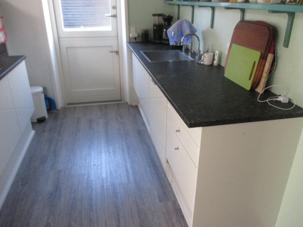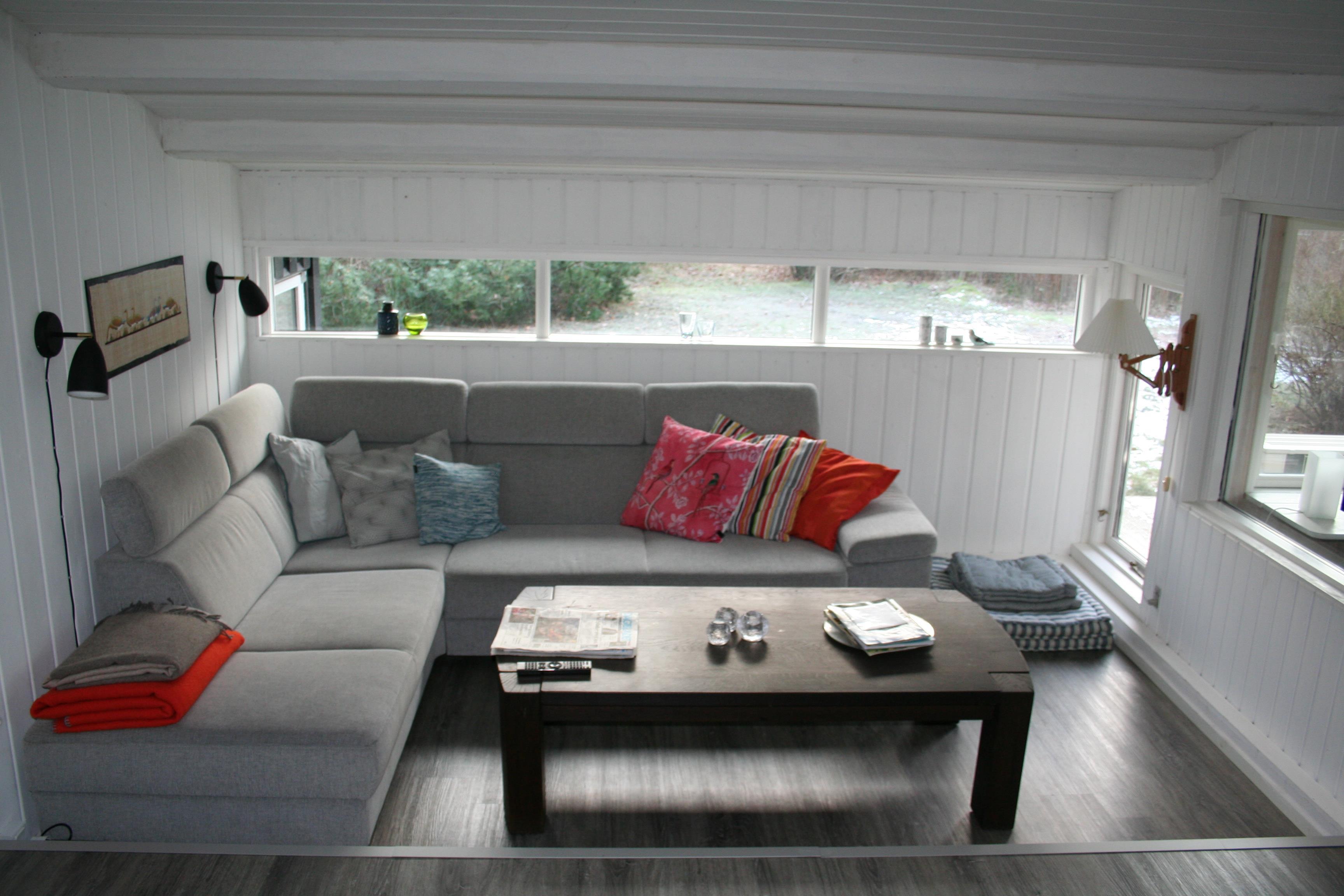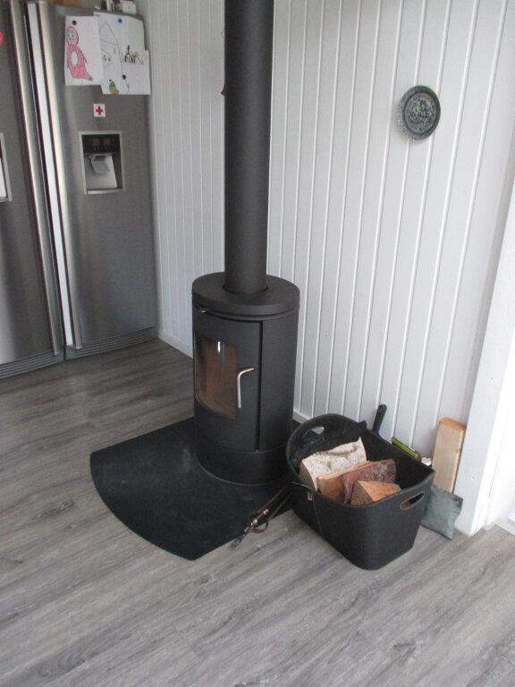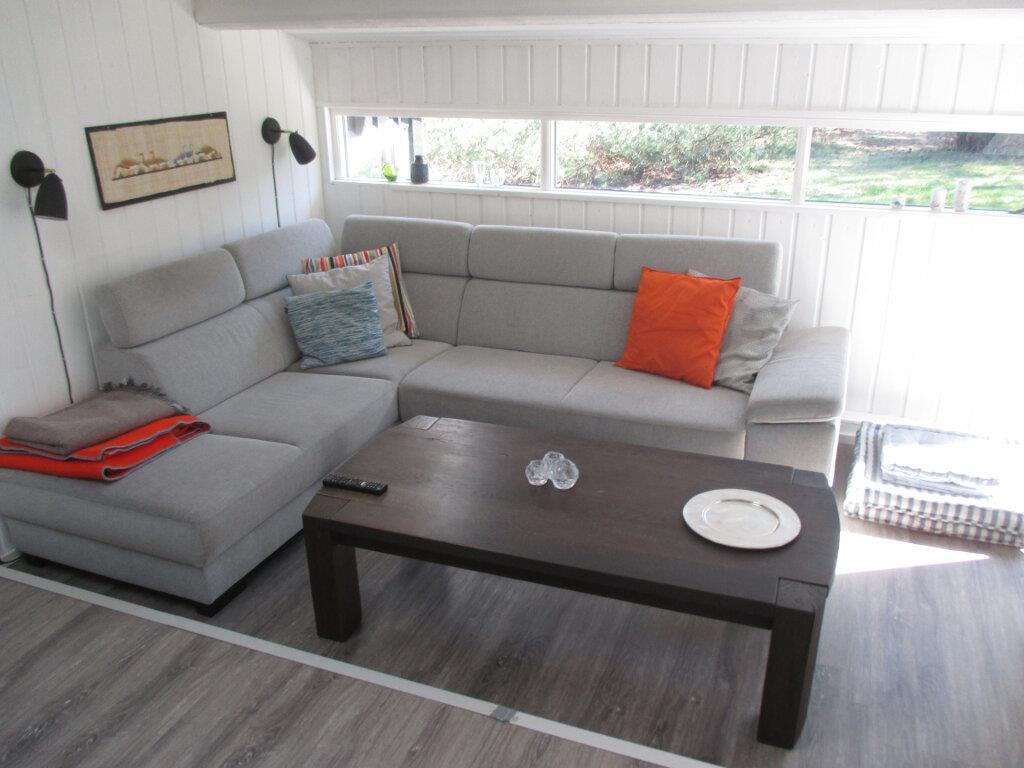 Skøn, lys stue med hyggeligt sofahjørne og brændeovn. Der er TV med danske og skandinaviske kanaler. Køkkenet ligger i åben forbindelse med stuen og har dør ud til haven. Køkkenet er udstyret med bl.a. et dejligt stort køle-/fryseskab og opvaskemaskine.