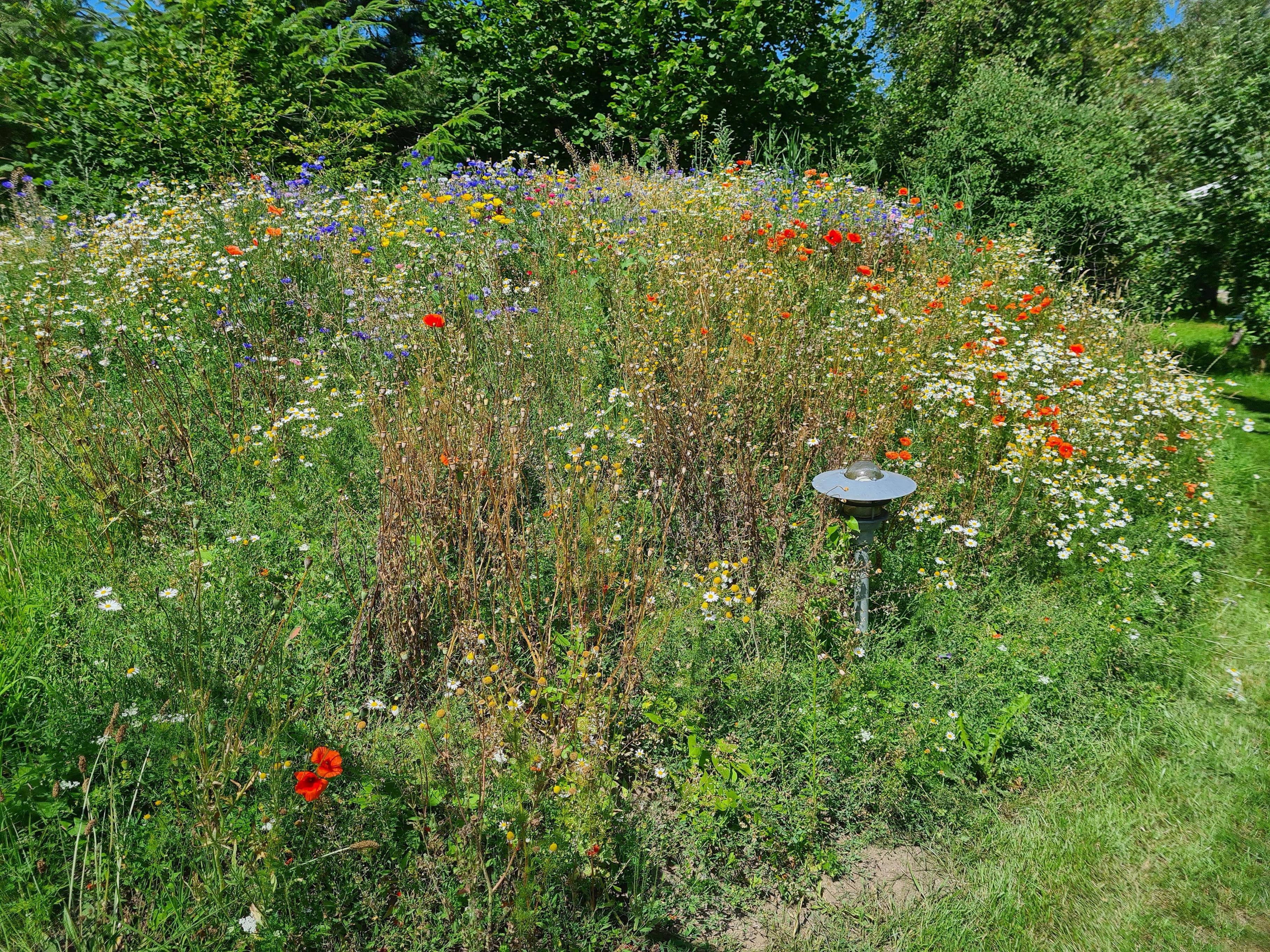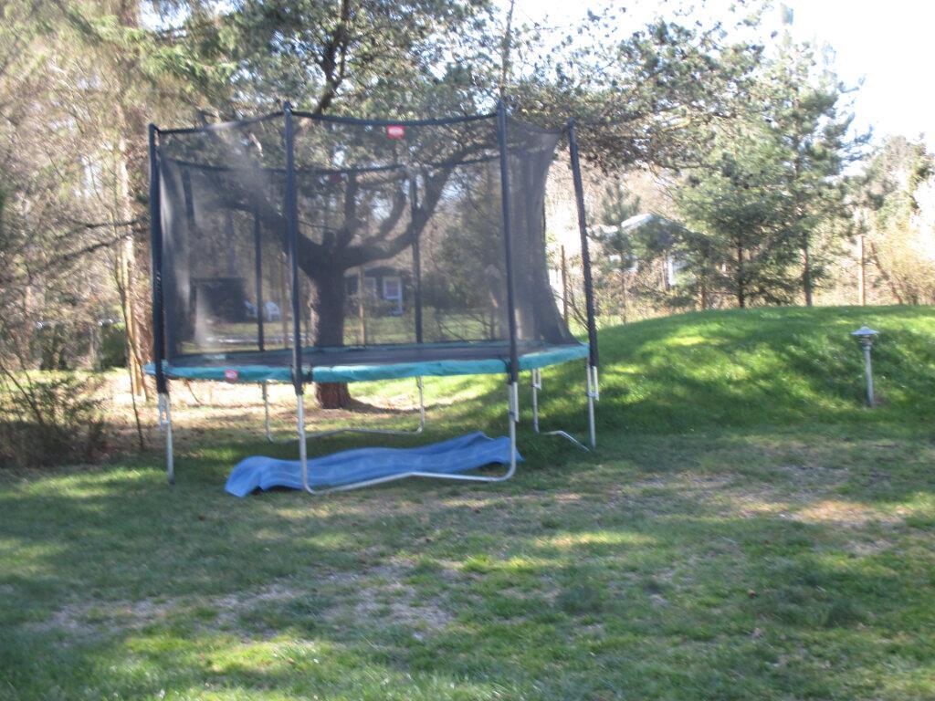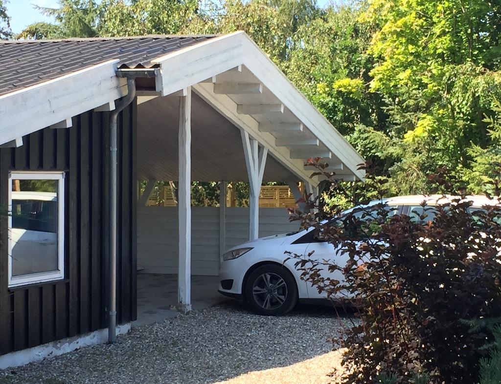 Der er en carport ved huset og shelter i haven.