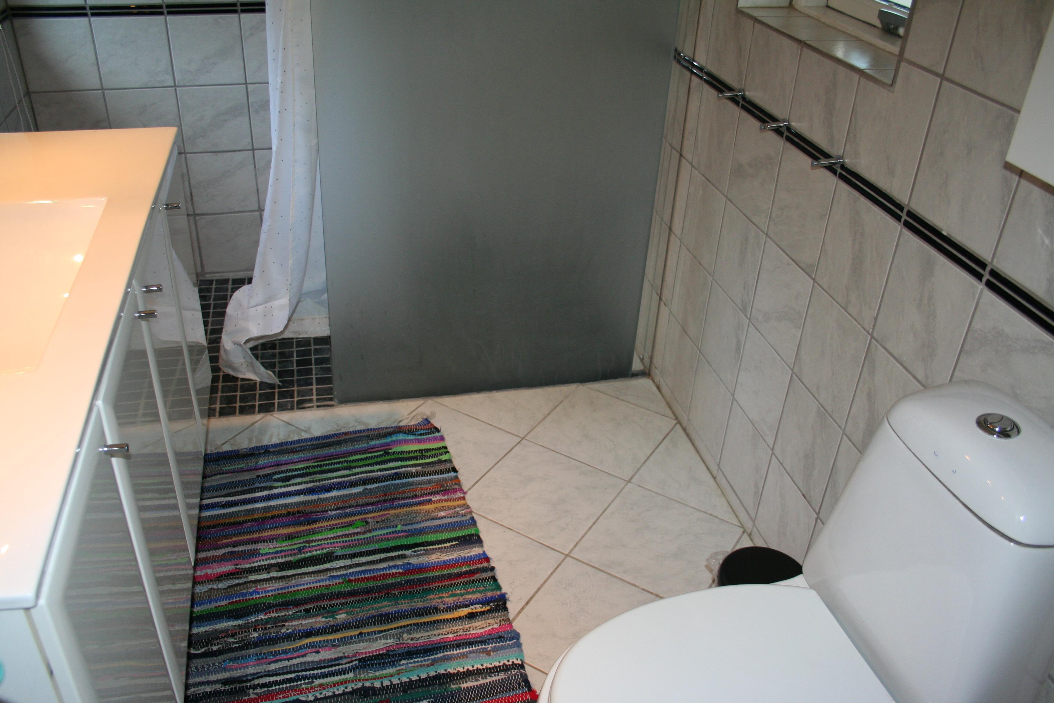 Badeværelset har varme i gulvet og en dejlig stor brusekabine. Derudover har huset et ekstra toilet, og der er også vaskemaskine og tørretumbler.