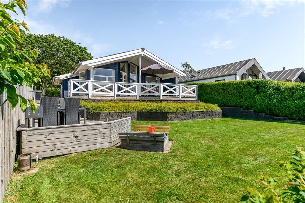 I forlængelse af stuen ligger en vidunderlig terrasse, der er dejligt solrig takket være den sydvestvendte orientering. Placeringen betyder også, at du har frit udsyn til kyststrækningen og bugten, når du slapper af i den friske luft – på en klar dag kan du endda se helt til vadehavsøen Langli og den fredede halvø Skallingen. Hvis du får mere lyst til at sidde i skyggen frem for at slikke sol, kan du rykke ind under overdækningen eller slå parasollen op, og hvis du vil have græs under fødderne, kan du tage terrassens trappe ned til havens grønne græsplæne.