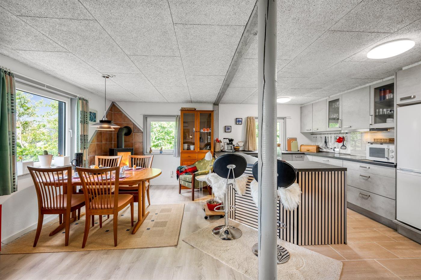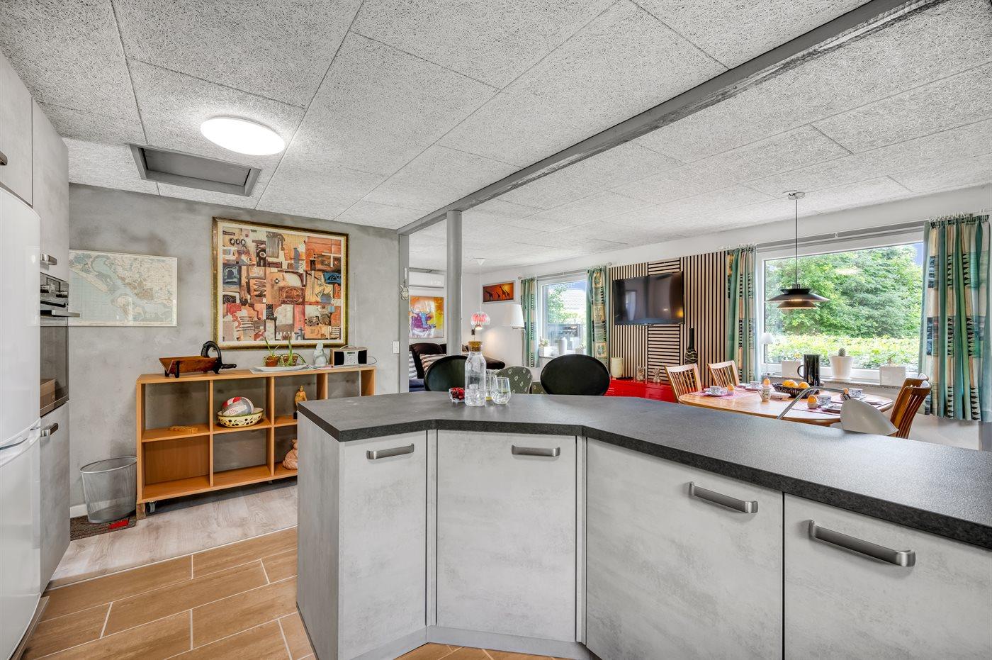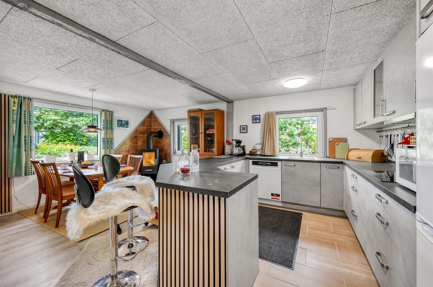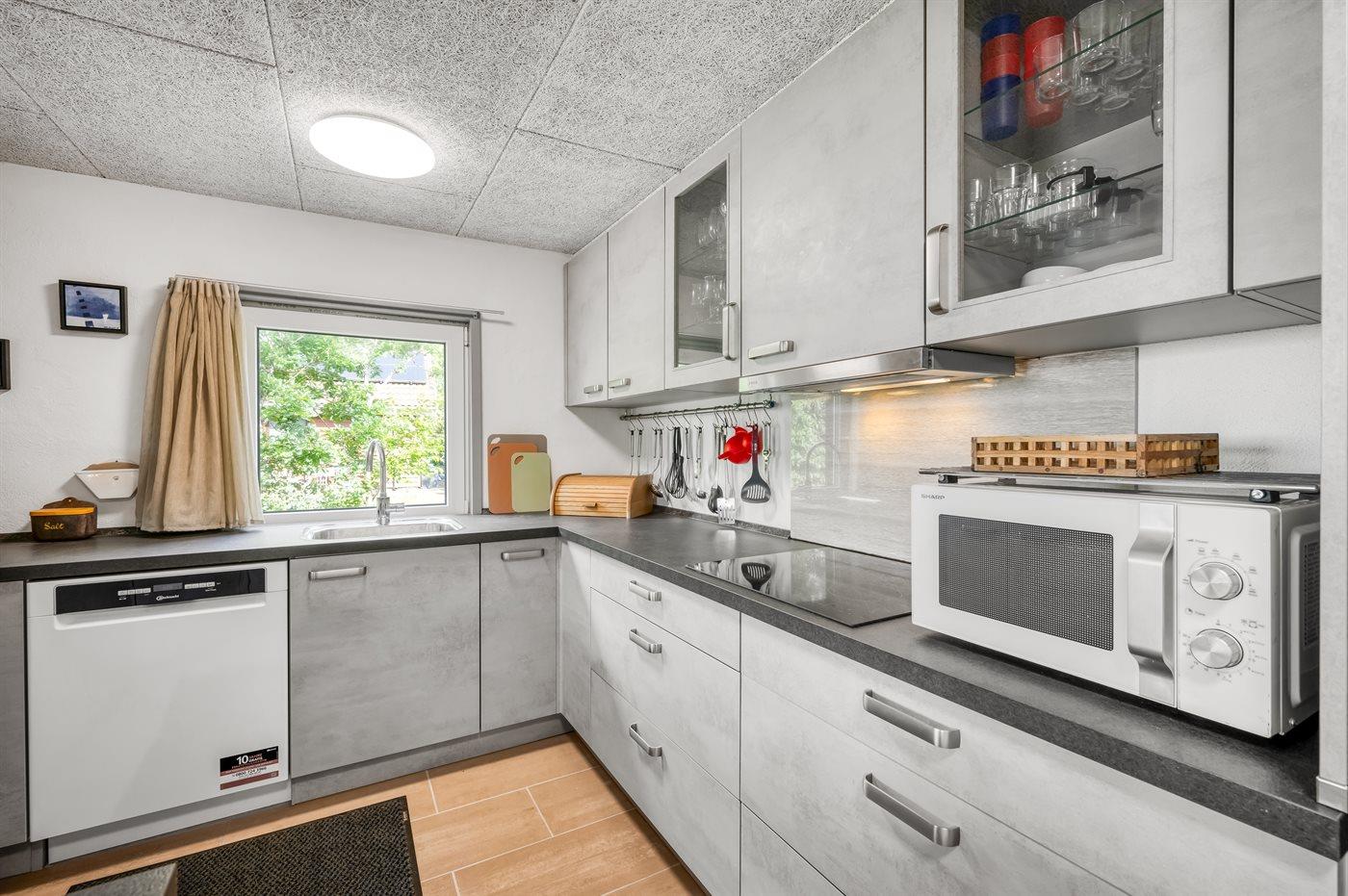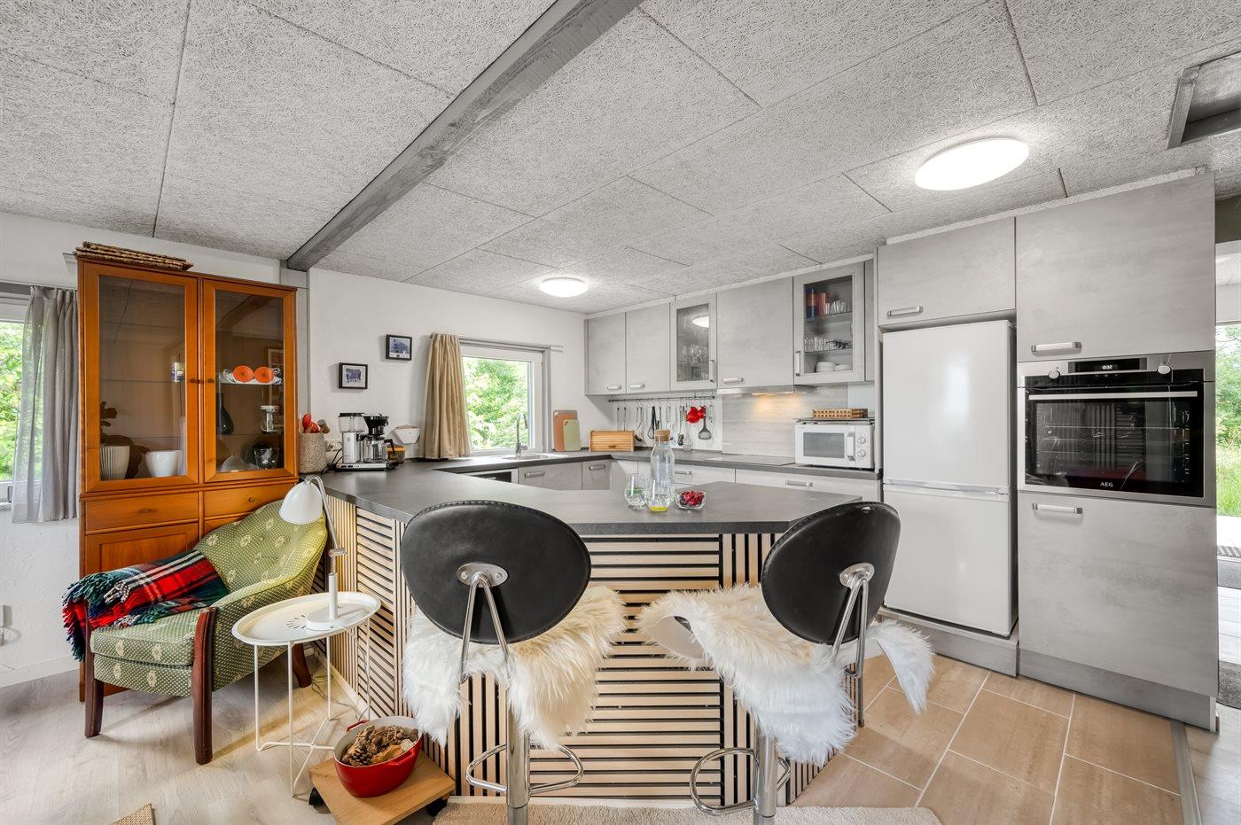 Køkkenet er udstyret med 1 køleskab. Der er 4 induktionskogeplader, varmluftovn, mikrobølgeovn samt opvaskemaskine.