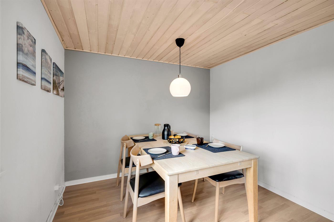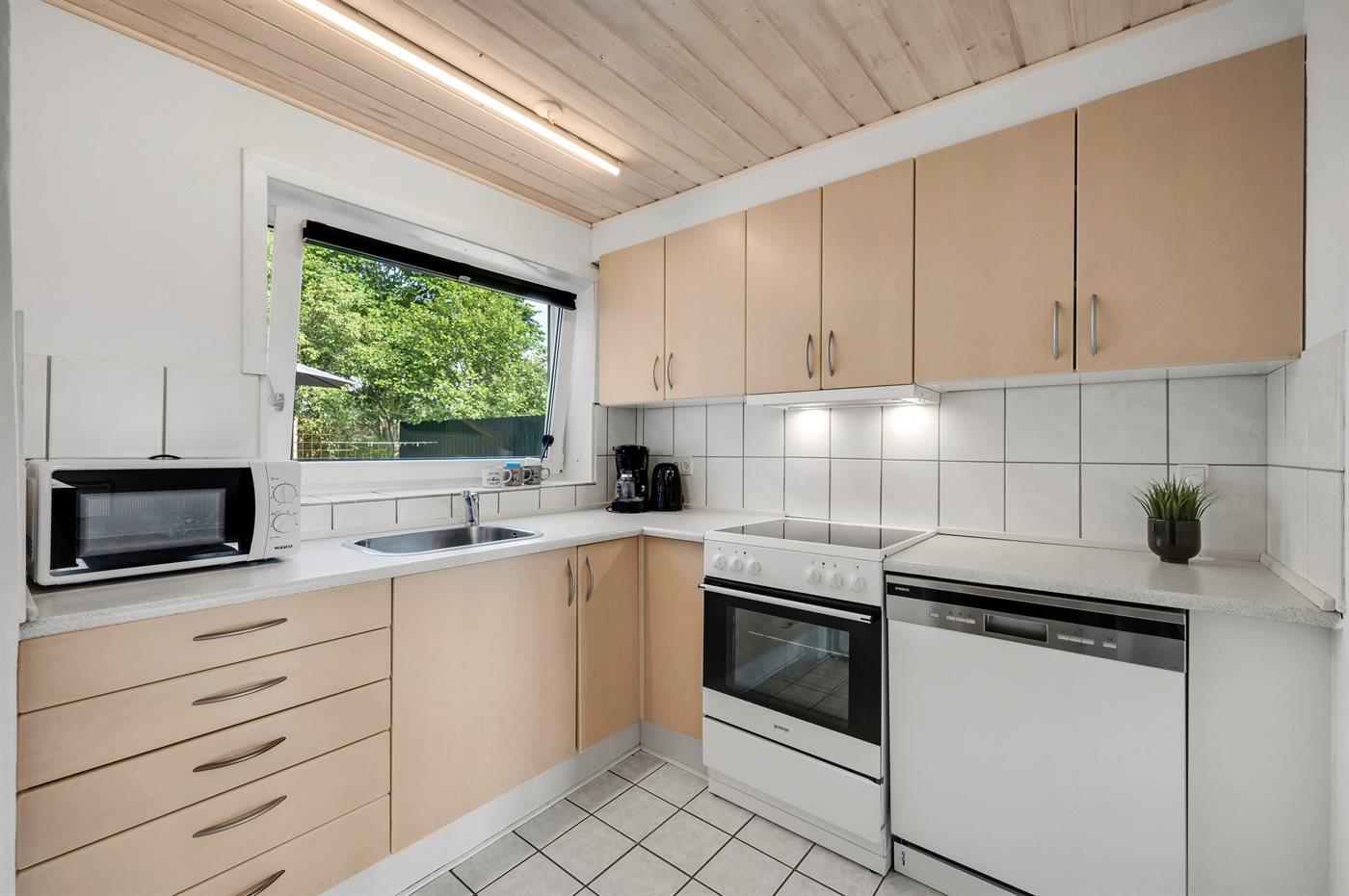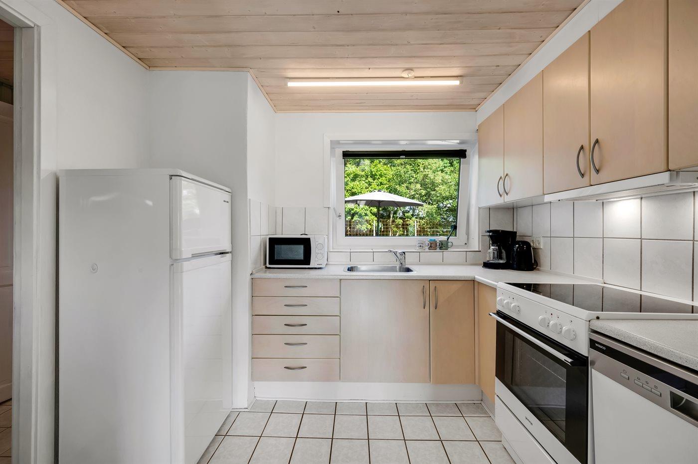 Køkkenet er udstyret med 1 køleskab. Der er 4 keramiske kogeplader, varmluftovn, mikrobølgeovn samt opvaskemaskine.