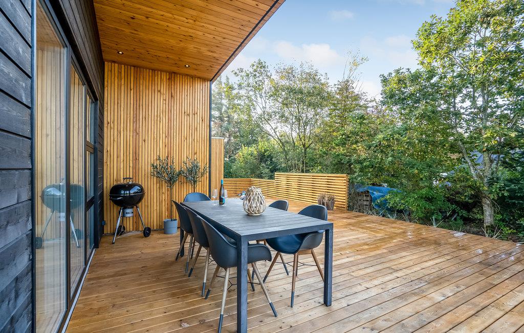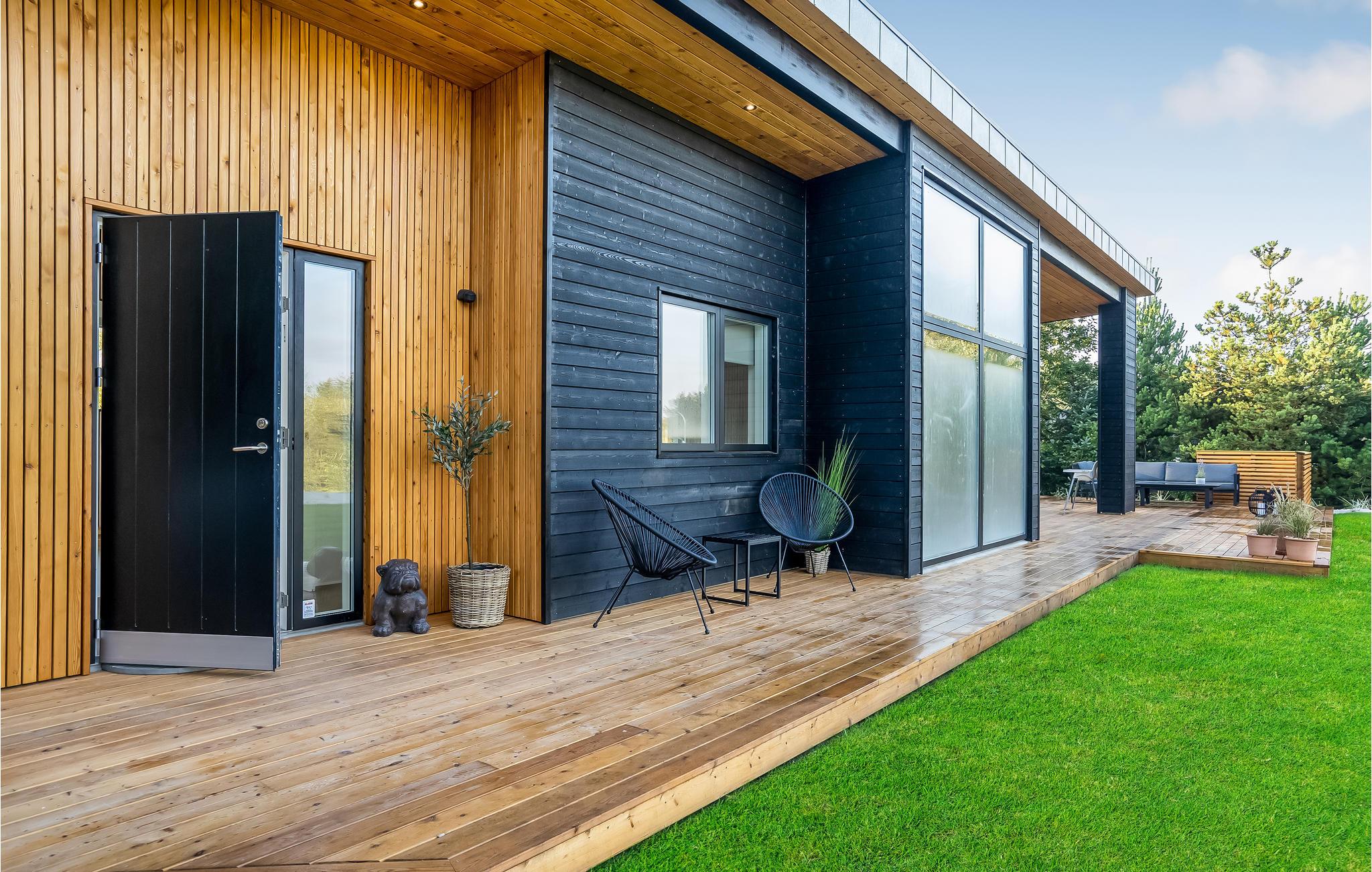 Moderne sommerhus ved Sjelborg Strand med terrasse, trampolin og kort afstand til stranden.