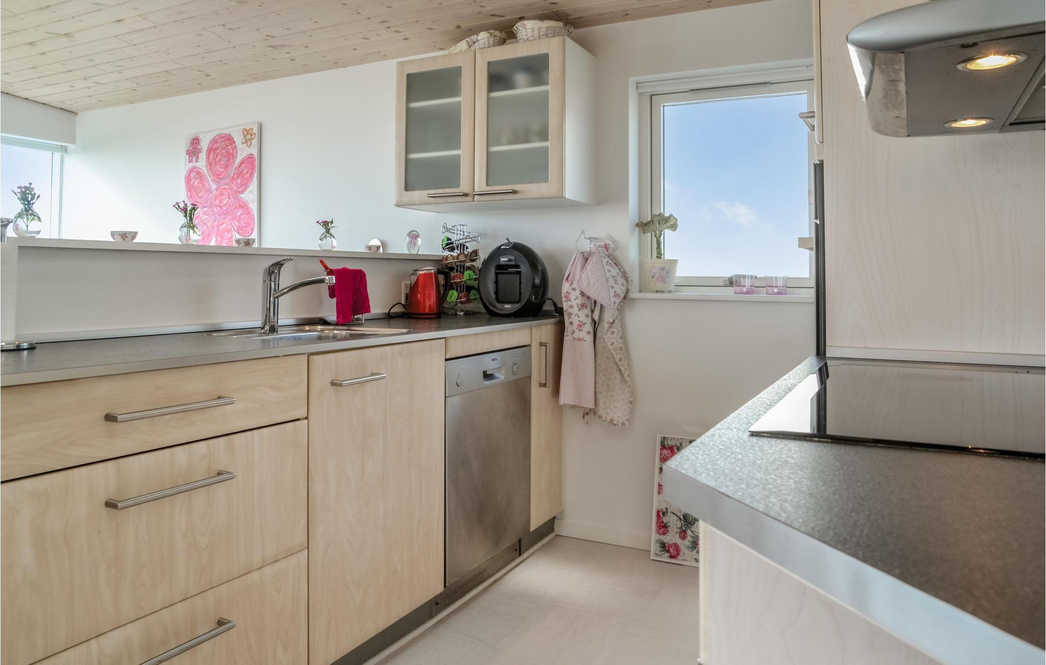 Eksklusivt sommerhus med en enestående beliggenhed helt ned til strandkanten og selvfølgelig med panoramaudsigt fra huset over Vesterhavet og indsejlingen til Esbjerg og Fanø. I klart vejr kan Blåvand Fyr ses ude mod vest. Feriehuset er i to plan med et godt indrettet køkken, der er åbent mod stuen med panoramavinduer mod havet og med brændeovn samt klimaanlæg. Fra feriehuset er der sti til strande, og ved terrassen er der opsat et praktisk udendørs brusebad. Der er god plads til seks gæster, da der er badeværelse med gulvvarme på hver etage. Der er desuden gulvvarme i hele husets nederste etage.
