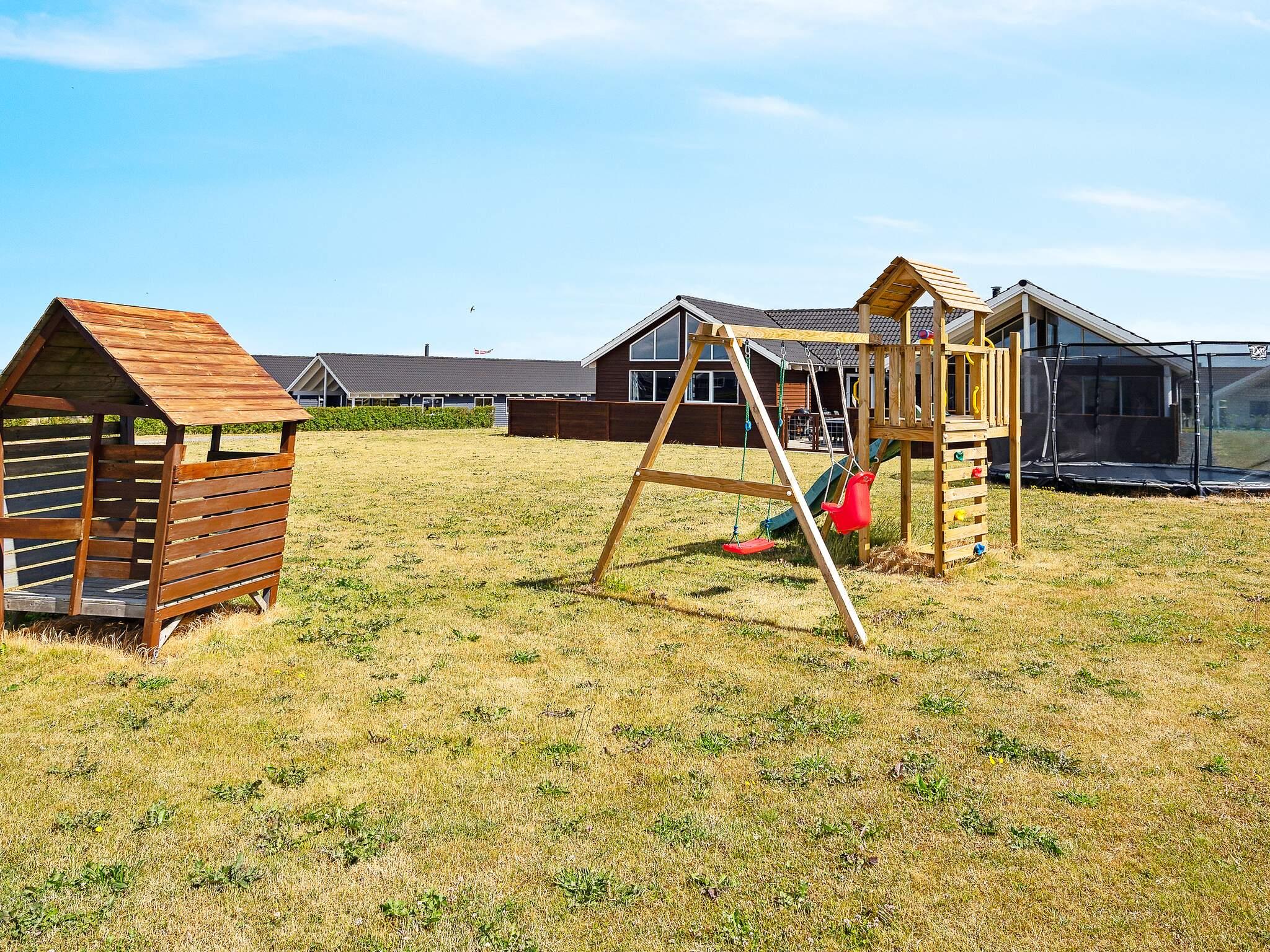 Haven er ideel til boldspil og leg, med trampolin (uden net) og gyngestativ.