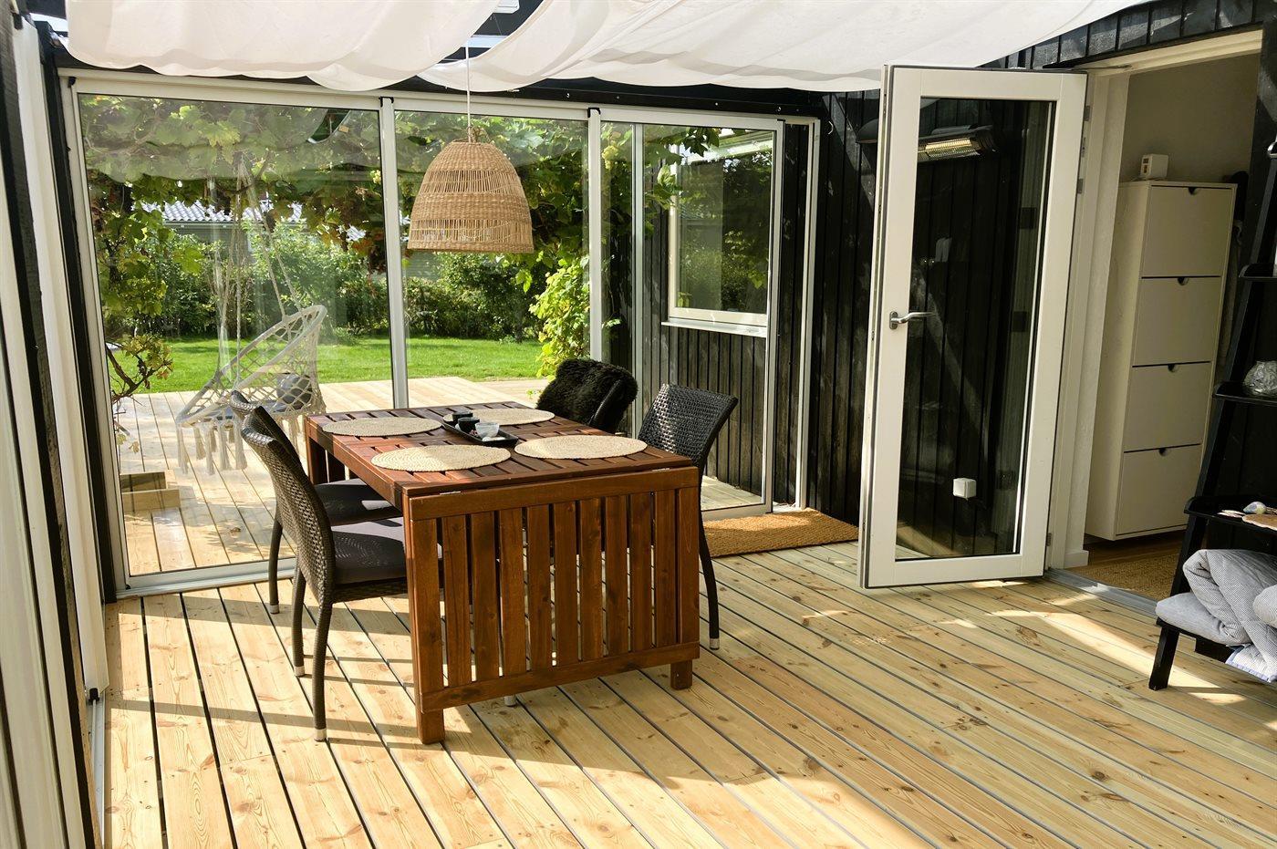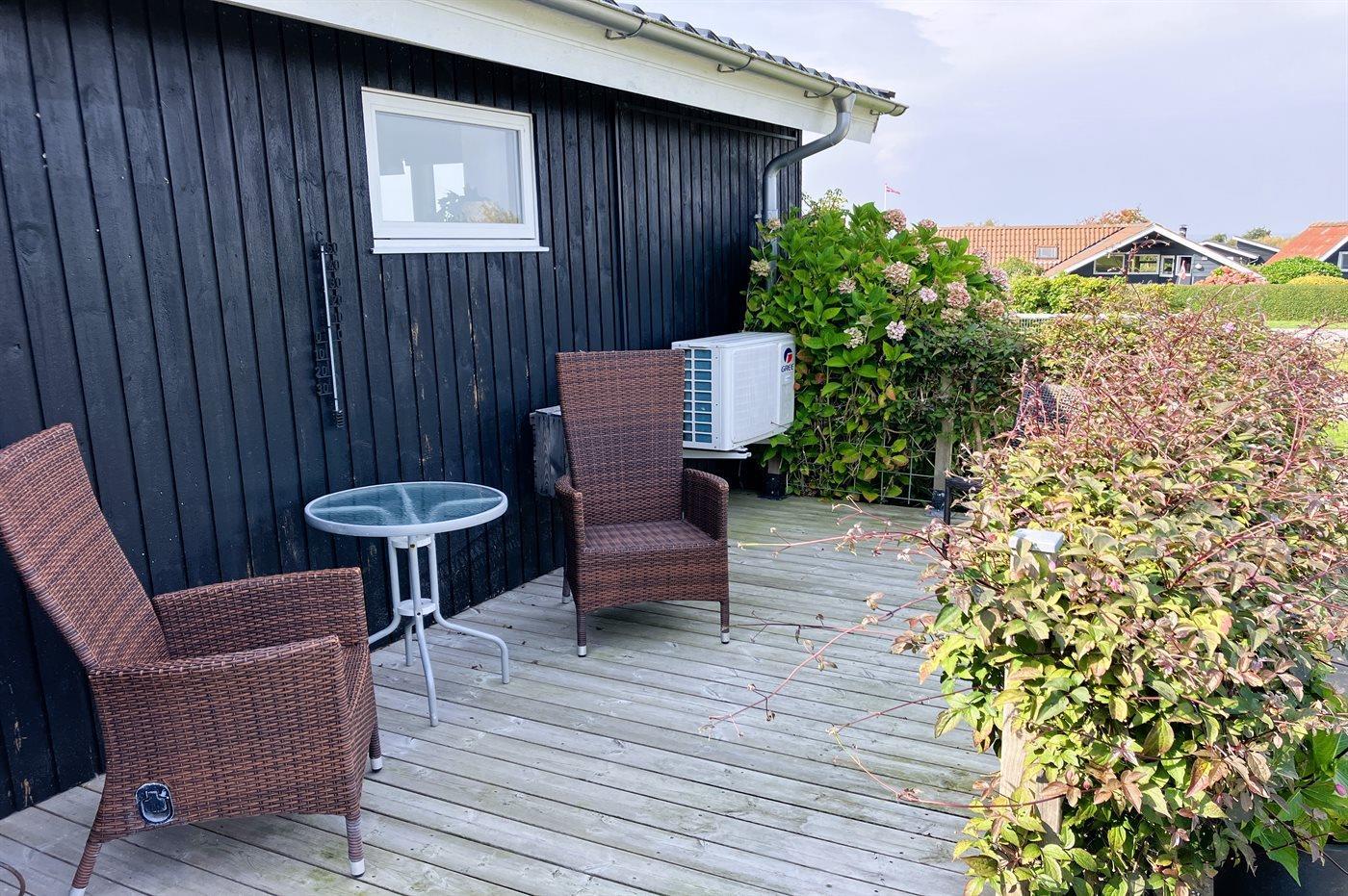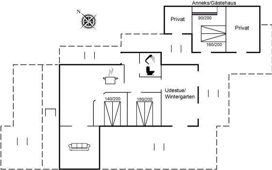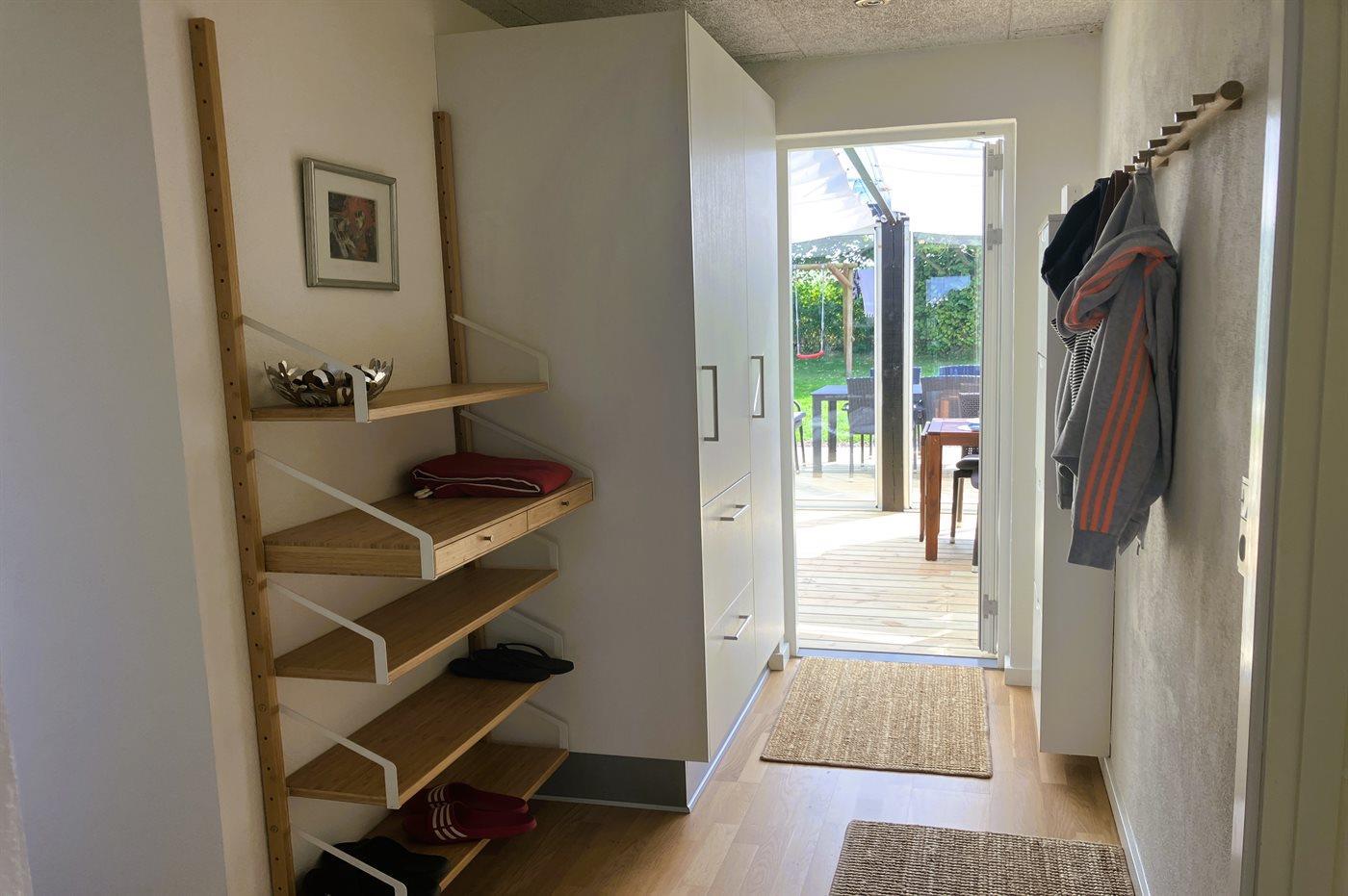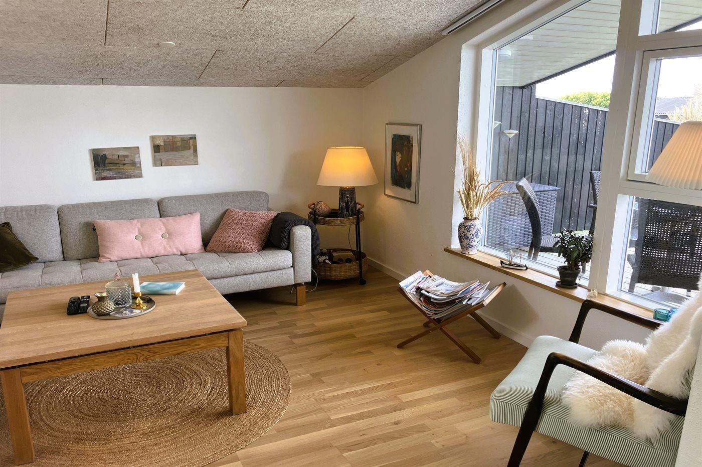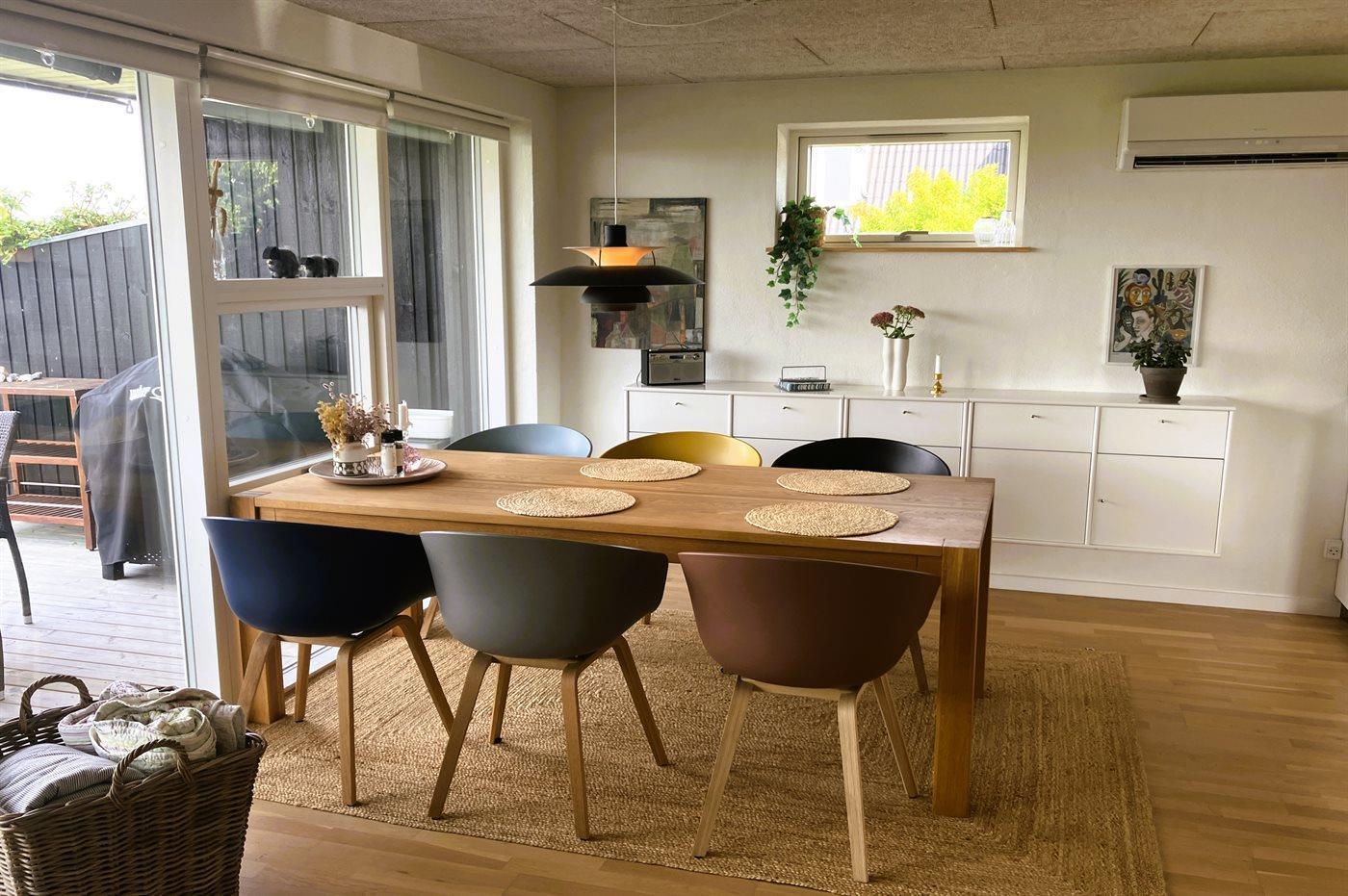 Huset er lyst indrettet og har en dejlig udestue, som ligger på husets bagside i forbindelse med den store, sydvendte terrasse. Her finder man også husets nyere anneks, som er indrettet med både dobbelt- og køjeseng. På den anden side af huset, ligger den anden delvist overdækkede og store terrasse, hvorfra der er udsigt ud over området og vandet.