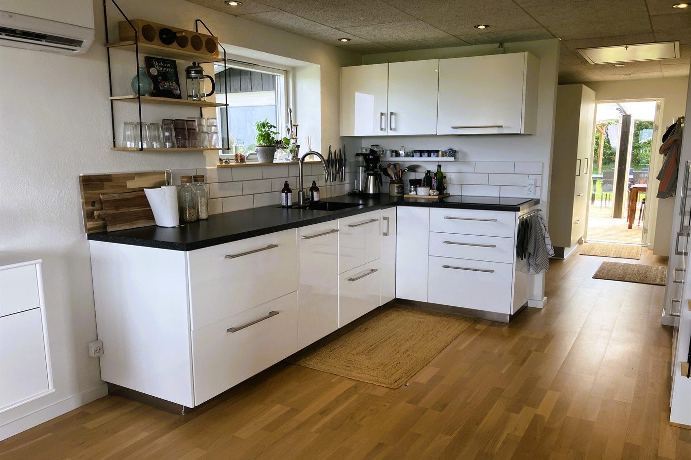 Køkkenet er udstyret med 1 køleskab. Der er 4 induktionskogeplader, varmluftovn, mikrobølgeovn samt opvaskemaskine.