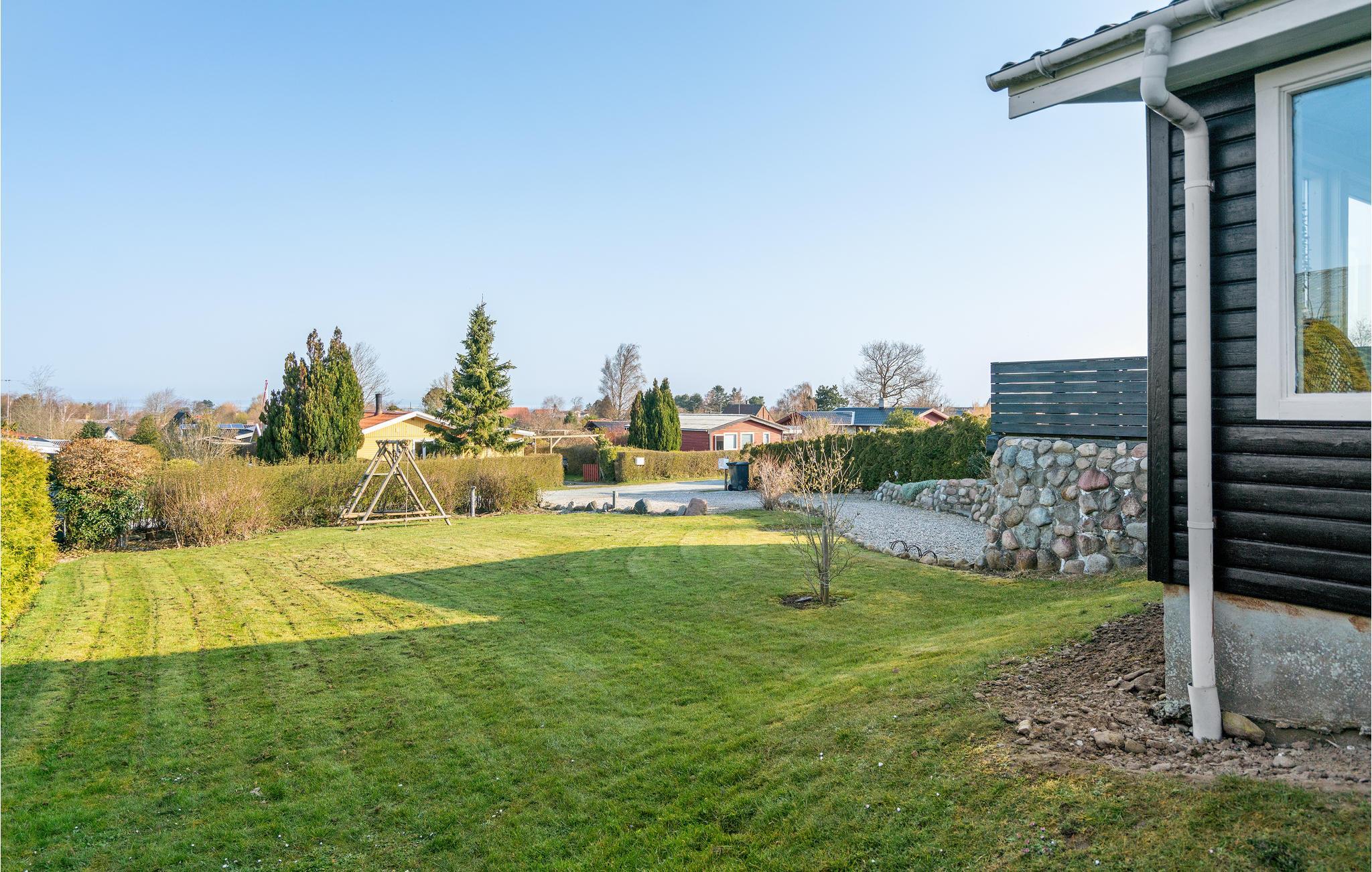 En kort gåtur fører ned til stranden, som er børnevenlig med lavt vand og masser af plads til at lege. Der er også en badebro.