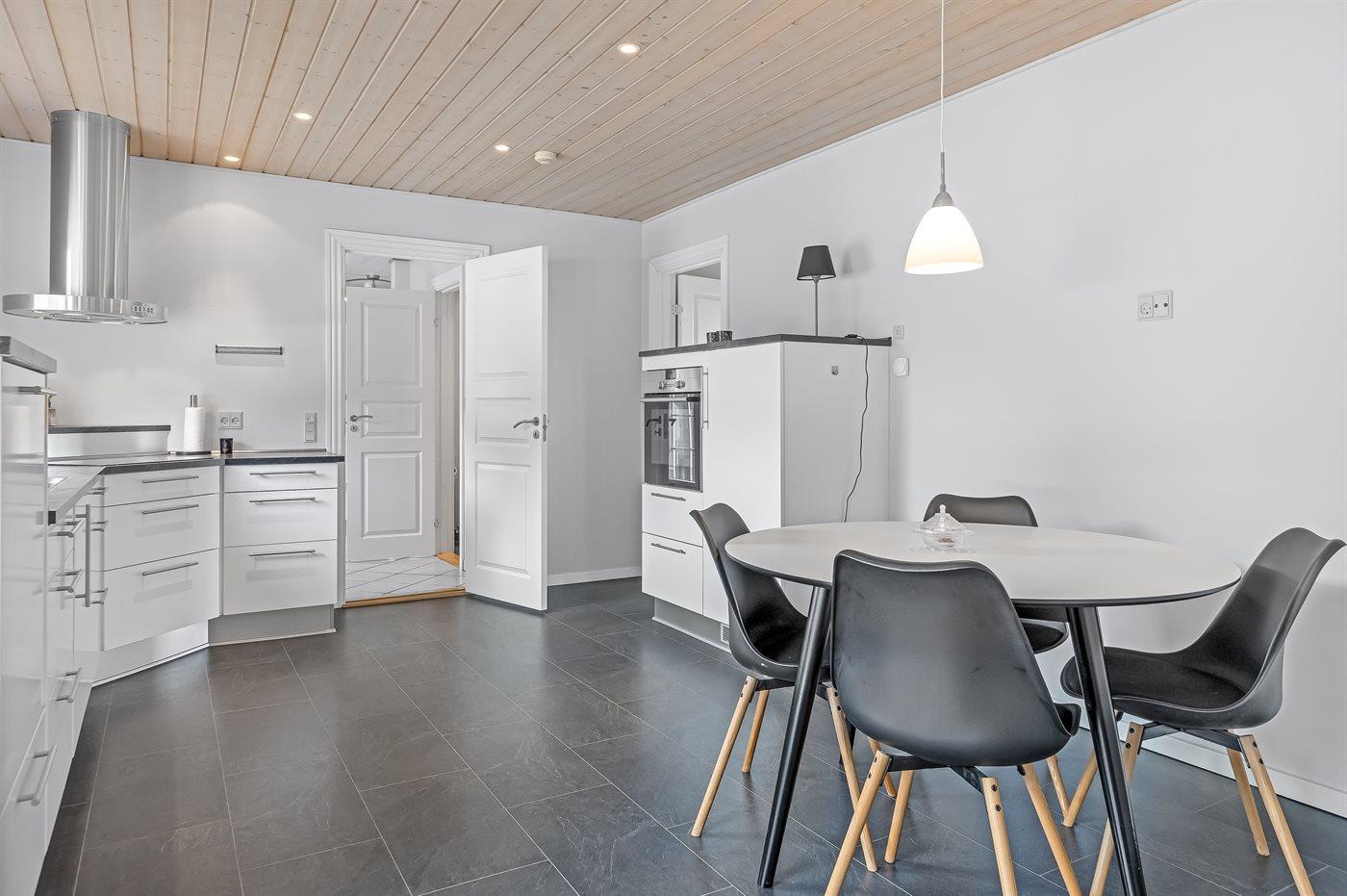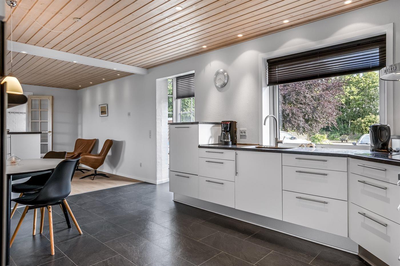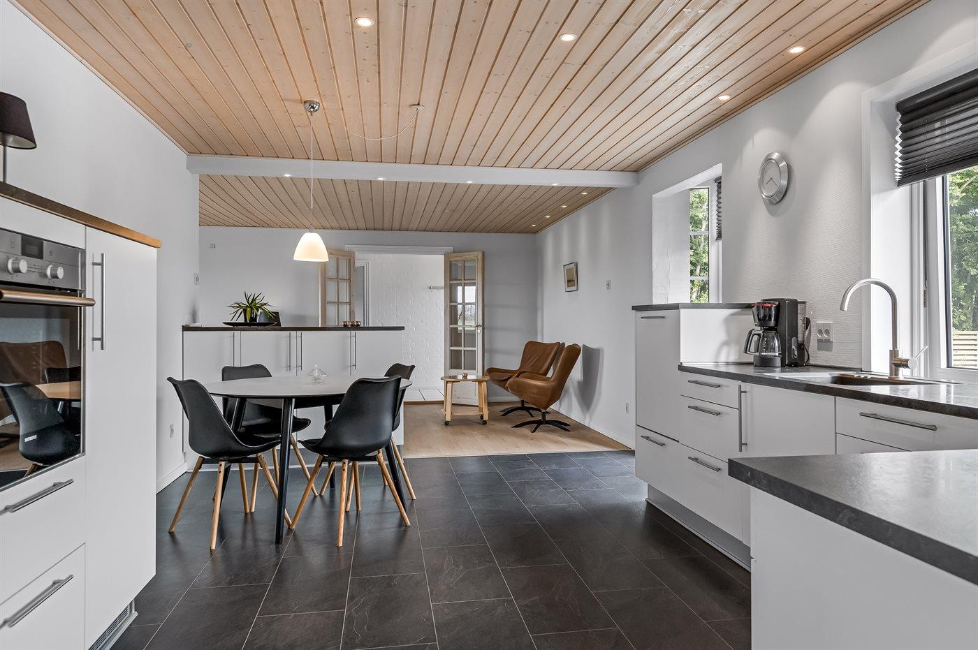Køkkenet er udstyret med 1 køleskab. Der er 4 keramiske kogeplader, varmluftovn samt opvaskemaskine.