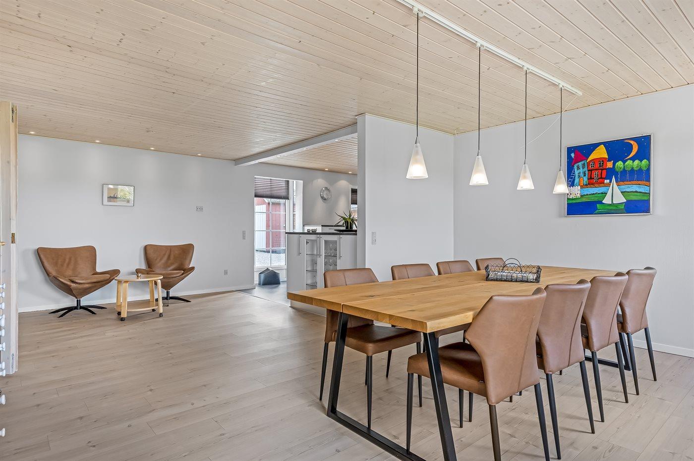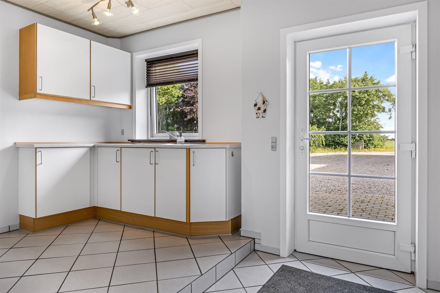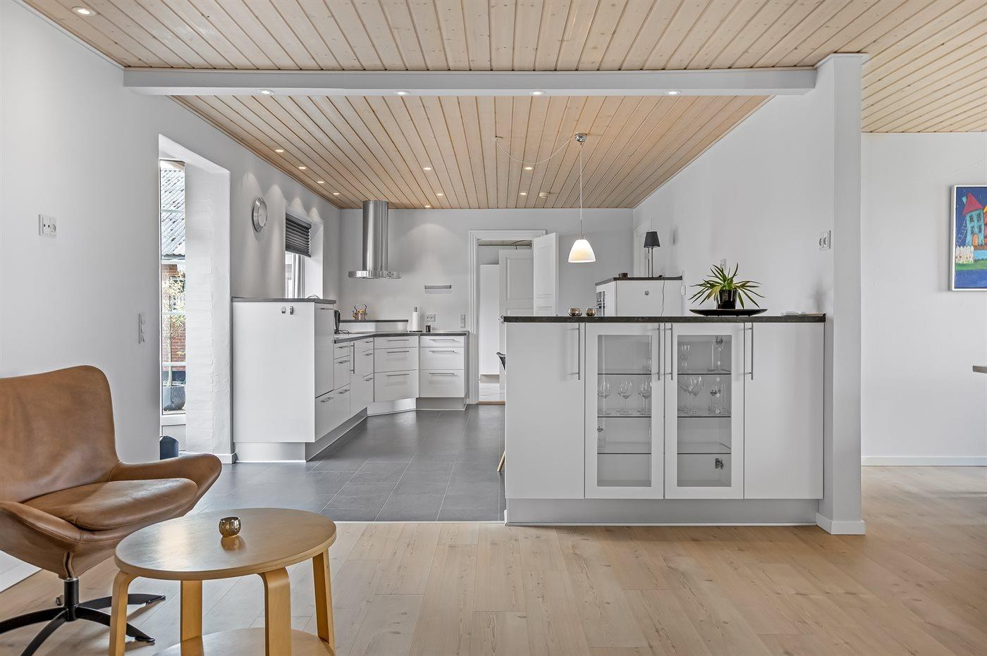 Køkkenet er udstyret med 1 køleskab. Der er 4 keramiske kogeplader, varmluftovn samt opvaskemaskine.
