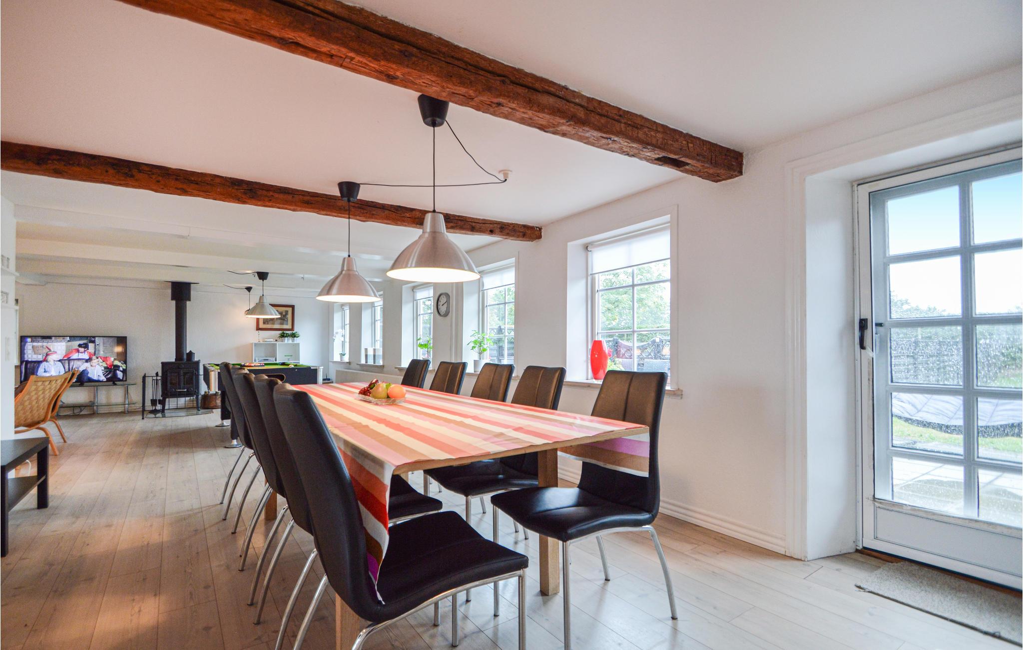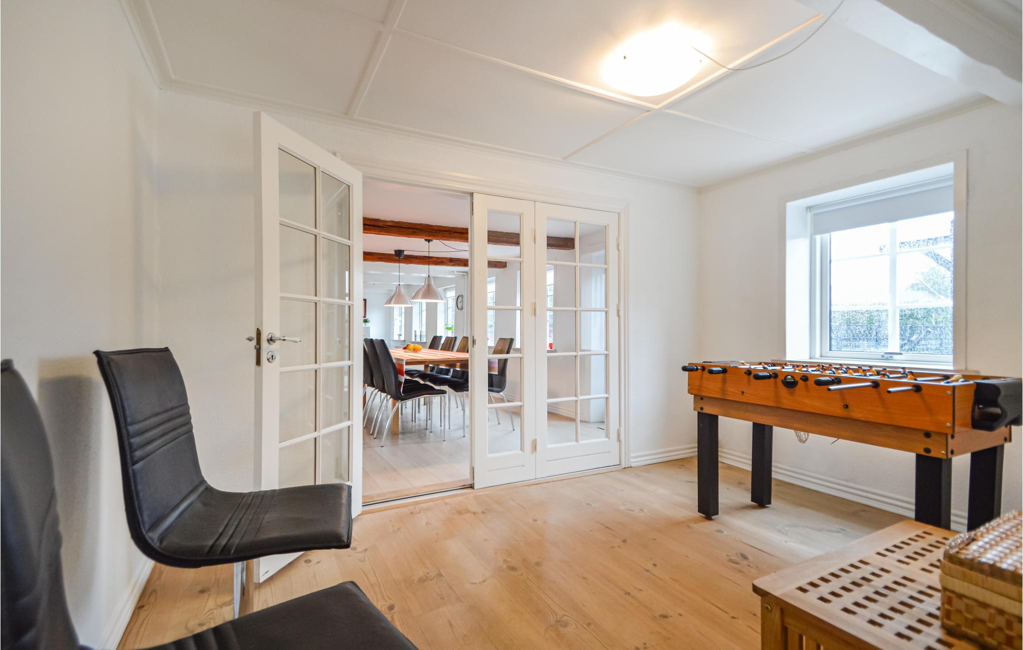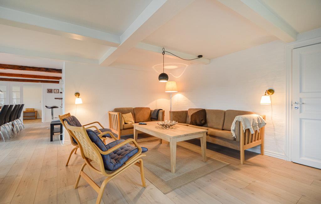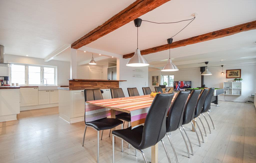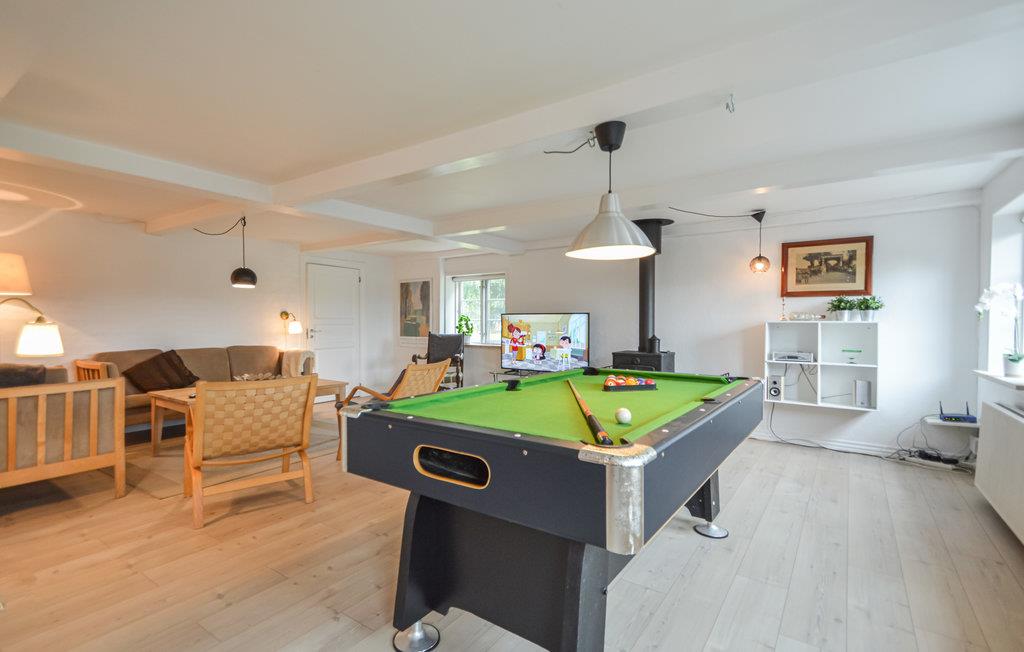 Ferieboligen fra 1740 er meget rummelig og charmerende, og de orginale, gamle bjælker er synlige i loftet. I huset findes seks gode soveværelser til i alt 12 personer - tre af værelserne er placeret på 1. sal, og har en lidt lavere loftshøjde. Fra køkkenet har I udsigt til markerne og direkte adgang til spisestuen og videre til opholdsstuen. I kan få flere timer til at gå i aktivitetsrummet, der indeholder både poolbord og bordfodbold.