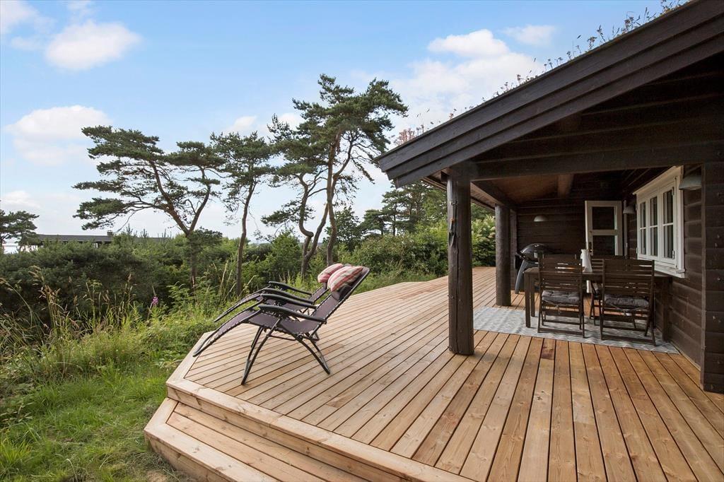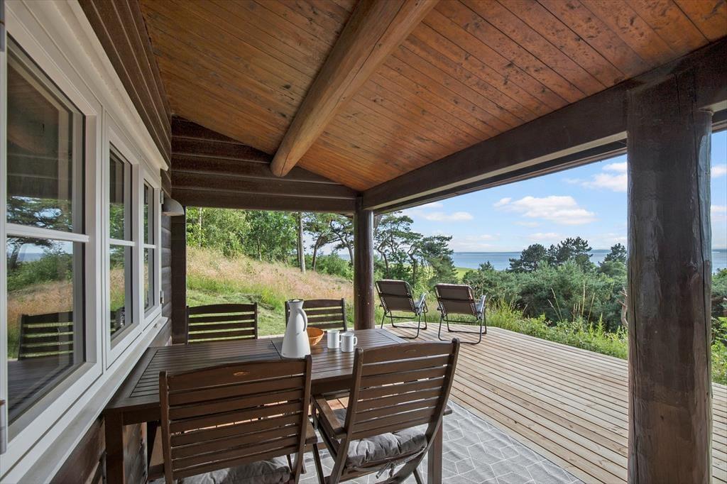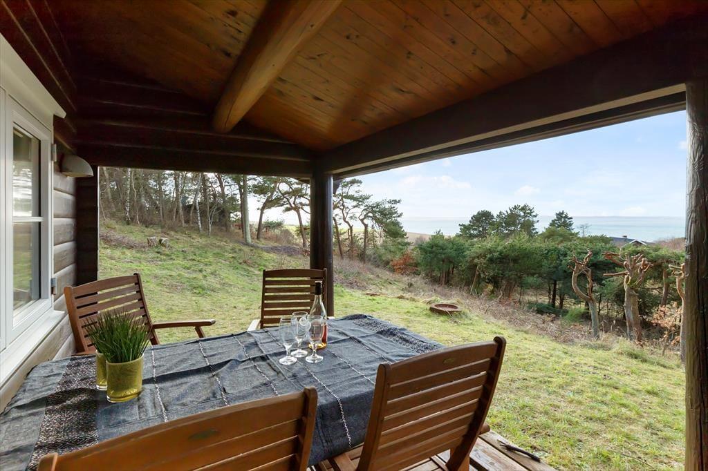 Huset ligger på en rolig vej højt på Skødshoved. Det er en dejlig grund med flot udsigt over Aarhus Bugten på et smukt bakket terræn, som dog kan være udfordrende for gæster med gangbesvær. Der kommer mange dådyr, fasaner og egeren forbi på grunden, så hvis der er tålmodighed til stede, er der også rig mulighed for at få unikke naturoplevelser med hjem fra ferien. Der er ca. 500 meter til badestrand med blåt flag og sandstrand, restaurant, iskiosk samt lystbådehavnen. En anden skøn mulighed er at sidde på den overdækkede terrasse og nyde naturen som ligger helt ugenert helt op til husets entredør. Huset byder på flere terrasser, så både morgen- såvel som aftensolen, kan nydes siddende udendørs eventuelt med en kop kaffe i hånden.