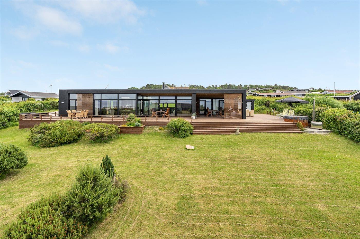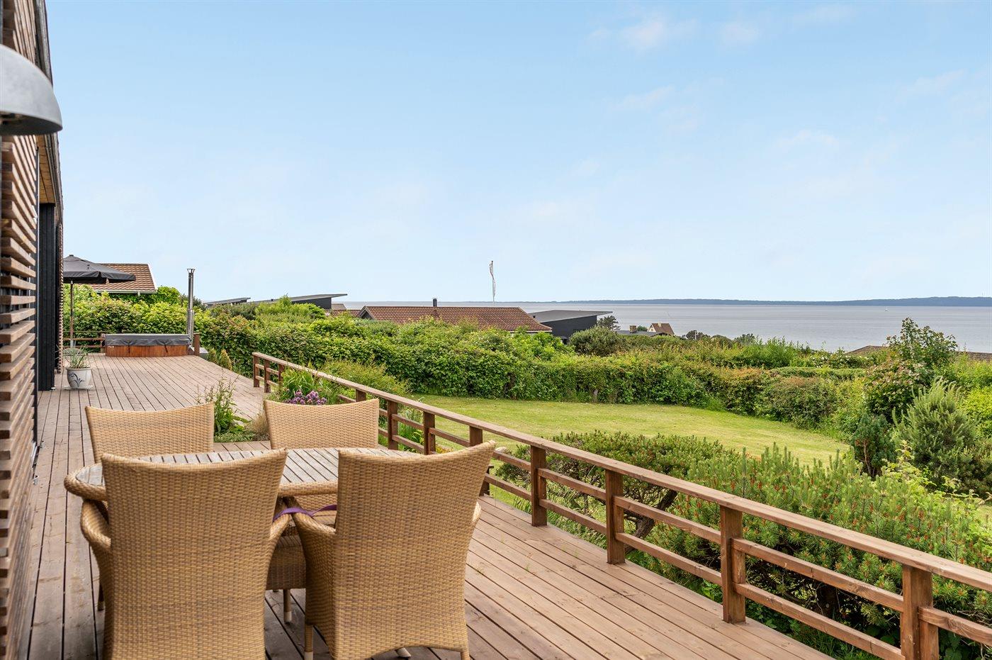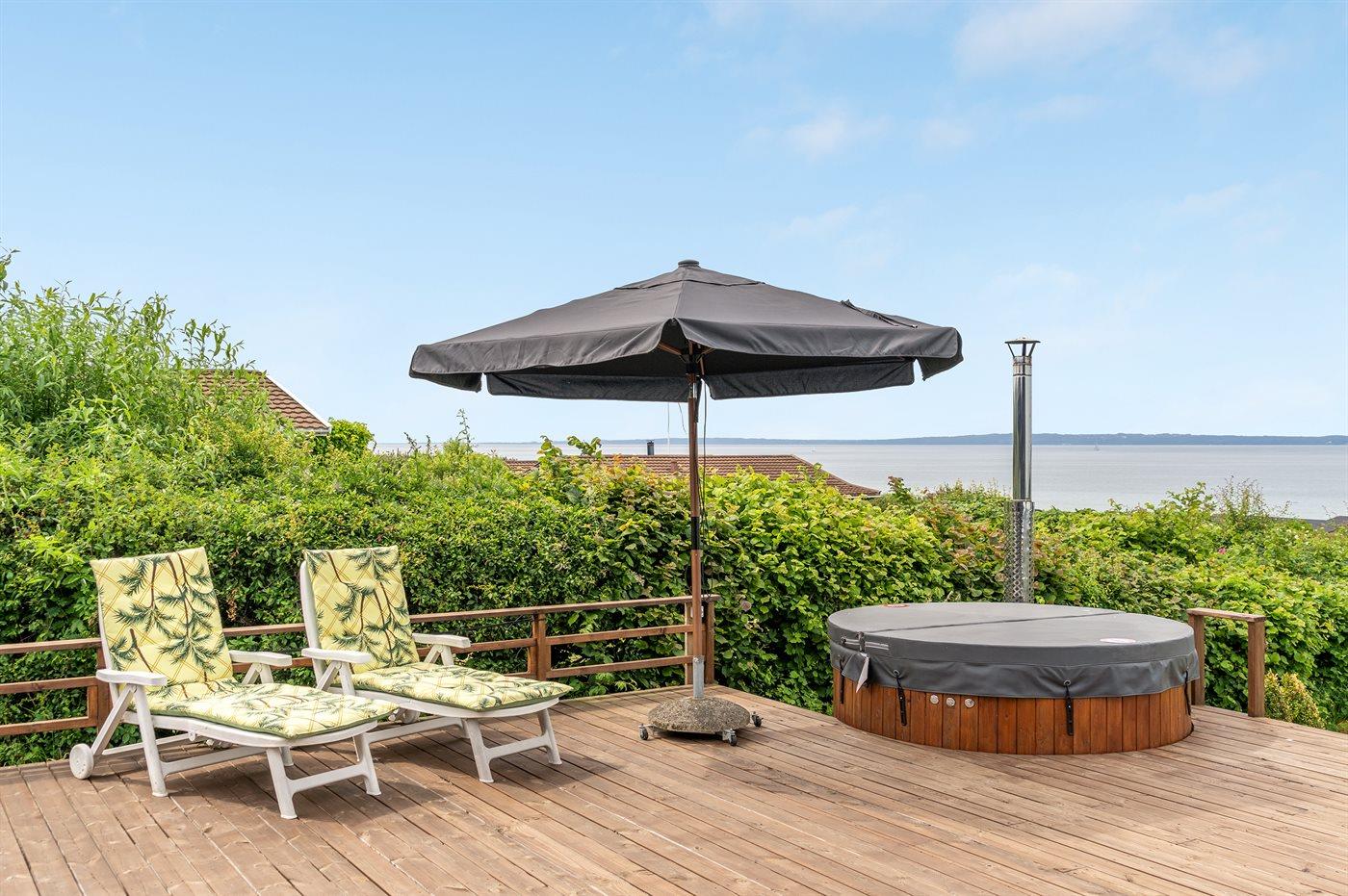 Nyere sommerhus med panoramaudsigt, tæt på strand og med vildmarksbad på overdækket terrasse.