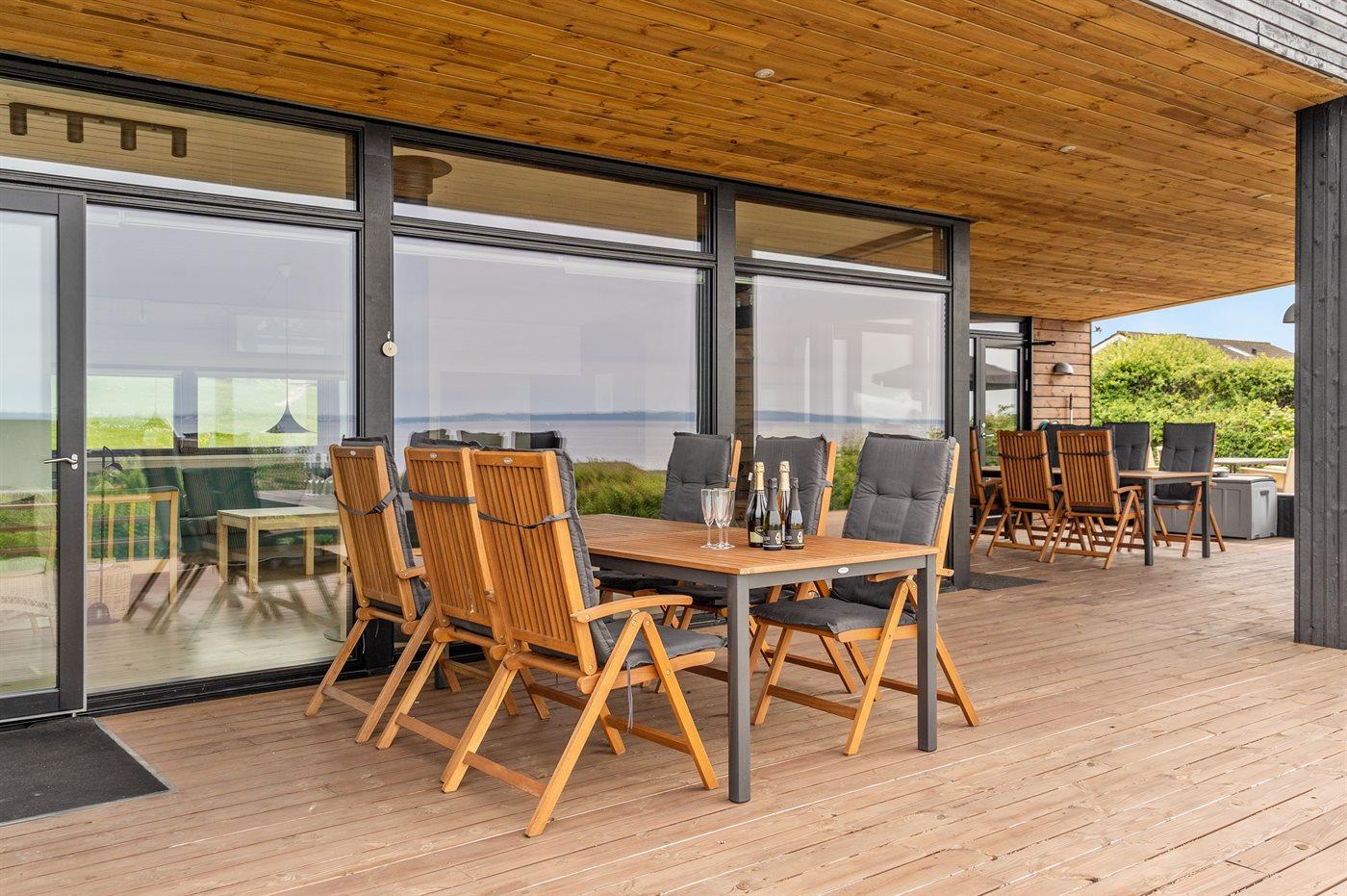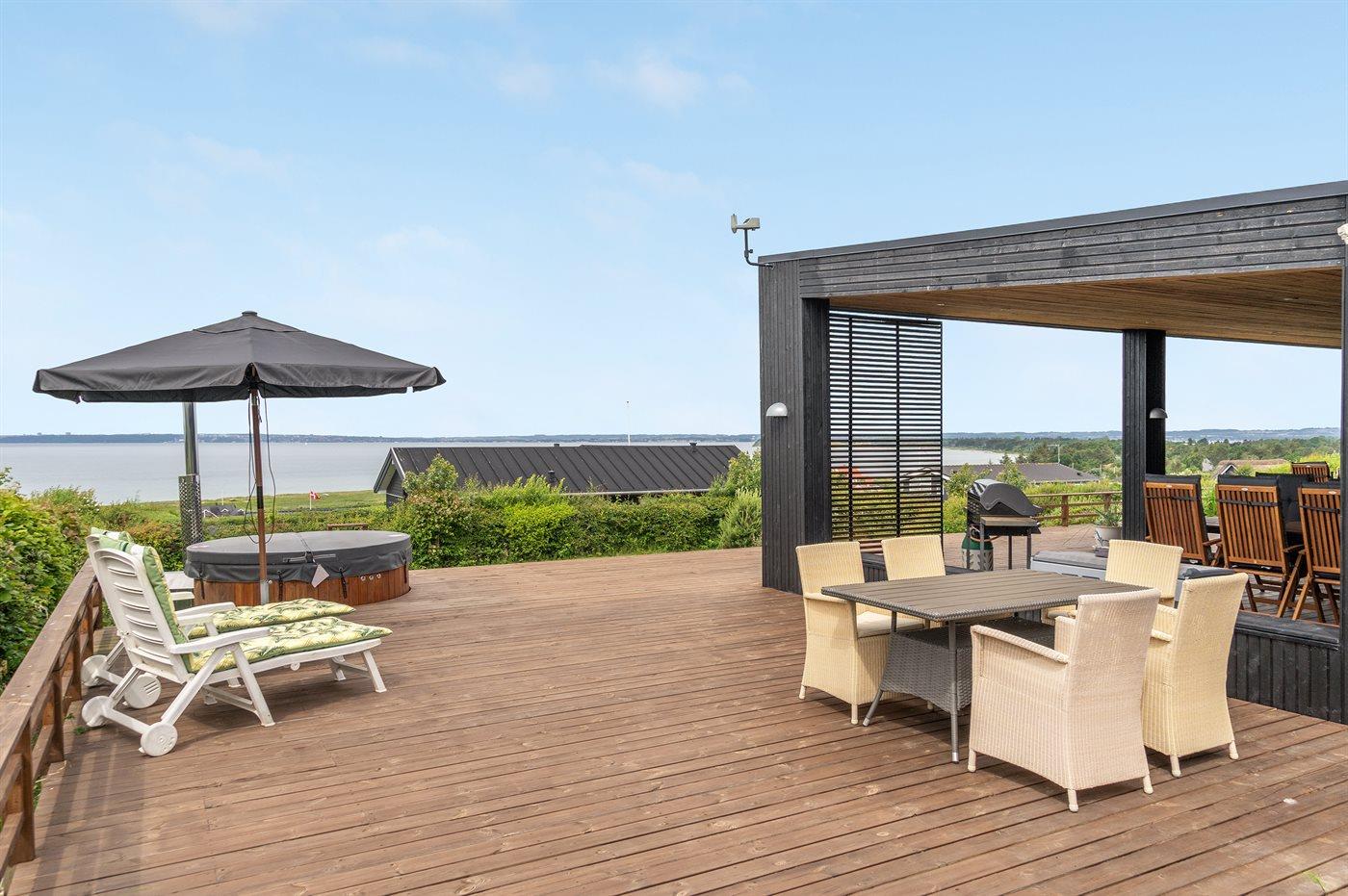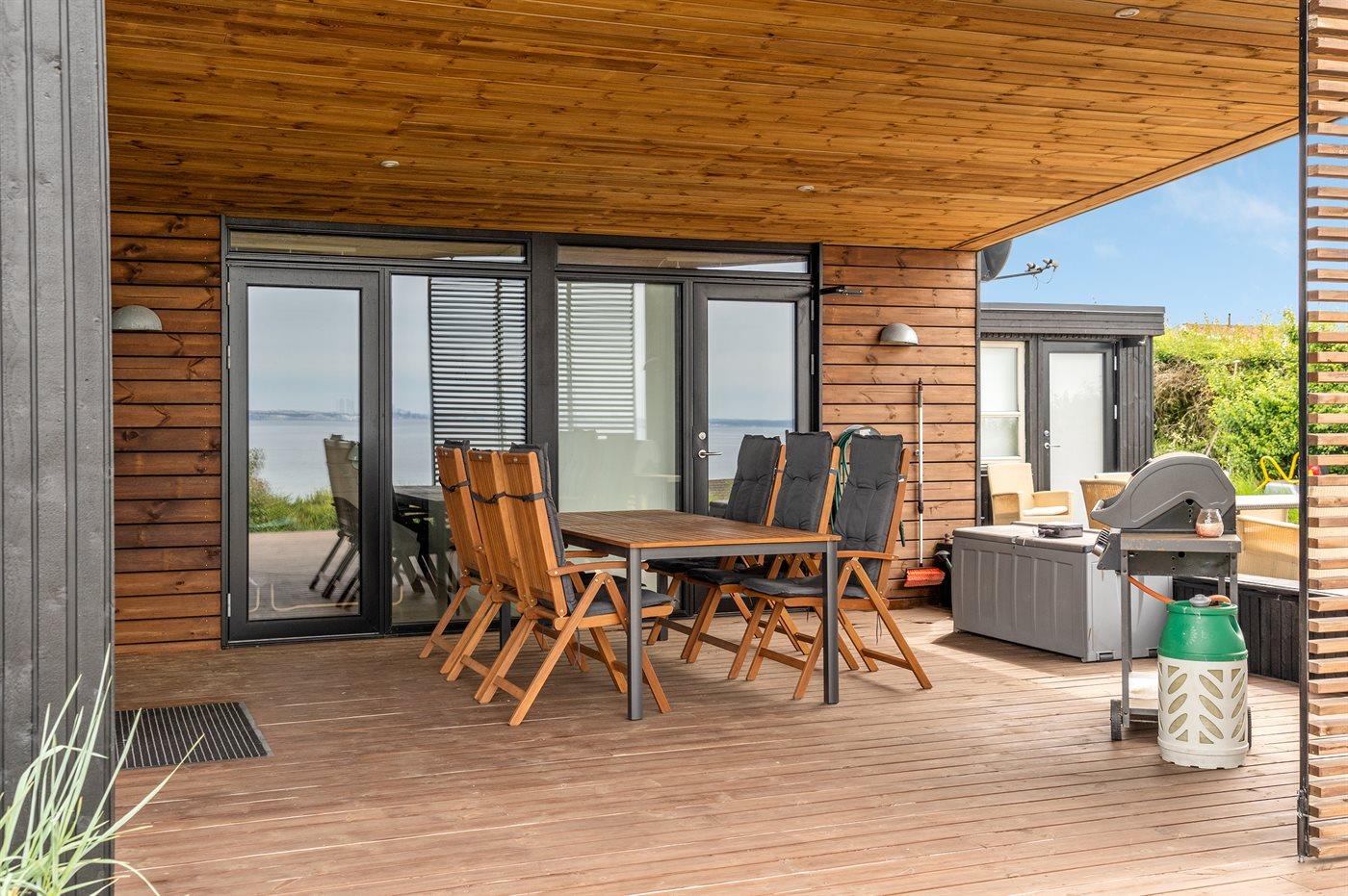 Nyere sommerhus med panoramaudsigt, tæt på strand og med vildmarksbad på overdækket terrasse.