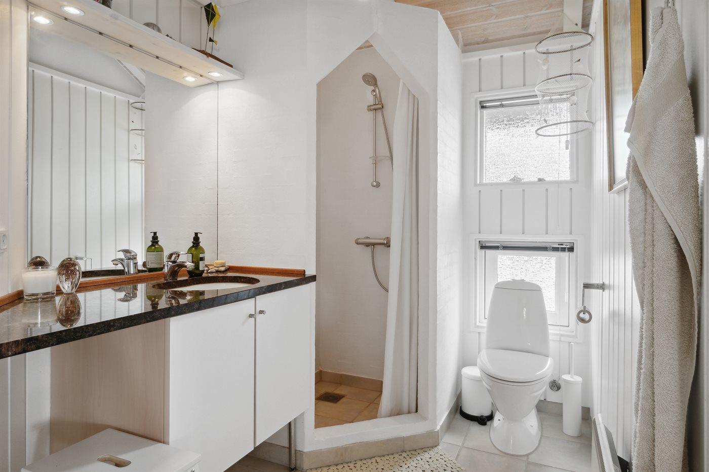 Der er 2 badeværelser med bruseniche og 2 toiletter. Der er gulvvarme på 2 badeværelser. I saunaen er der mulighed for afslapning.