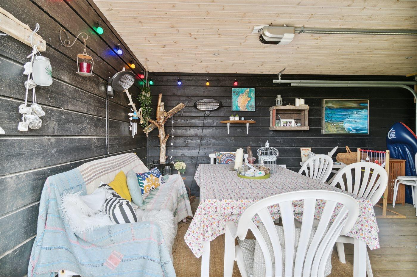 Gården er rummelig og giver plads til parkering. Derudover er den tidligere garage omdannet til en slags udestue, hvor man kan sidde længe om aftenen, eller når man skulle have fået nok af den dejlige havluft på terrassen.